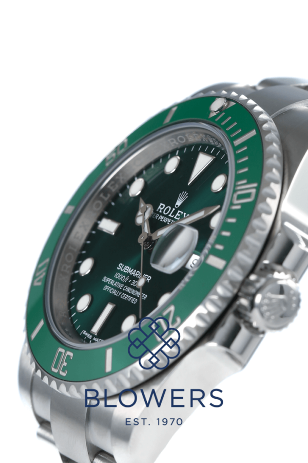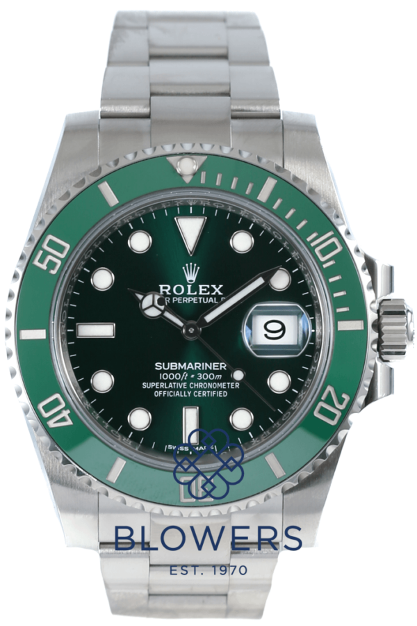 Rolex Oyster Perpetual Submariner Date 116610LV ‘ The Hulk’ , now discontinued. 40mm steel case, which is water resistant to 300 meters. Automatic chronometer