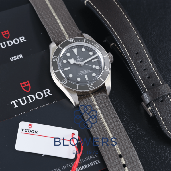 Tudor Heritage Black Bay Fifty Eight 79010SG-0001. Automatic MT5400 calibre movement with an open sapphire crystal case back. 39mm 925 silver case, with a screw down crown. A water resistance of up to 200m, with an approximate power reserve of 70 hours. Unidirectional bezel with a 60 minute disc, with silver Arabic numerals. Taupe dial with white, luminescent hour markers. Brown leather strap (and NATO style nylon strap) with white contrast stitching, 925 silver buckle. Unworn, box and papers dated November 2022. (RRP £4,000)