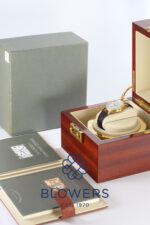 Lange & Sohne Grosse Langematik Gangreserve 304.048 Limited Edition 78/100. Movement No: 50230. Yellow Gold Case 40.5mm. Automatic calibre, 42 jewels. Power Reserve of 48hours. Black Roman numeral watch markers with blued feuille hands. Slim self-winding ‘Sax-O-Mat’ movement visible through the see-through case back. Brown Alligator strap with a 18K yellow gold Lange & Sohne pin buckle. Comes with an additional Lange & Sohne Black Alligator strap. Box and Papers November 2006.