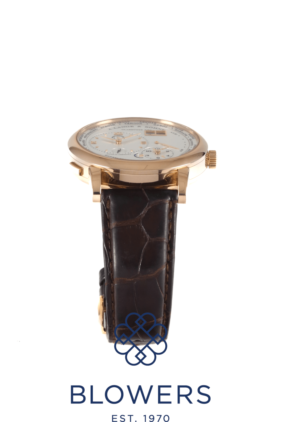 A. Lange & Söhne Lange 1 Time Zone 116.032. 18ct yellow gold 41.9mm diameter case with sapphire crystal exhibition case back, water resistant up to 30 metres. Manually wound manufacture calibre L031.1 movement, finished to A. Lange & Söhne’s signature Glashütte standards, with a 72-hour power reserve. Silver-coloured dial with asymmetric layout, featuring a dual time-zone display with rotating city ring, secondary time sub-dial, and day/night indicators for both home and local time. Iconic oversized date display positioned at 1 o’clock. Power reserve indicator at 3 o’clock. Scratch-resistant sapphire crystal glass. Fitted to a hand-stitched dark brown crocodile leather strap with yellow gold pin buckle. Box and papers dated February 2013.