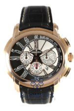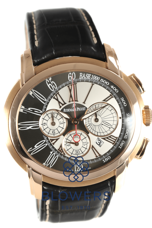 Audemars Piguet Millenary Chronograph 26145OR.OO.D093CR.01. 47mm rose gold casing, which is water resistant to 20 meters. Surrounded by a rose gold bezel, the brown dial features applied rose gold Roman numeral hour markers. Features the base 1000 scale. Automatic caliber 2385 movement with a 40 hour power reserve. Luminescent hands. With a date display positioned between 4 and 5 o’clock. With central red chronograph hand, the silver off centre guilloche disc features three sub-dials displaying – 12 hours, 60 seconds and 30 minutes. Upon a brown crocodile leather strap with a rose gold folding clasp. Box and papers dated January 2015.
