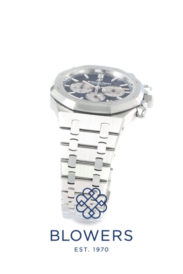 Audemars Piguet Royal Oak 26331ST.OO.1220ST.01. Automatic chronograph caliber AP 2385 movement. Steel 41mm case which is water resistant to 50 meters. Blue dial decorated with ‘Grande Tapisserie’ pattern, silver sub-dials, date display between 4 and 5 o’clock position. Brushed and polished steel bezel with eight hexagonal recessed nuts, fastening the eight screws through the case back. Steel bracelet with folding clasp. Box and papers dated 2020.