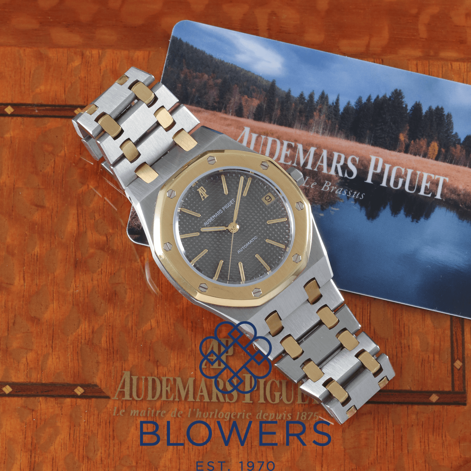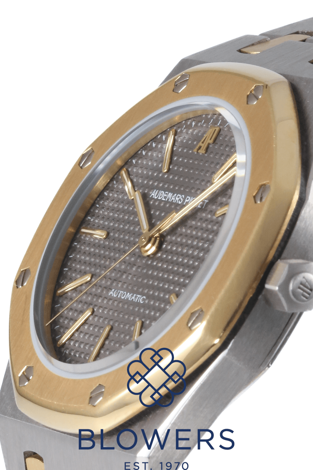 Audemars Piguet Royal Oak 4100SA. Automatic AP Calibre 2123 movement. 36mm Stainless Steel and yellow gold case. Grey dial dial with “Petite Tapisserie” pattern, with applied hour-markers and Royal Oak hands with luminescent coating. Date window at the 3 o’clock position. Steel and yellow gold bracelet with AP double folding clasp. Audemars Piguet Service Papers dated October 2022. Box and Extract from the archives dated October 2021 detailing the watch registered in April 1981.