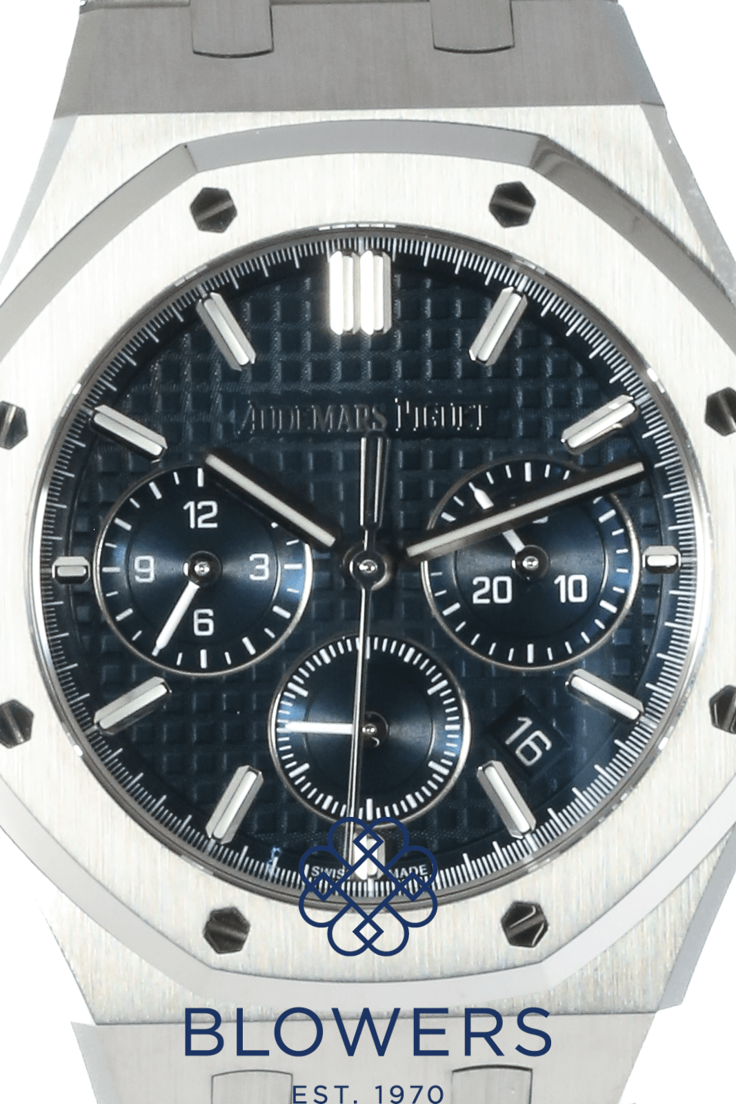 Audemars Piguet Royal Oak Chronograph 26715ST.OO.1356ST.01. 38mm Steel Case. Selfwinding Calibre 2385 Movement. Water Resistant to 50 Meters. Functions: Chronograph, hours, minutes, small seconds and date. 40 Hour Power Reserve. “Bleu nuit nuage 50” dial with “Grande Tapisserie” pattern, “Bleu nuit nuage 50” counters, white gold applied hour-markers and Royal Oak hands with luminescent coating. Stainless steel bracelet with AP folding clasp. Box and Papers Dated December 2025.