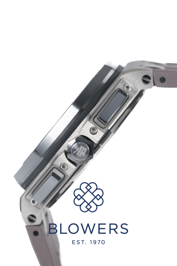 Audemars Piguet Royal Oak Offshore Chronograph 26400IO.OO.A004CA.01. 44mm titanium case, housing the automatic chronograph calibre AP 3126/3840 movement. An exhibition window upon the case-back to view the movement. Featuring a slate-grey dial with the iconic tapisserie pattern, and luminous coated applied hour markers. White gold Royal Oak hands with luminescent coating. Including a central, chronograph hand, the dial also displays three silver sub-dials with red accented hands : a small seconds counter, a 30 minutes counter, and a 12 hour counter. Surrounded by a black ceramic octagonal bezel, with eight screws, the inner bezel ring features the Base 1000 scale. AP grey rubber strap, with a pin buckle. Box and papers 2019 although original guarantee card had been misplaced by the original owner, it was serviced 2021 and comes with additional AP service 2024 under AP guarantee until 2026.