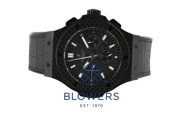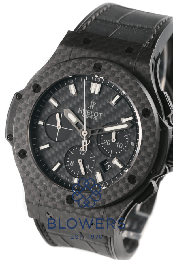 Hublot Big Bang Carbon Chronograph 301.QX.1724.RX. 44m Carbon fibre case. Automatic Hublot HUB4104 Self-Winding Chronograph Movement. Water resistant to 100 meters. Matt Carbon Faber Dial. Satin-finished Ruthenium-Plated Appliques and Hands with White Luminescent. Sapphire crystal with Anti-reflective treatment. Carbon Fibre bezel with 6 H-shaped Black PVD Titanium Screws. Black Rubber Strap with Black PVD Stainless Steel Deployment Clasp. Box and papers dated 2018. Comes with two year guarantee.