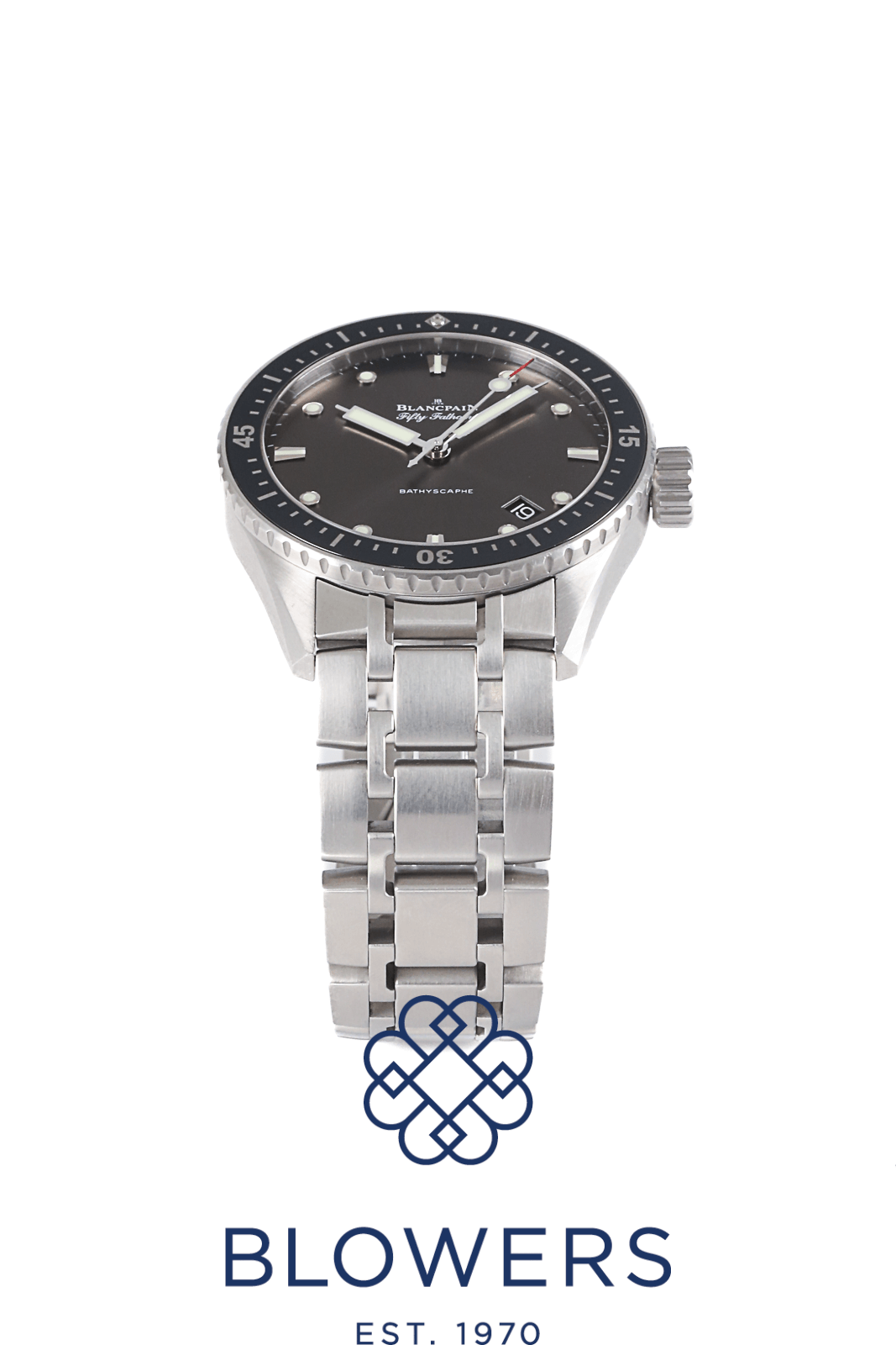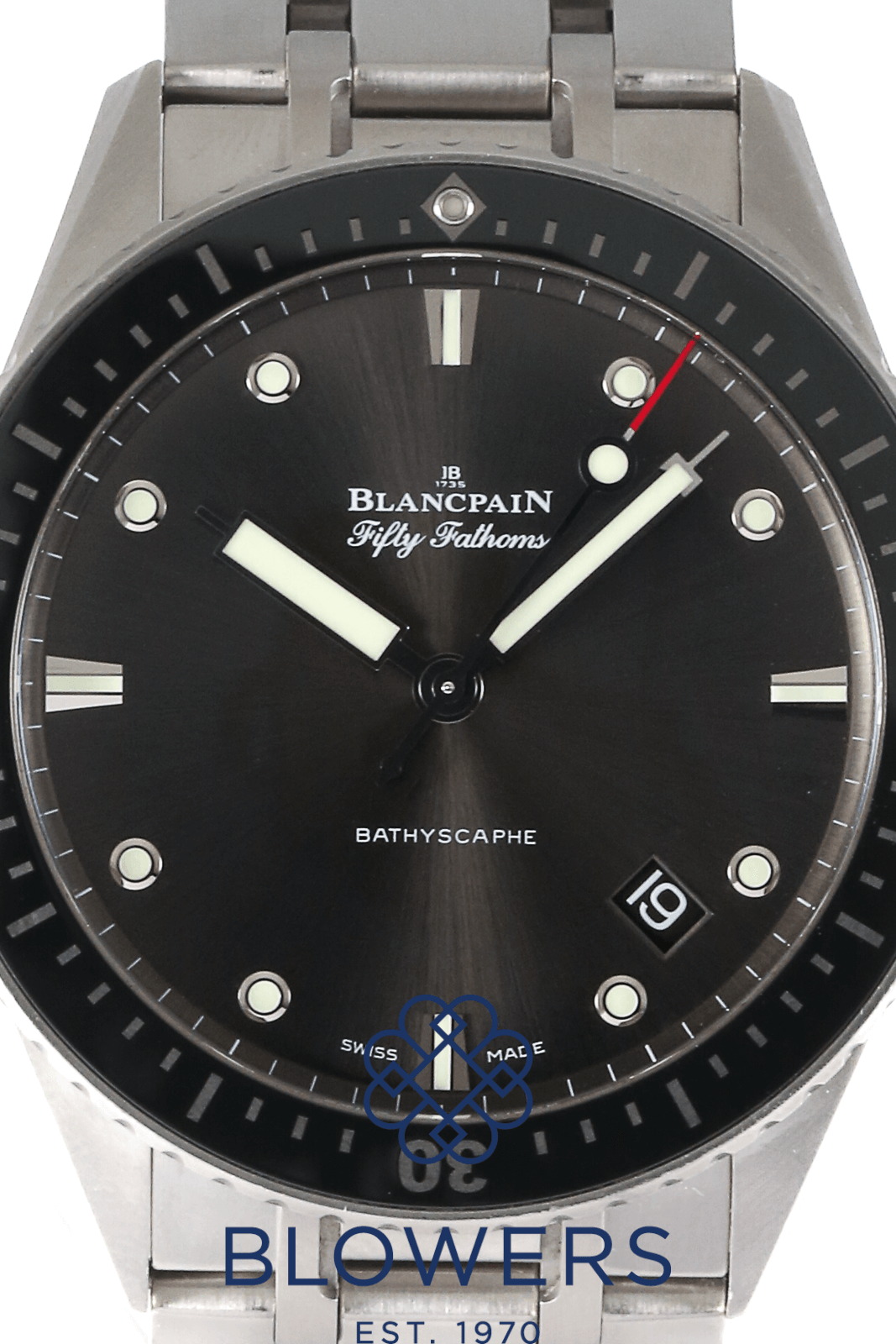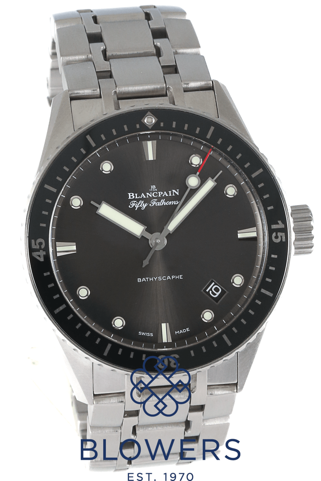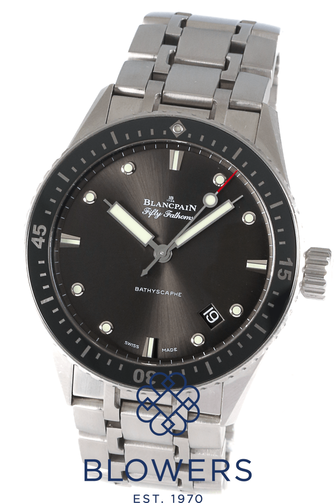 Blancpain Fifty Fathoms Bathyscaph 5000-1110-70B. 43mm diameter satin brushed steel case. Automatic Blancpain caliber 1315 movement of 35 jewels with protection from antimagnetic fields. 227 components. Meteor grey dial with luminous index hour markers and hands. Uni-directional satin-brushed steel bezel with ceramic insert and liquid-metal hour markers. A date window between the 4 and 5 o’clock position. Satin brushed steel bracelet with a double folding clasp. Box and papers dated April 2016.