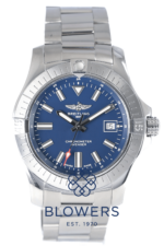 Breitling Avenger Automatic A17318. Steel 43mm casing, with a screw down crown, and a water resistance of up to 300m. Automatic self winding mechanical movement, with a power reserve of approximately 38 hours. Stainless steel unidirectional rugged bezel, with Arabic numerals at the 15,30 and 45 minute markers. Navy blue dial with white luminous hour markers outlined in silver. Silver hands with white luminescent markers. Hours, minutes and seconds hands, with the seconds hand featuring a red embossed tip. Date function at the 3 o’ clock position. Steel bracelet, with the Breitling logo engraved upon the clasp. Box and papers dated 2023.