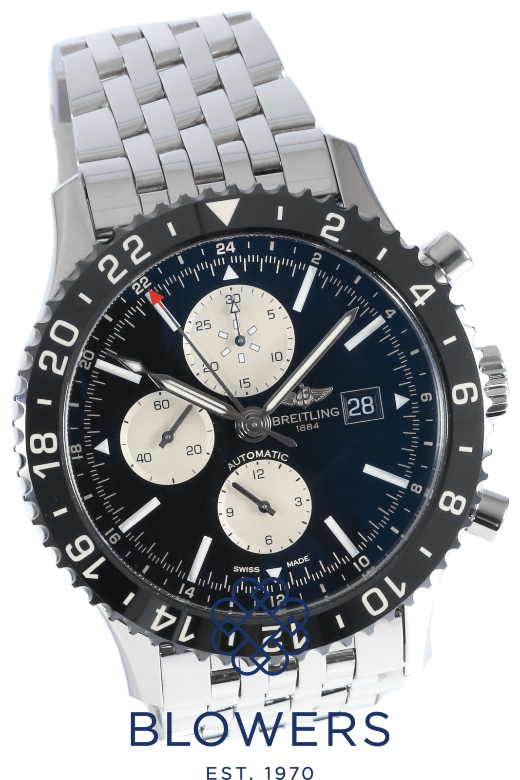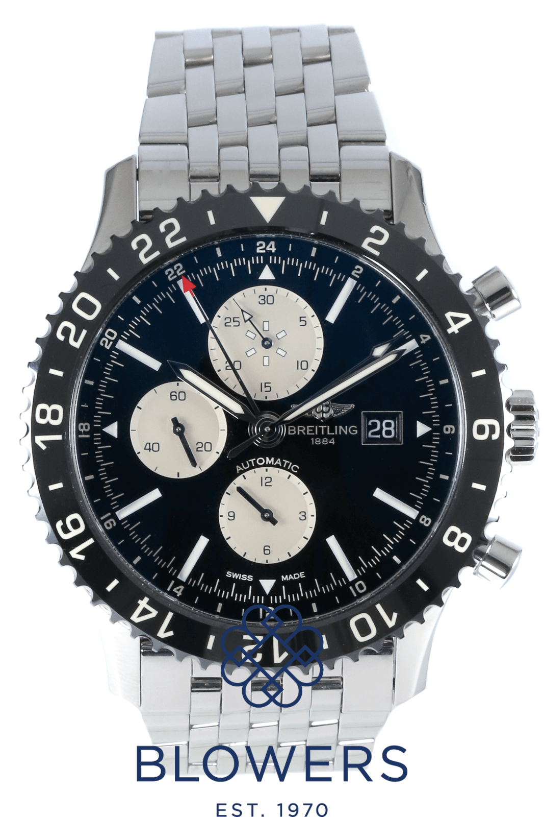Breitling Chronoliner Chronograph Y2431012. 46mm Steel Case. Automatic Movement. Black Dial with Silver Sub Dials and Index Hour Markers. Red Tipped GMT Hand. Date Window Located At The 3 O’clock Position. Black Ceramic Rotating Bezel. Sapphire crystal. Steel Bracelet With A Folding Clasp. Box and Papers Dated August 2016.
