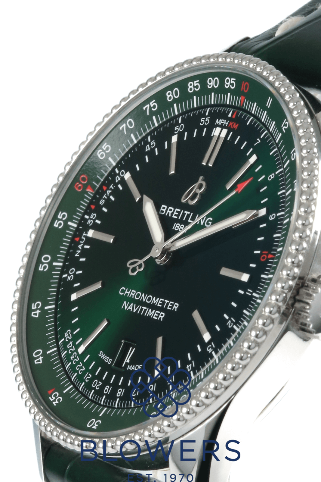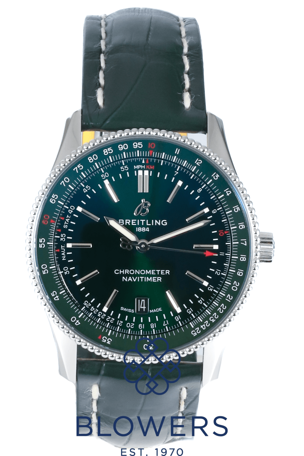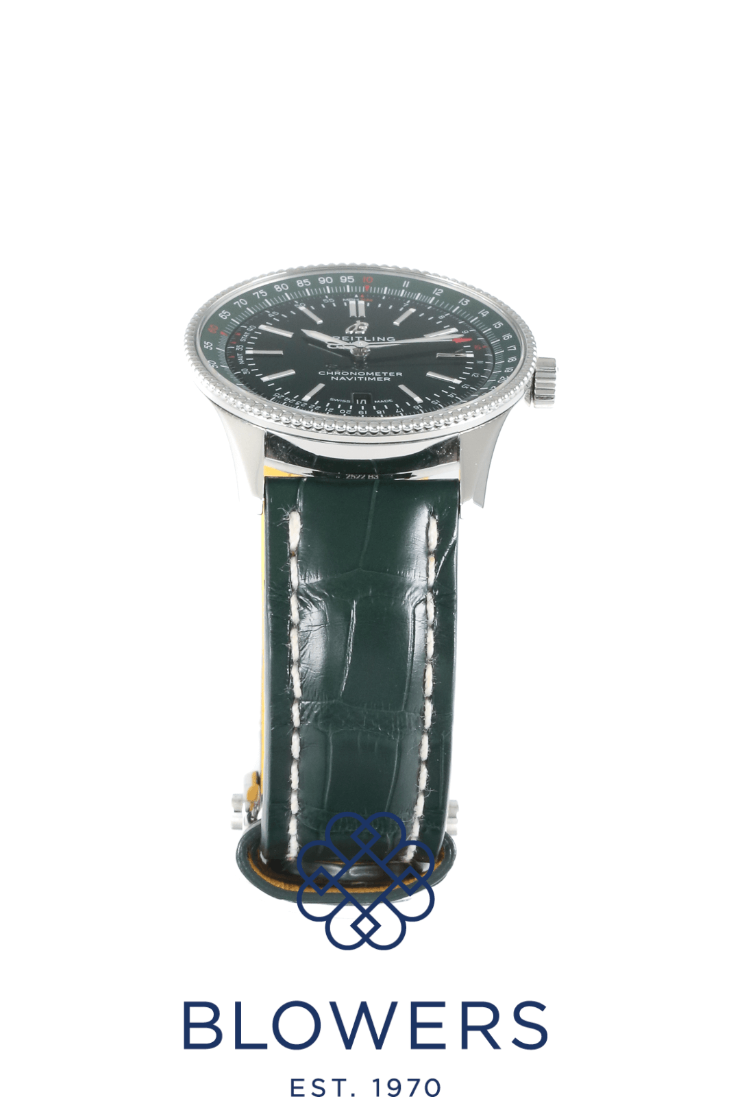 Breitling Navitimer A17326. Stainless steel 41mm diameter case with bidirectional beaded slide rule bezel. Water resistant up to 30 metres (3 ATM). Self winding chronometer certified Breitling calibre 17 automatic movement with an approximate 38 hour power reserve. Green dial with white logarithmic slide rule scale and luminescent baton hour markers and hands. Central hours, minutes and seconds hands. Date window located at the 6 o’clock position. Scratch resistant domed sapphire crystal glass. Green crocodile leather strap with folding clasp. Box and papers dated April 2023. Under Brietling gaurentee until April 2028.