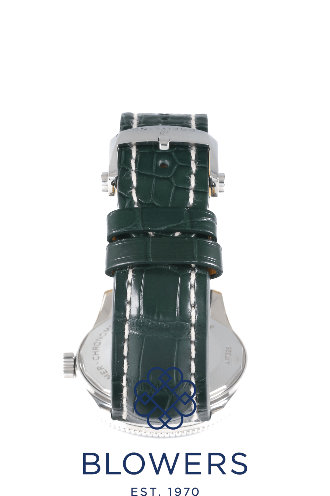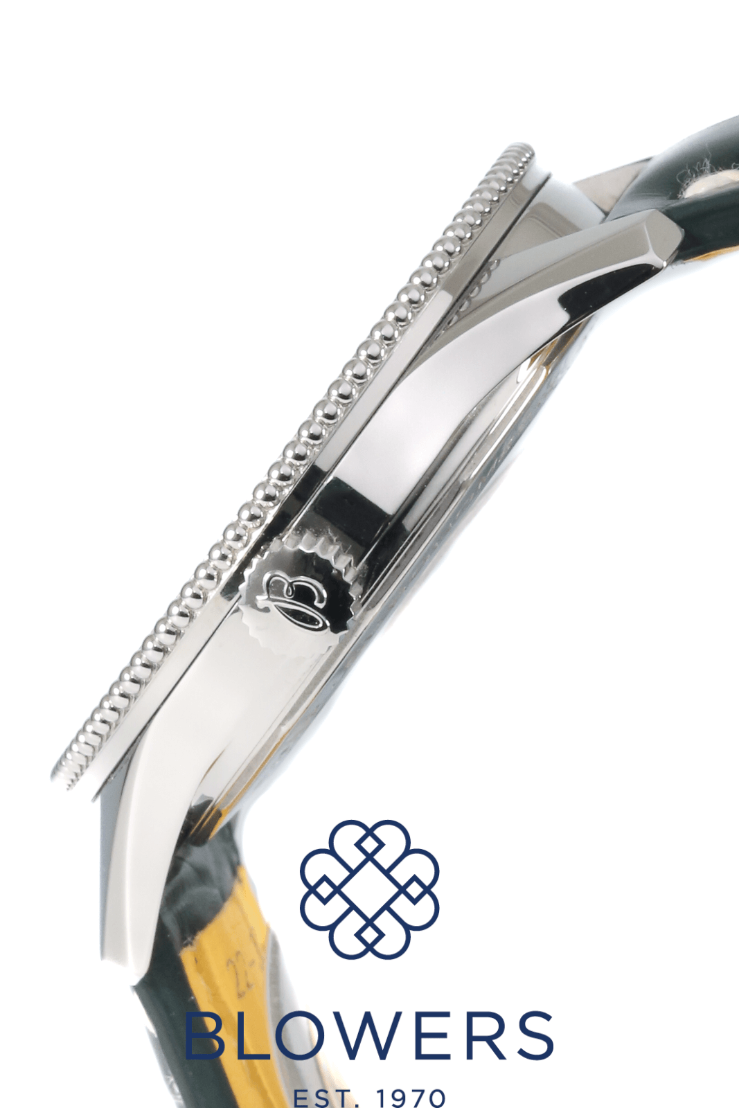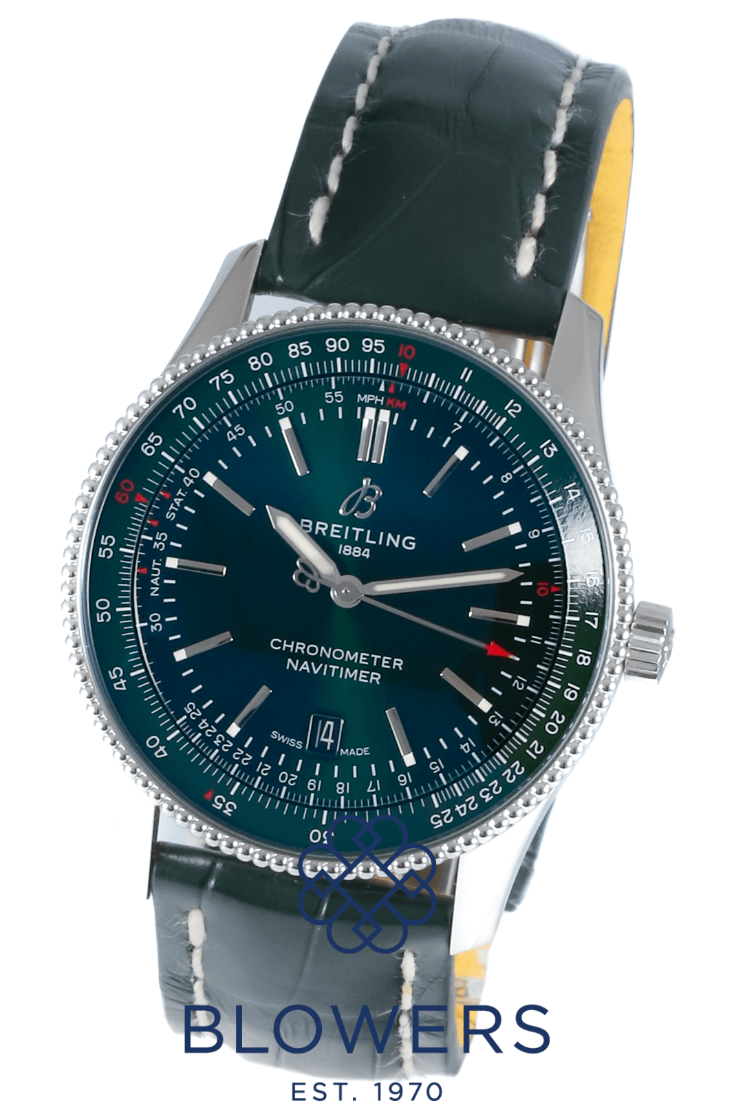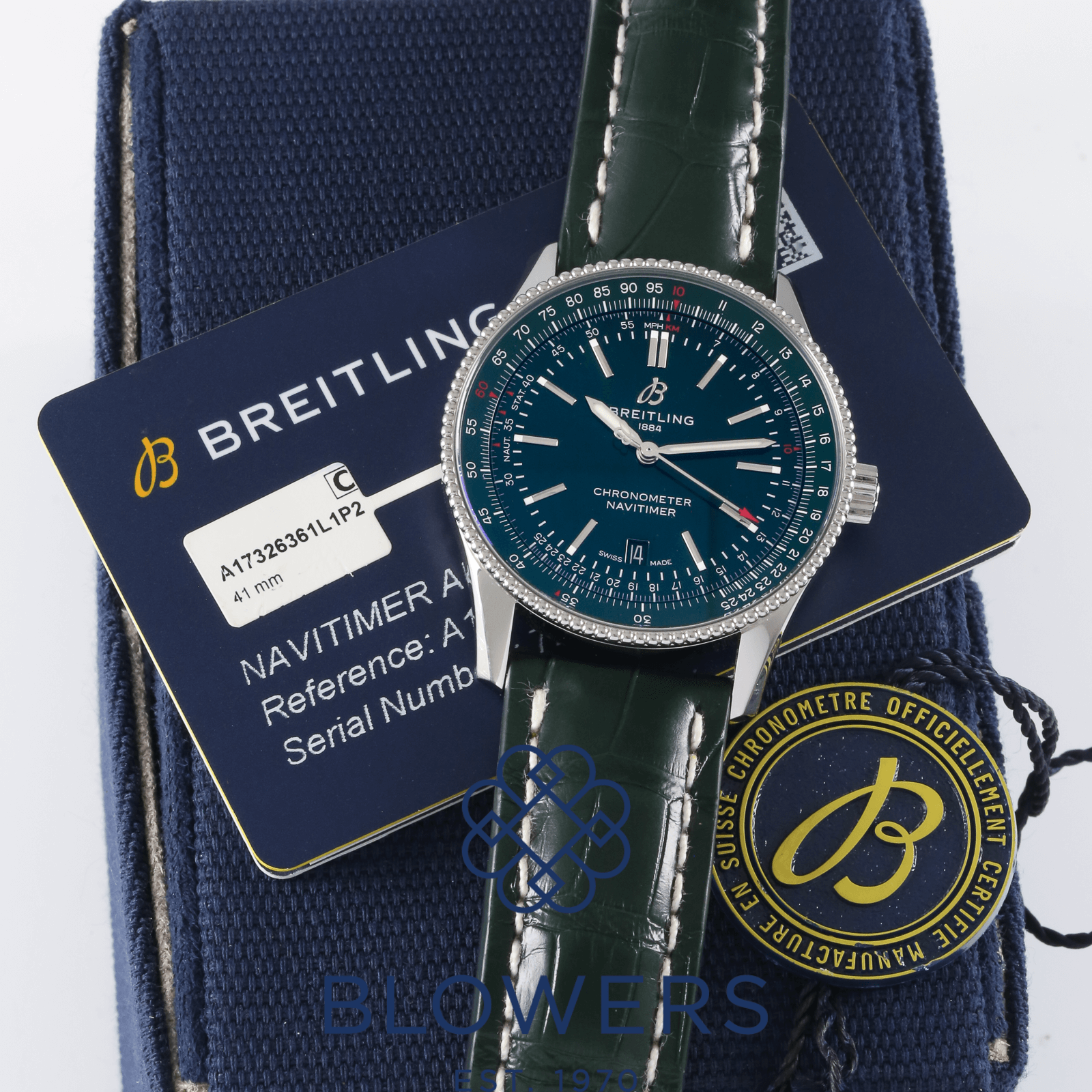 Breitling Navitimer A17326. Stainless steel 41mm diameter case with bidirectional beaded slide rule bezel. Water resistant up to 30 metres (3 ATM). Self winding chronometer certified Breitling calibre 17 automatic movement with an approximate 38 hour power reserve. Green dial with white logarithmic slide rule scale and luminescent baton hour markers and hands. Central hours, minutes and seconds hands. Date window located at the 6 o’clock position. Scratch resistant domed sapphire crystal glass. Green crocodile leather strap with folding clasp. Box and papers dated April 2023. Under Brietling gaurentee until April 2028.
