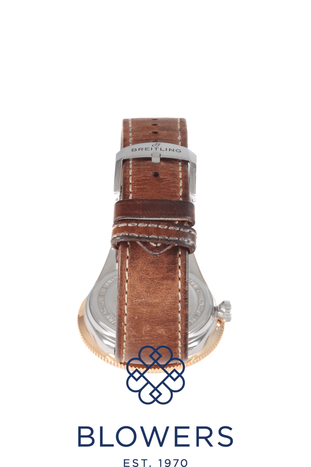 Breitling Superocean Heritage ’57 U10370121B1X1. Stainless steel 42 mm diameter case with 18k red gold bidirectional concave bezel. Water resistant up to 100 metres. Self-winding Breitling Calibre 10 chronometer-certified movement with approximately 42-hour power reserve. Black dial with applied indexes and luminous hour markers. Central hours, minutes, and seconds hands. Date window positioned at 6 o’clock. Cambered sapphire crystal, glare proofed on both sides. Bidirectional bezel with black ceramic ring insert. Brown calfskin leather strap with white stitching, secured by stainless steel pin buckle. Box and papers dated June 2022.