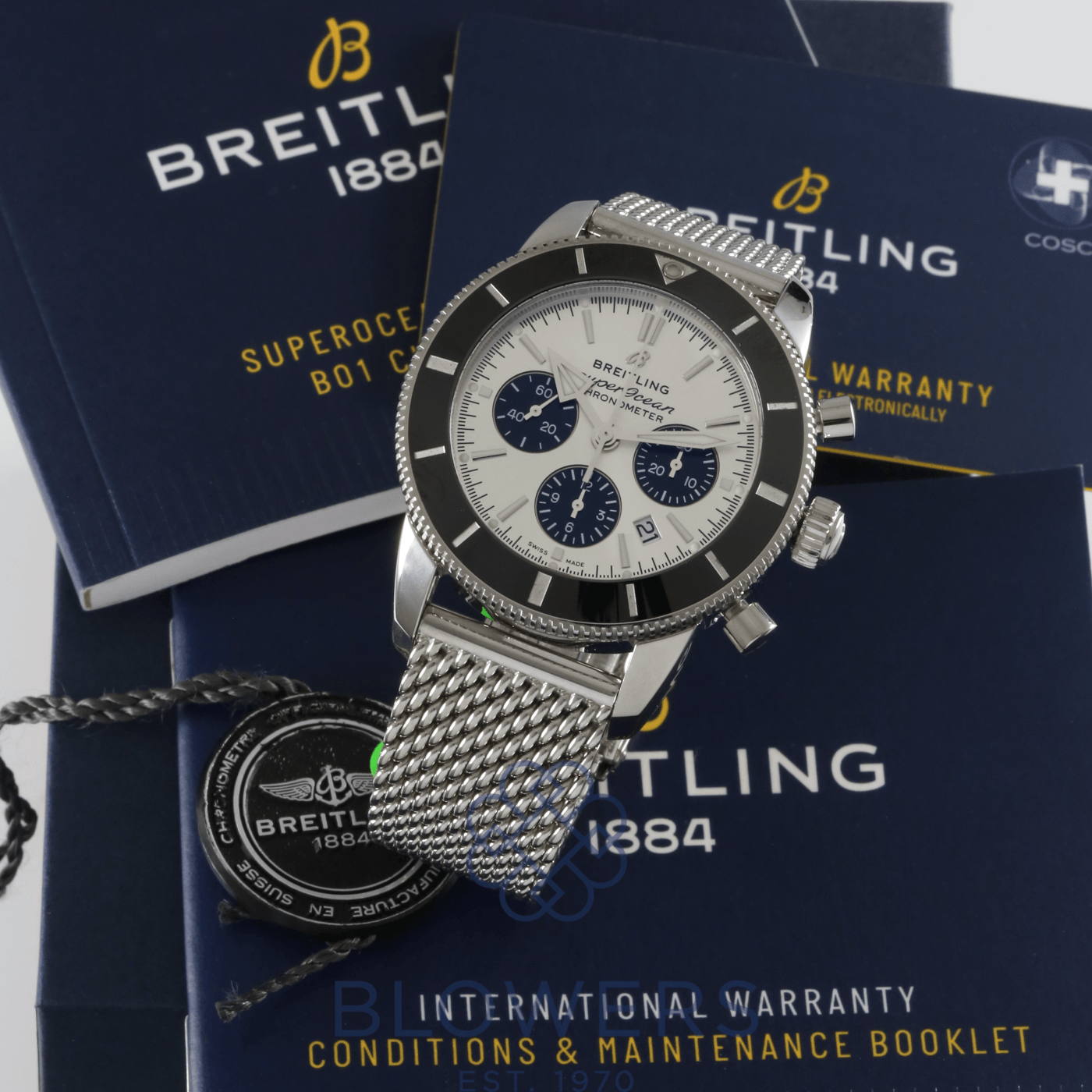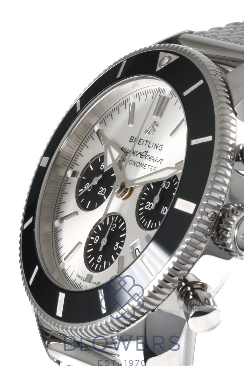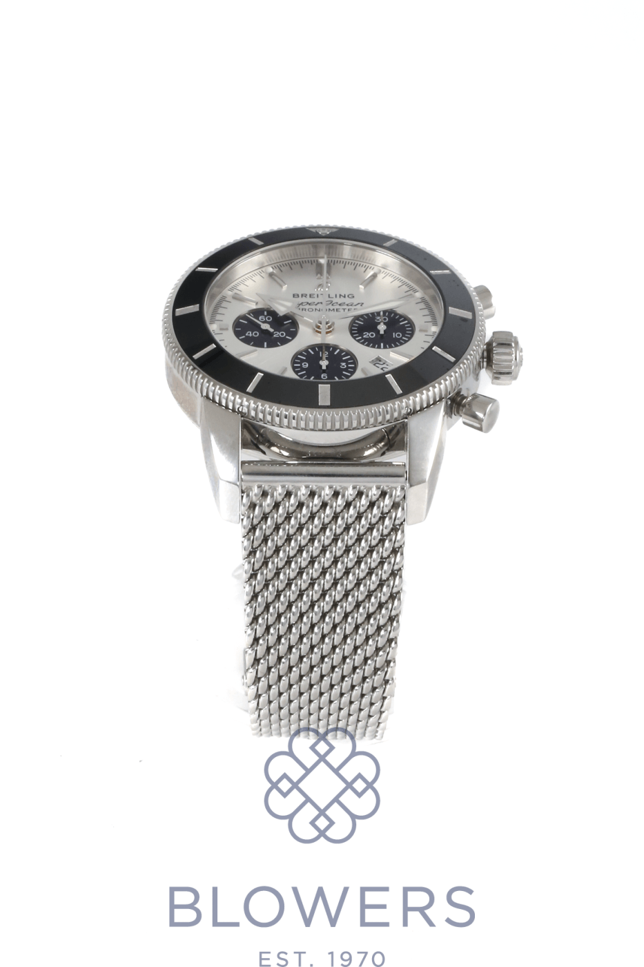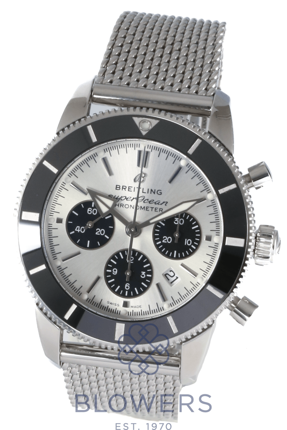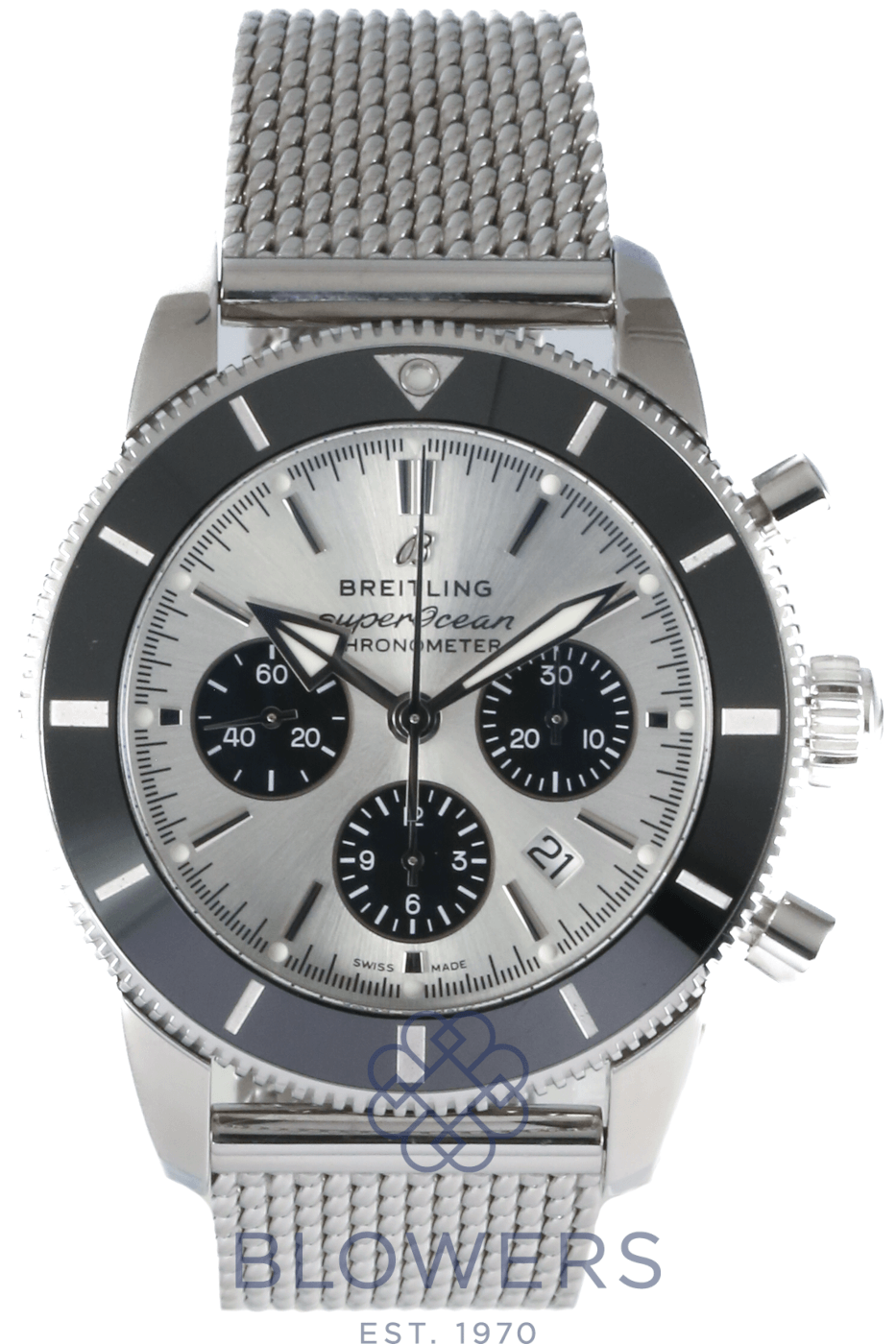 Breitling Superocean Heritage Chronograph AB0162. Stainless steel 44mm diameter case with screw-down crown and chronograph pushers, water resistant up to 200 metres. Self-winding chronometer-certified Breitling calibre 01 manufacture movement with column wheel mechanism and approximately 70 hour power reserve. Uni-directional stainless steel bezel with black ceramic insert. Silver dial with applied baton hour markers and luminescent hands, black sub dials. Chronograph function with central seconds hand, 30-minute and 12-hour counters, and date window positioned at the 6 o’clock position. Cambered sapphire crystal glass with anti-reflective coating on both sides. Stainless steel mesh-style bracelet with folding clasp. Box and papers dated December 2020.