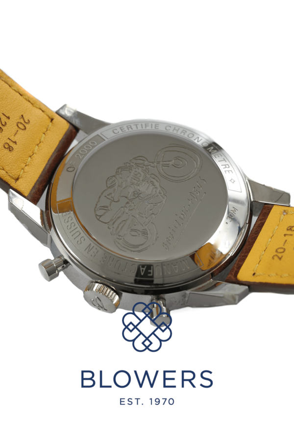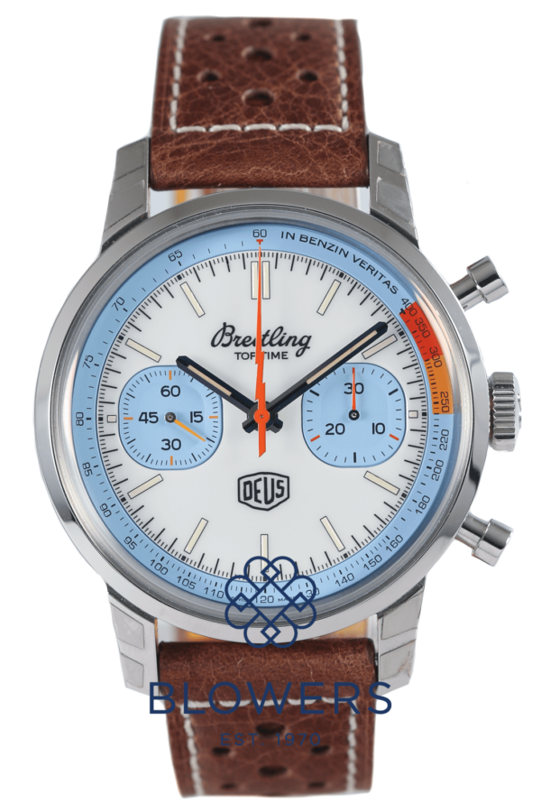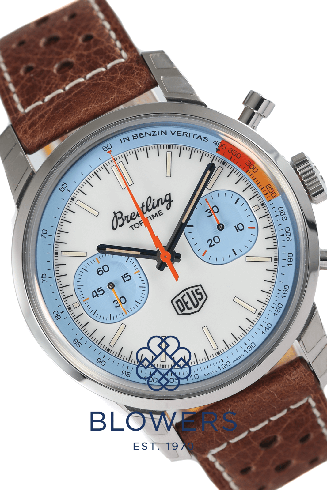 Breitling Top Time Deus A23311. Limited edition of 2000 pieces, in collaboration with Australian brand Deus Ex Machina. 41mm diameter stainless steel casing, with a case thickness of 14.2mm. housing an automatic Breitling calibre 23 movement :27 jewels, 28,800 v.p.h. A power reserve of 48 hours, and a water resistance of up to 30 meters. White dial, with two blue sub-dials :60 seconds at 9 o’clock, 30 minutes at 3 o’clock. Luminous central hours and minutes hands, with orange, lighting bolt shaped chronograph hand, with steel pushers. Luminous index hour markers, surrounded by a blue, tachymetric scale. Steel, domed bezel, with scratch resistant and glare proof sapphire crystal. Steel case back, engraved with a motorcyclist illustration by creative director of Deus, Carby Tuckwell. Partially sealed. Upon a brown, calfskin leather strap, with a steel buckle folding clasp. Box and papers dated June 2023.