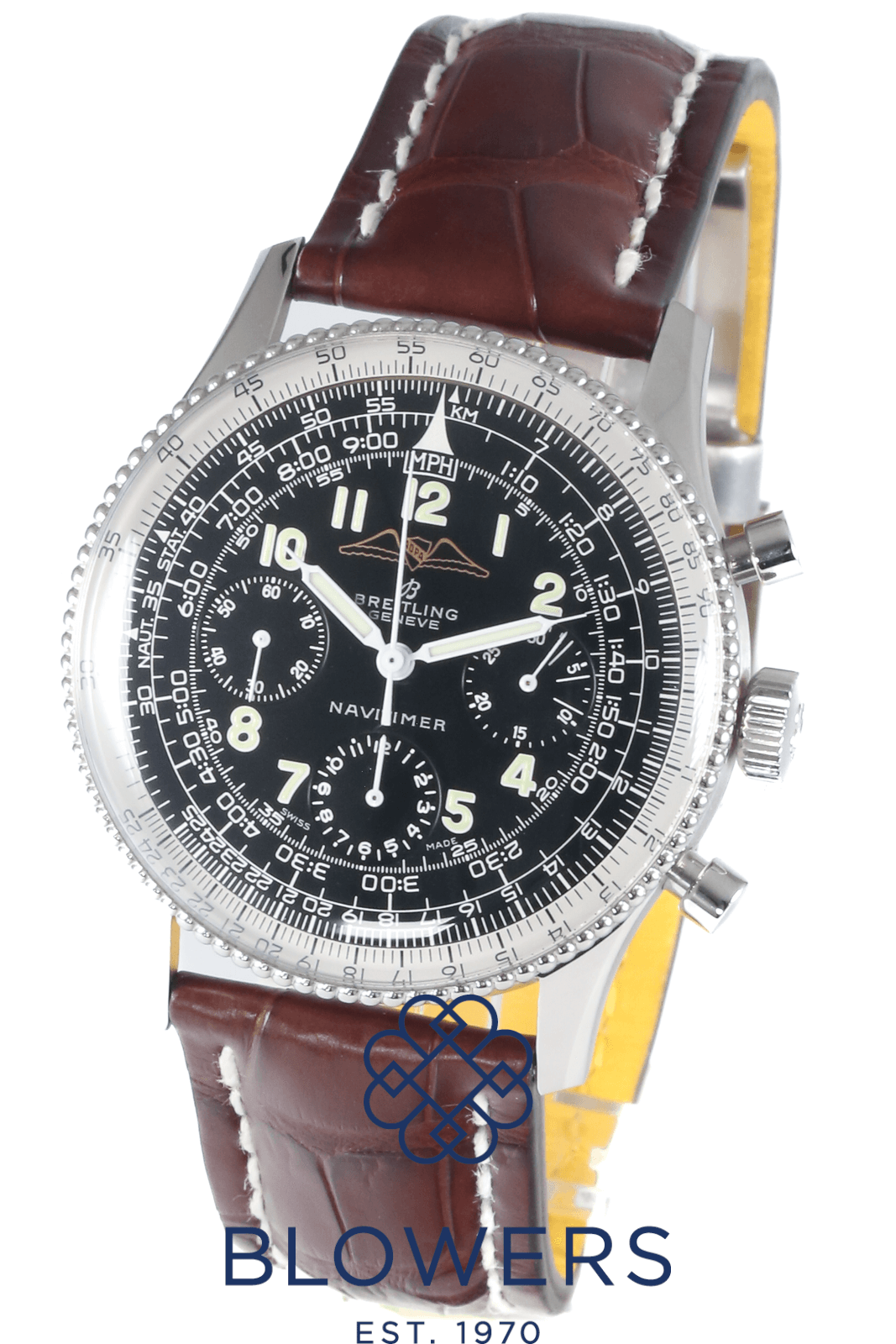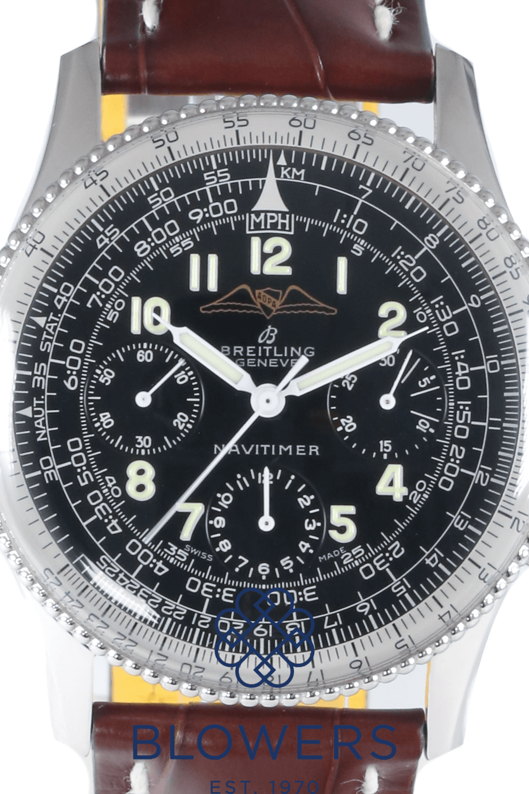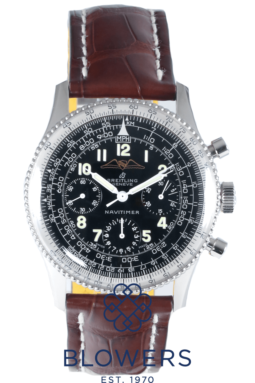 Breitling Vintage 806 Navitimer AOPA. 40mm steel case. Manual winding movement. Black dial with the AOPA (Aircraft Owners and Pilots Association) logo. Beaded bezel. Plexiglass. Arabic numerals with black sub-dials in the 3, 6 and 9 position. On a new, brown, full grain alligator strap with yellow lining. Circa 1960s. Watch only. Service papers and pouch dated October 2025 providing a 12 month Breitling warranty.