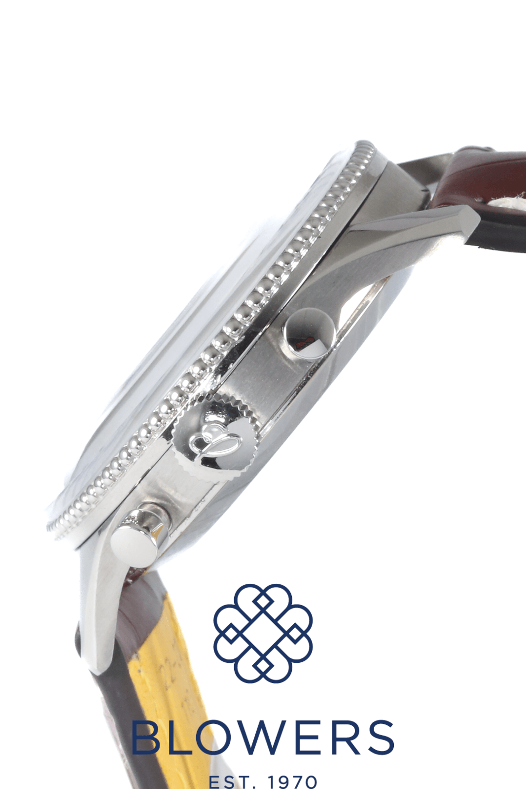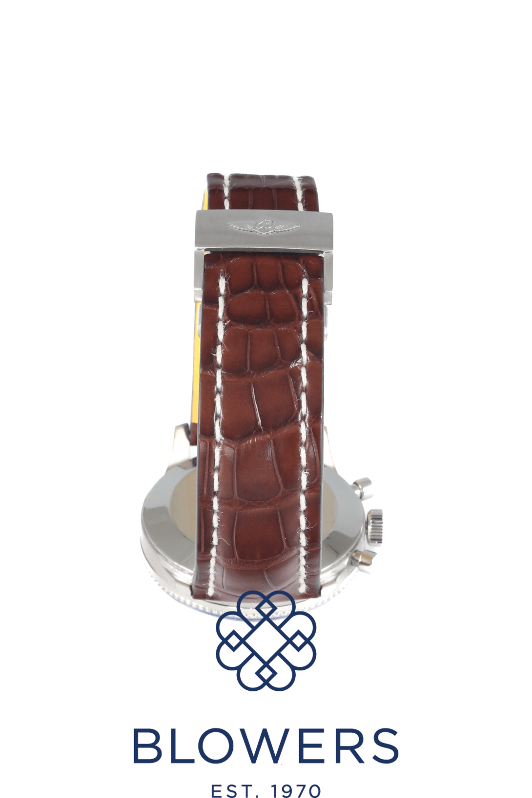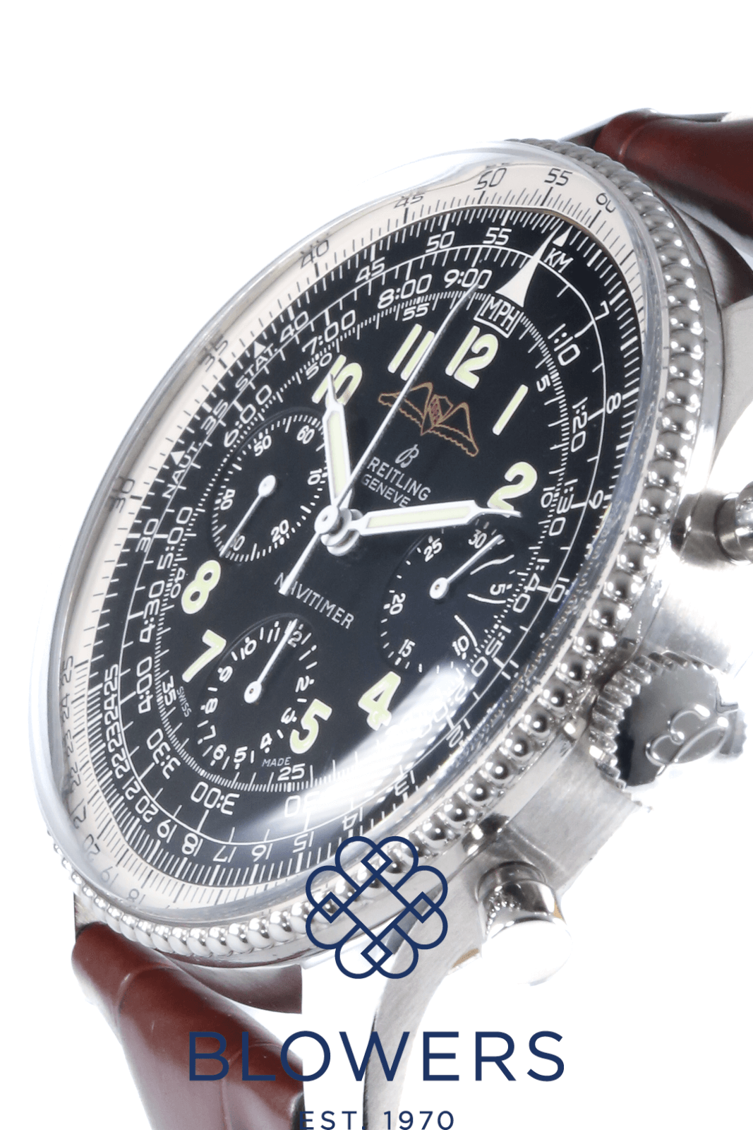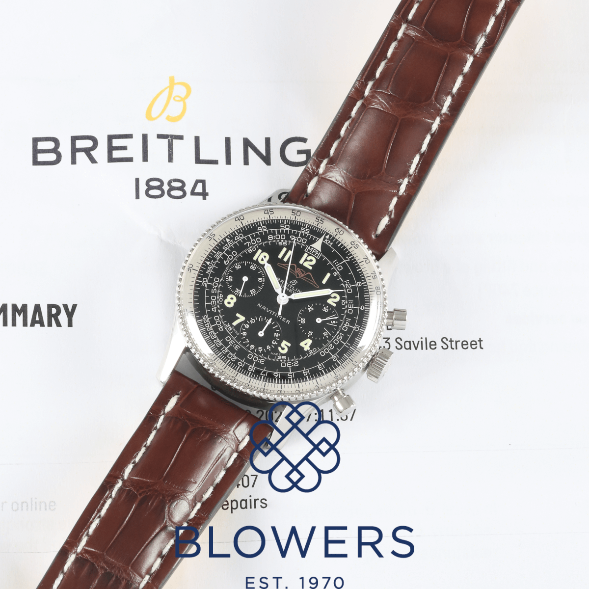 Breitling Vintage 806 Navitimer AOPA. 40mm steel case. Manual winding movement. Black dial with the AOPA (Aircraft Owners and Pilots Association) logo. Beaded bezel. Plexiglass. Arabic numerals with black sub-dials in the 3, 6 and 9 position. On a new, brown, full grain alligator strap with yellow lining. Circa 1960s. Watch only. Service papers and pouch dated October 2025 providing a 12 month Breitling warranty.