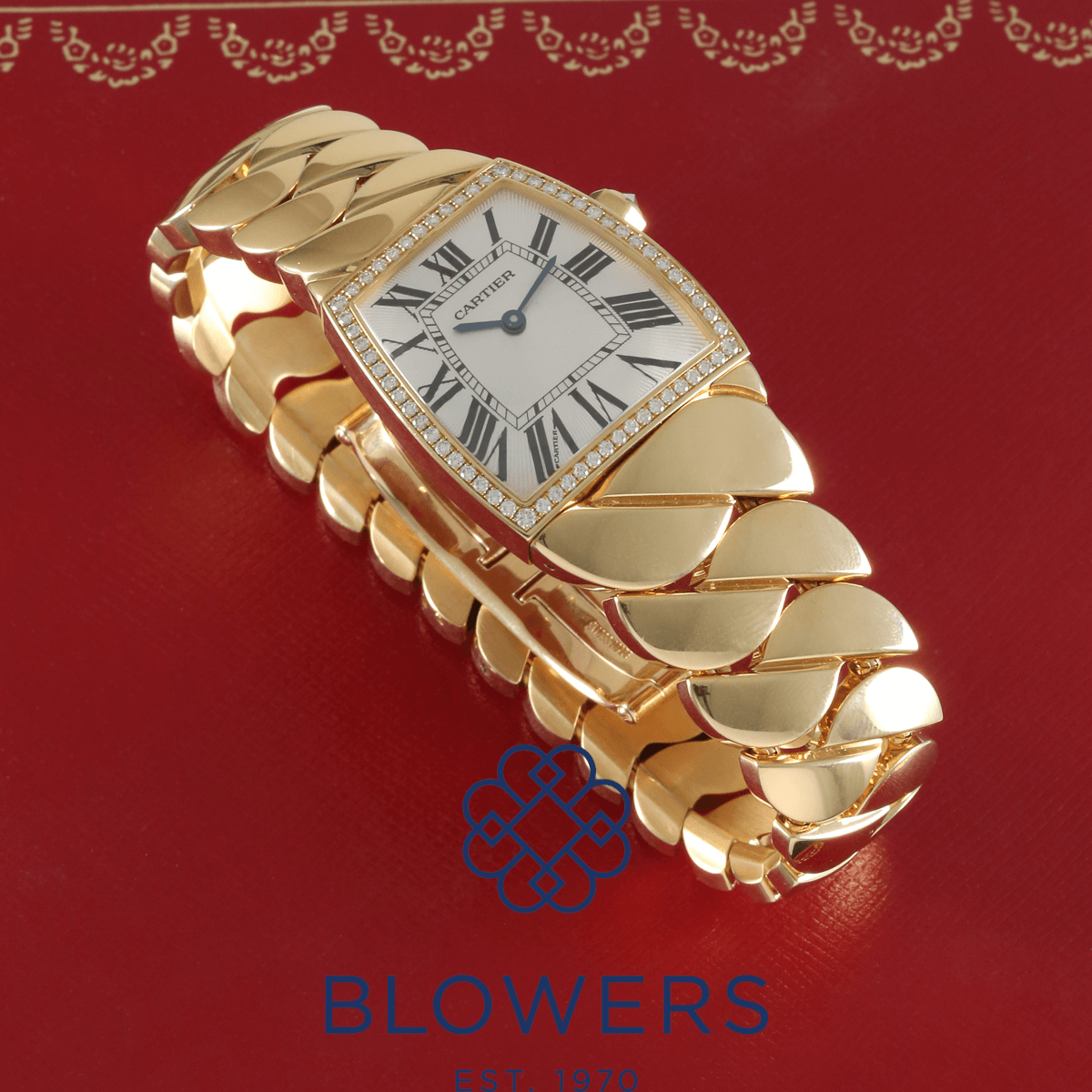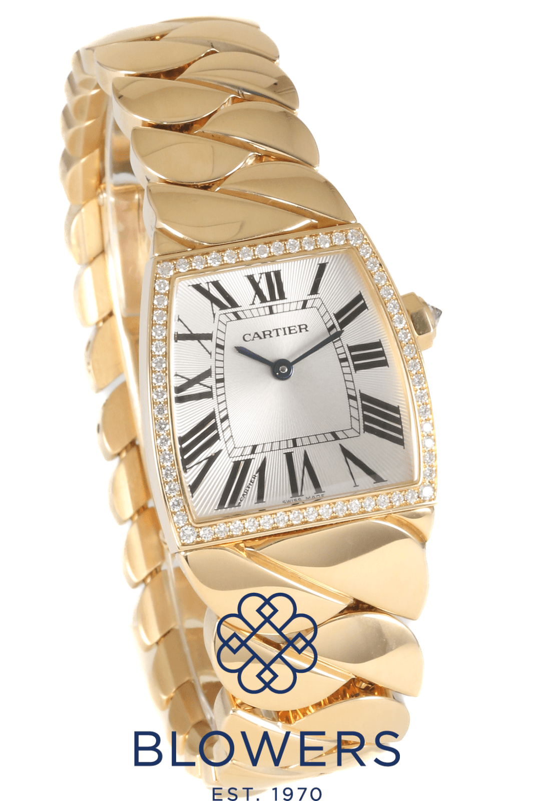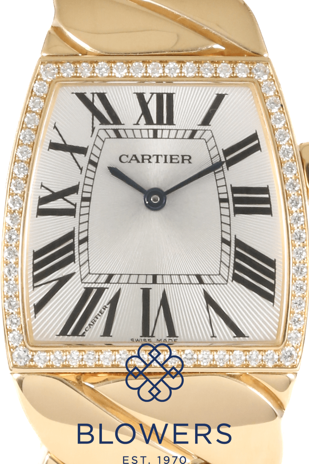 Cartier La Dona de Cartier WE6002OH. 18ct yellow gold unique tonneau case shape, 27mm x 29mm, with diamond-set bezel and crown. Water resistant up to 30 metres. Swiss quartz movement, hours and minutes display. Silver guilloché dial with Roman numeral hour markers and sword-shaped blued-steel hands. Scratch-resistant sapphire crystal glass. 18 k yellow gold bracelet with hidden folding clasp. Box Only. Comes with the original receipt, purchase details and valuations documentation from when new, dated April 2008.
