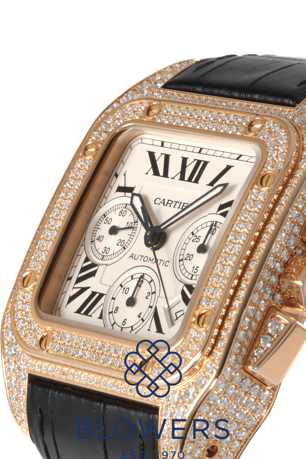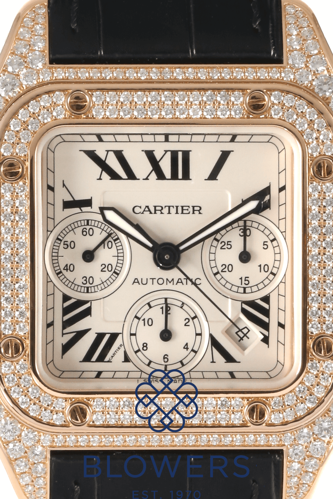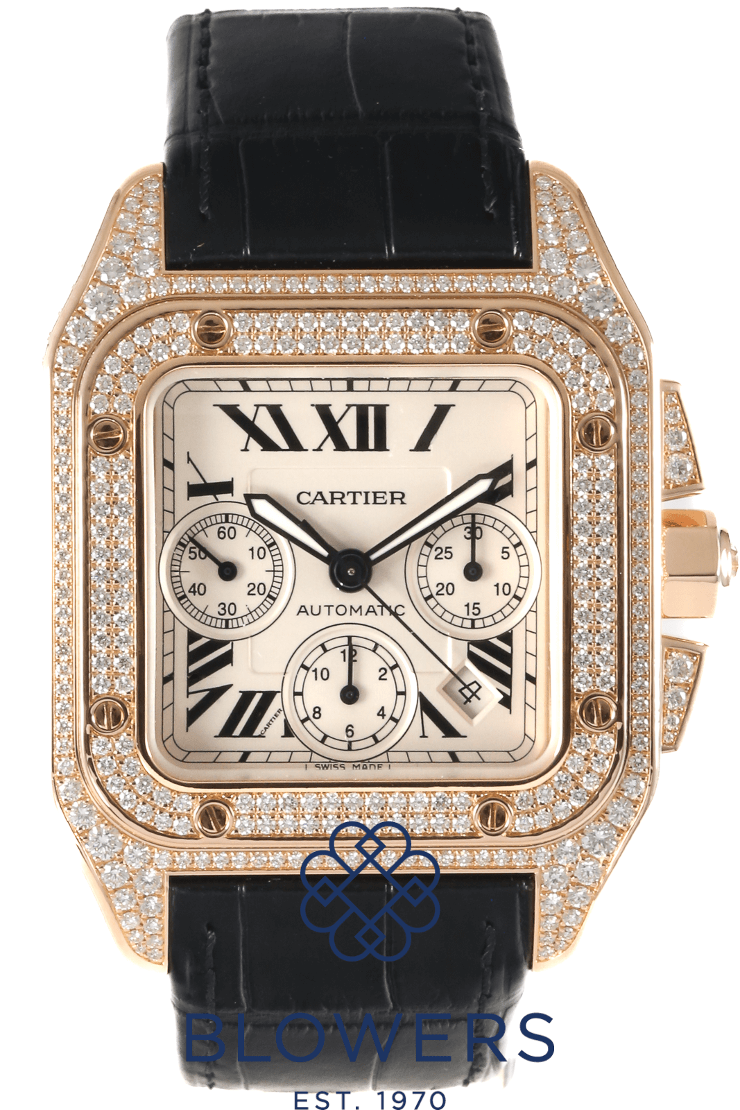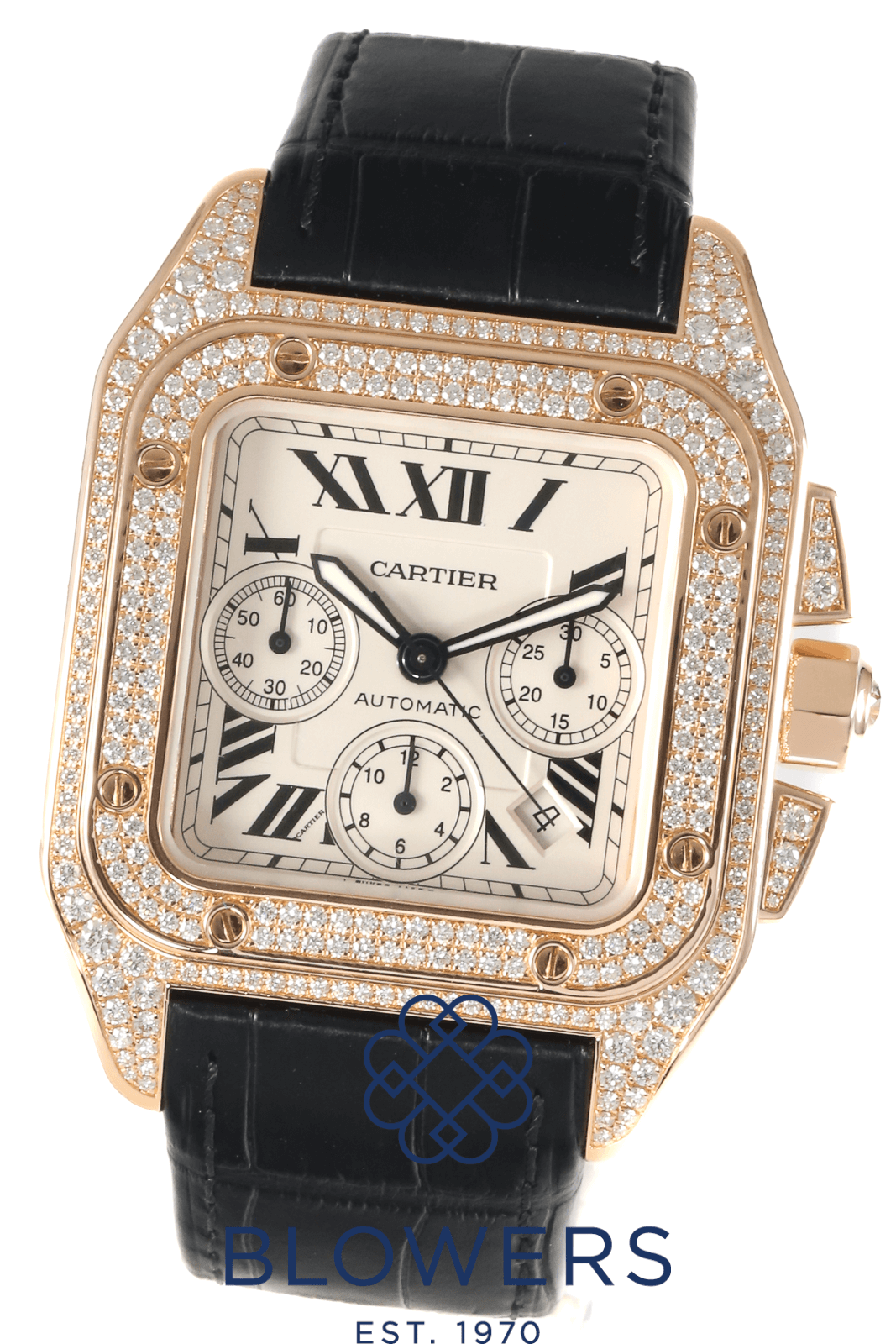 Cartier Santos Joaillerie 100 XL Chronograph Factory “Diamond Pavé” Reference WM502351. 18ct Rose Gold Diamond Case Of 42mm. Diamond Studded Crown. White Dial With Roman Numeral Hour Markers. Three Subdials With Date Aperture Between 4 & 5 O’Clock. Subdial Functions Include