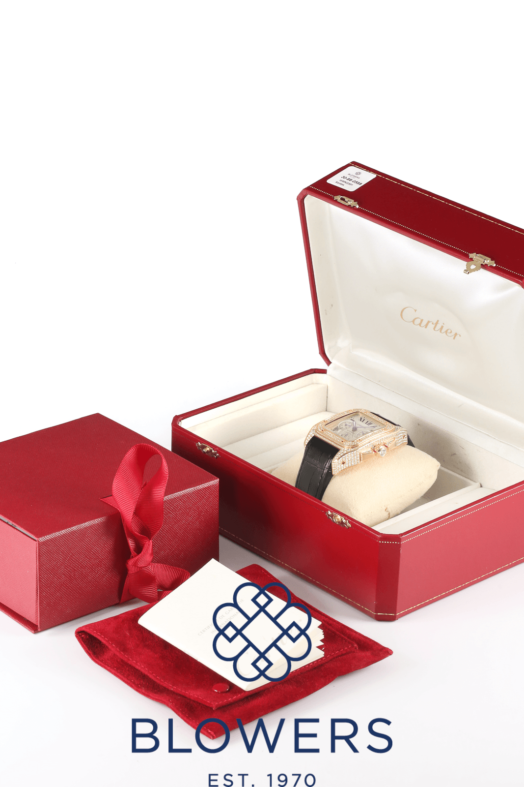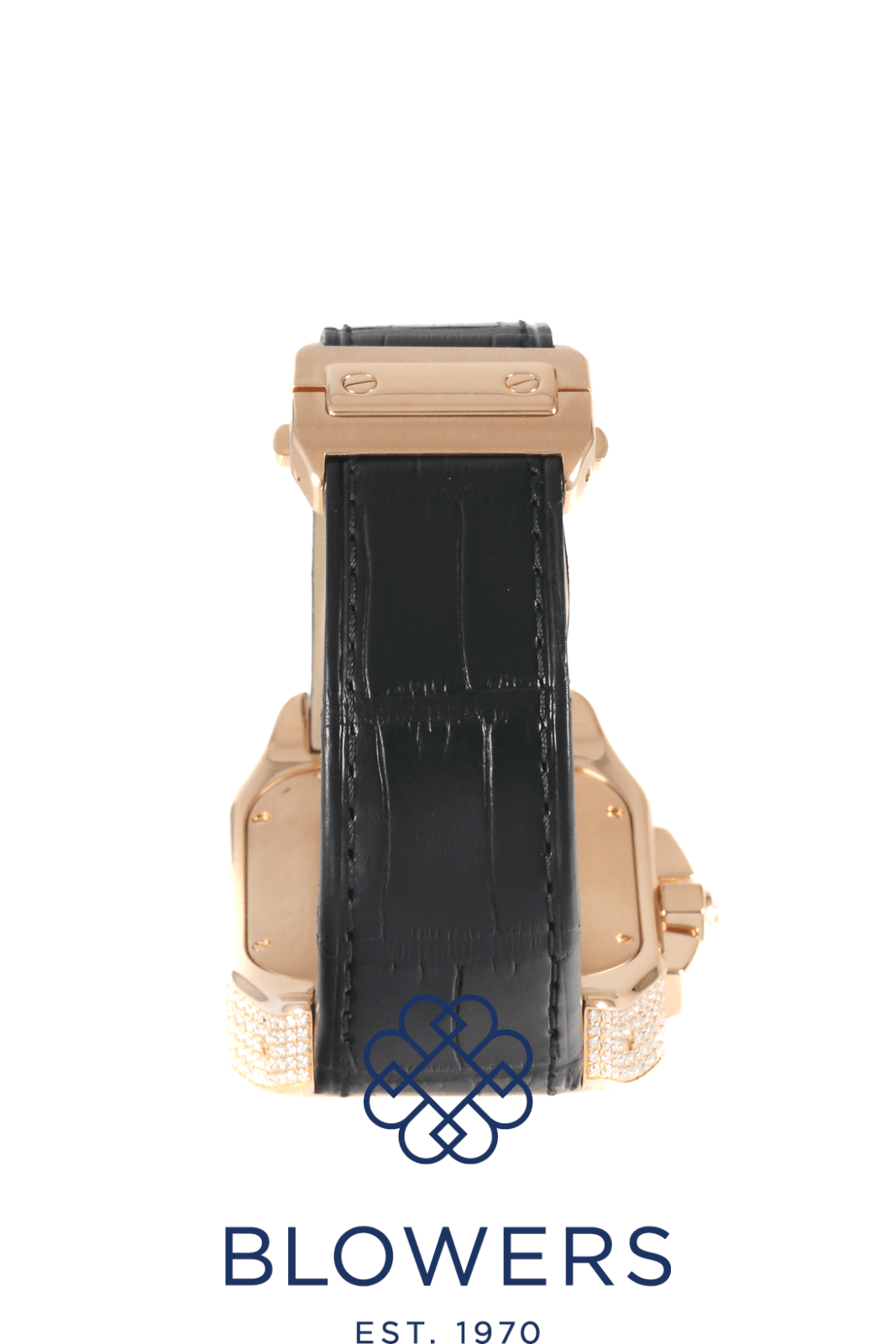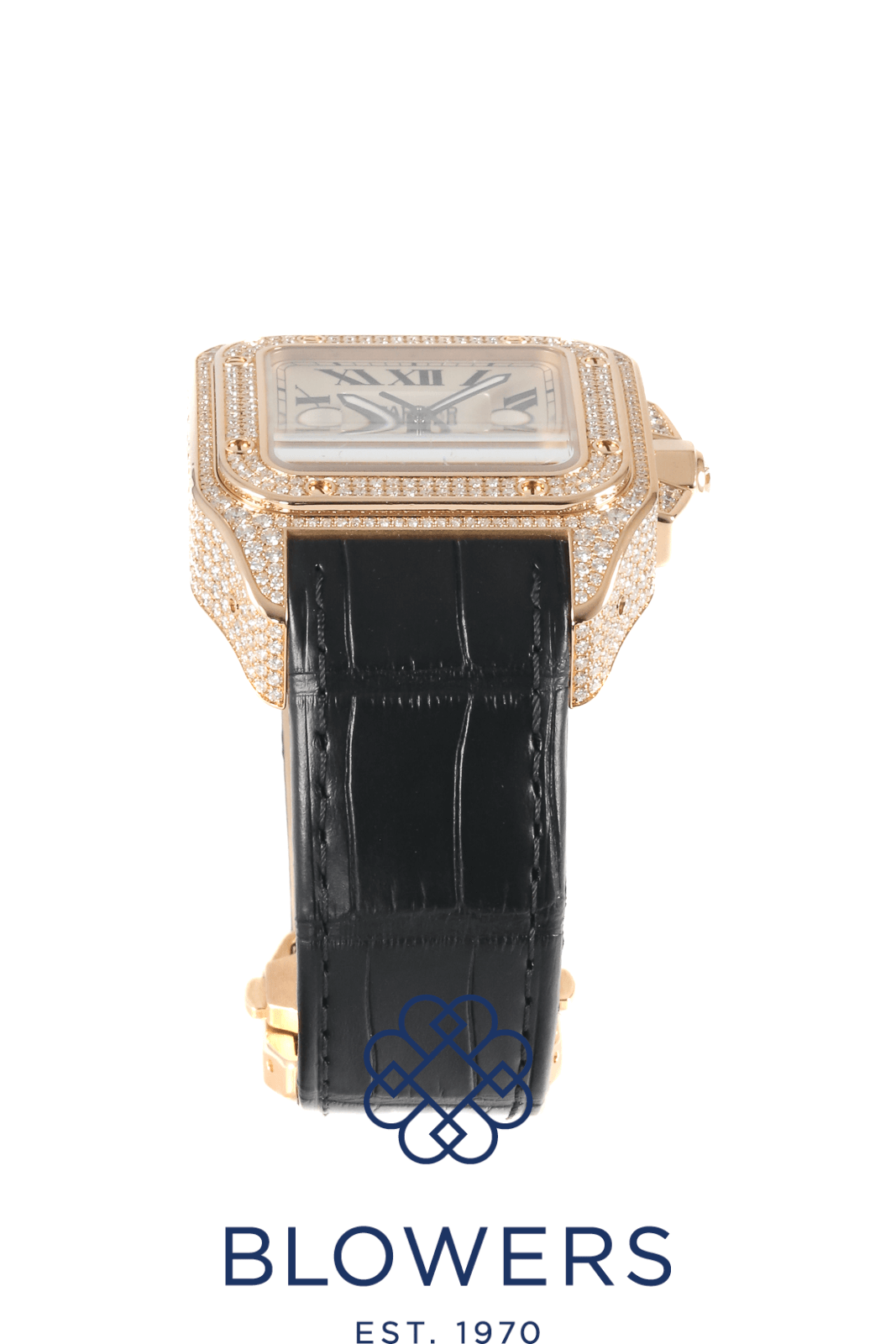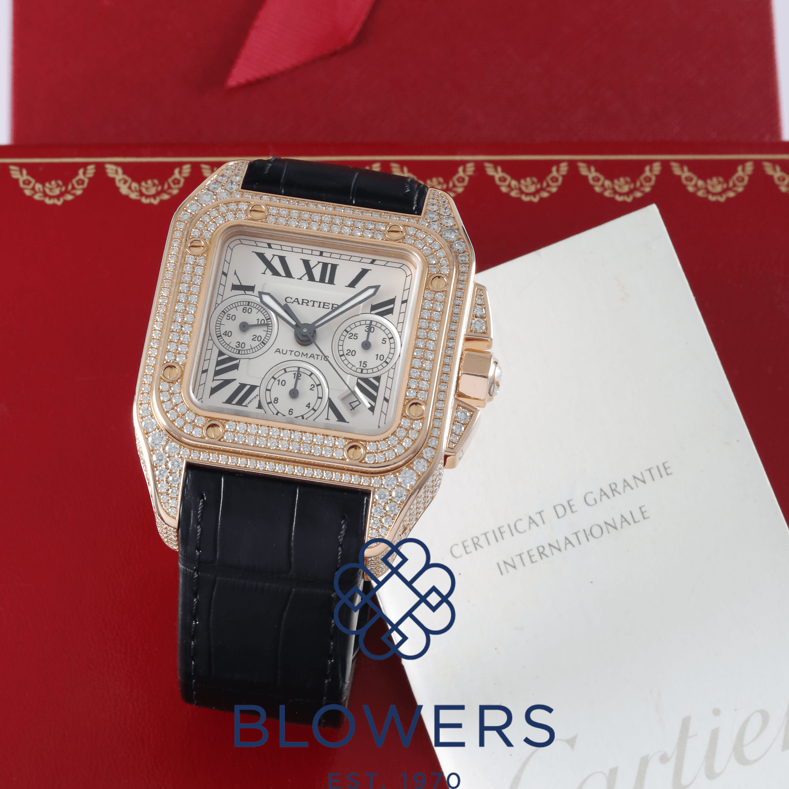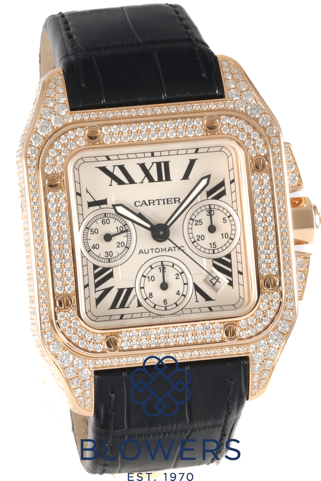 Cartier Santos Joaillerie 100 XL Chronograph Factory “Diamond Pavé” Reference WM502351. 18ct Rose Gold Diamond Case Of 42mm. Diamond Studded Crown. White Dial With Roman Numeral Hour Markers. Three Subdials With Date Aperture Between 4 & 5 O’Clock. Subdial Functions Include