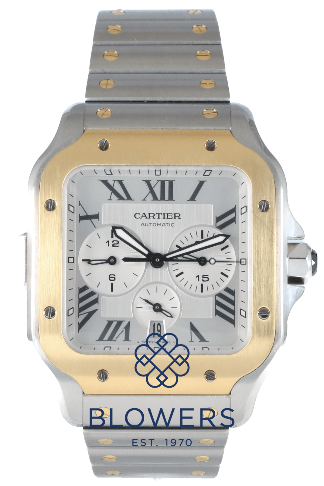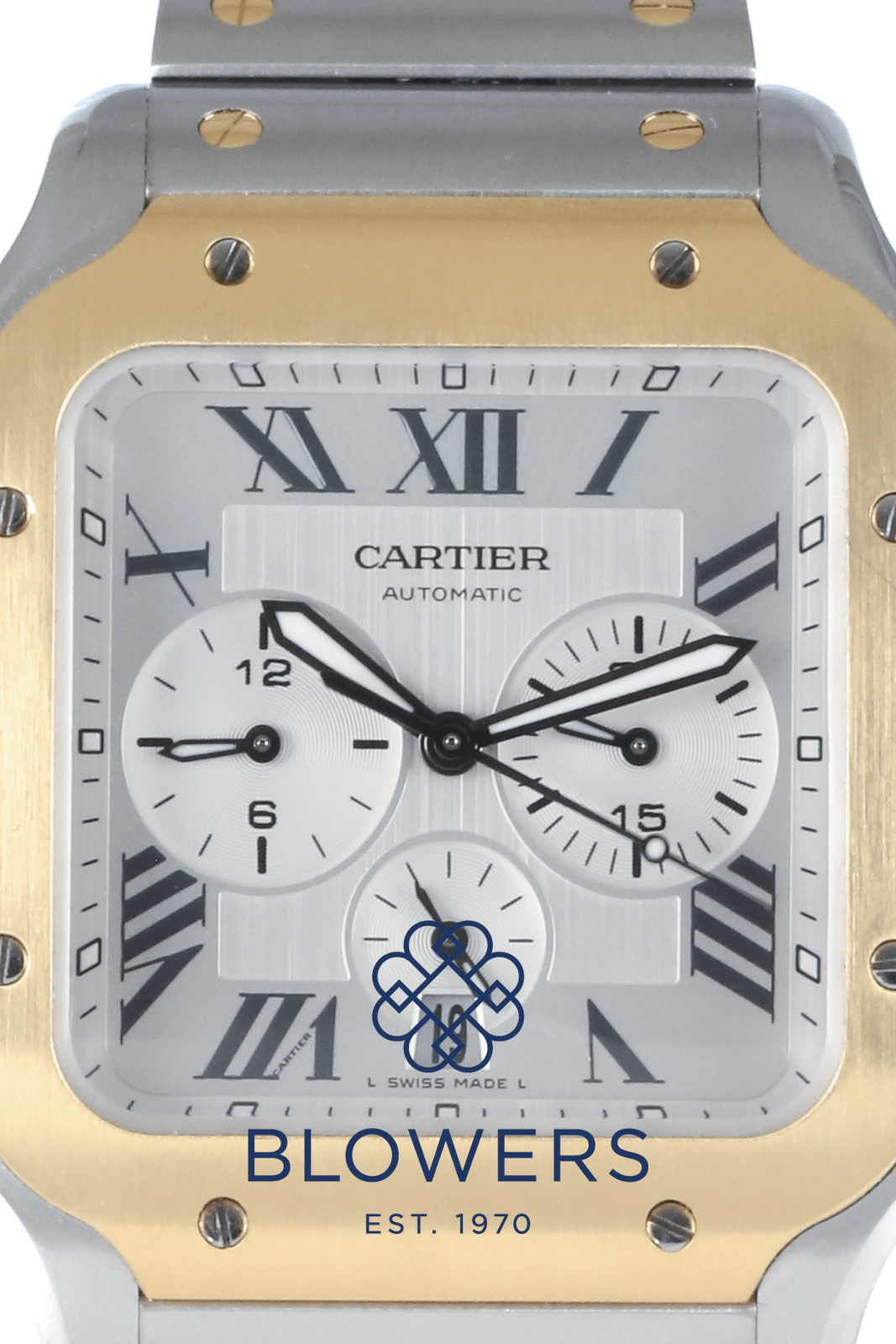 Cartier Santos de Cartier Chronograph XL W2SA0008. Stainless steel 43.3mm x 51.3mm diameter case with 18k yellow gold bezel, fitted with chronograph pushers integrated into the case design. Water resistant up to 100 metres. Self-winding mechanical chronograph movement calibre 1904-CH MC with a 48-hour power reserve. Square case with exposed screws. Silvered opaline dial with black Roman numeral hour markers and luminous filled blued-steel sword-shaped hands. Central hours, minutes and chronograph seconds hands, 30-minute counter at 3 o’clock, 12-hour counter at 9 o’clock, and small seconds at 6 o’clock. Sapphire crystal glass. Cartier gold and steel strap, double folding clasp and additional Cartier rubber strap. Box and papers dated June 2025.