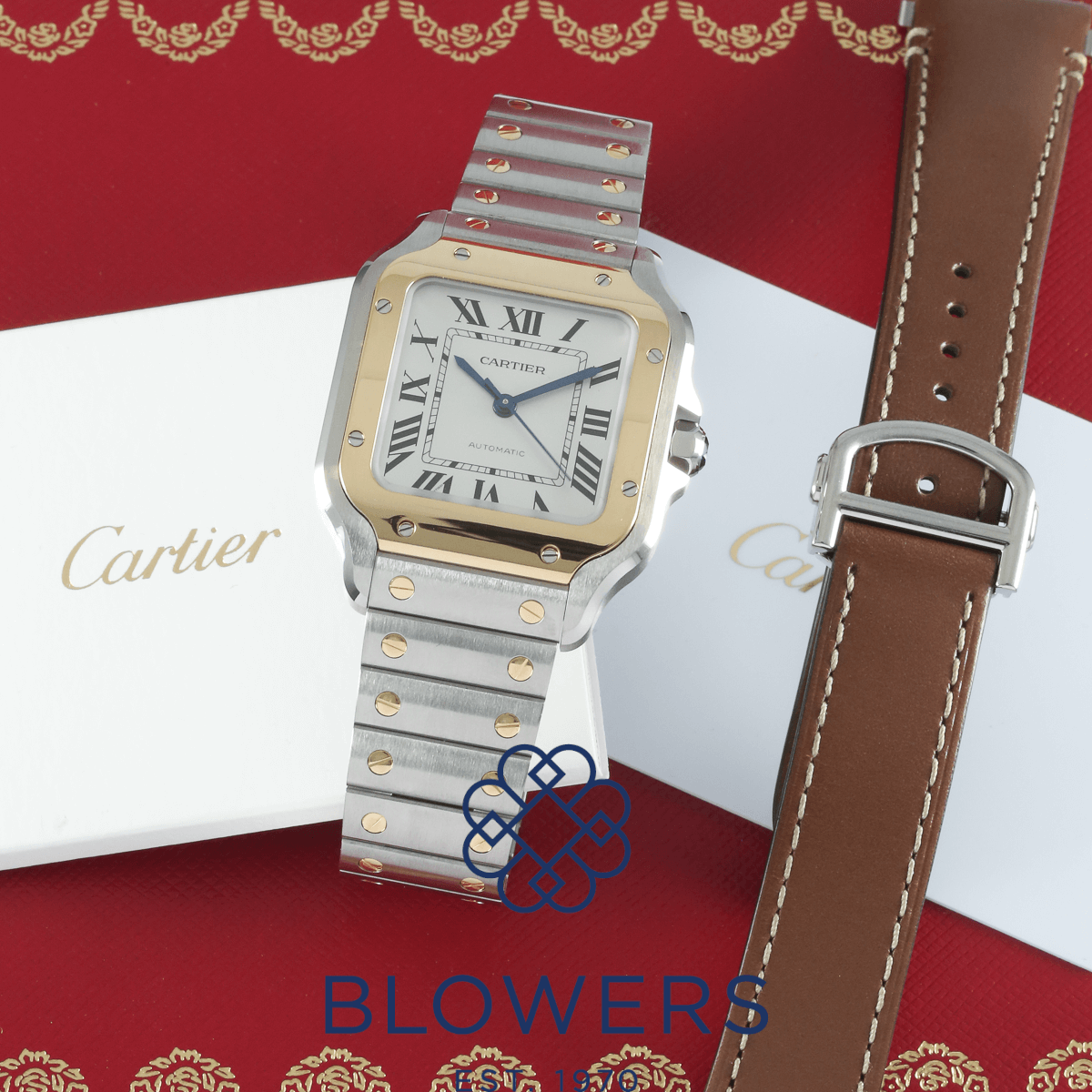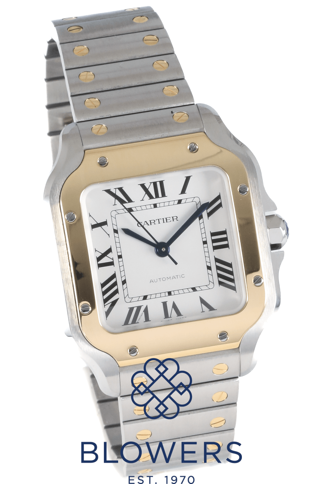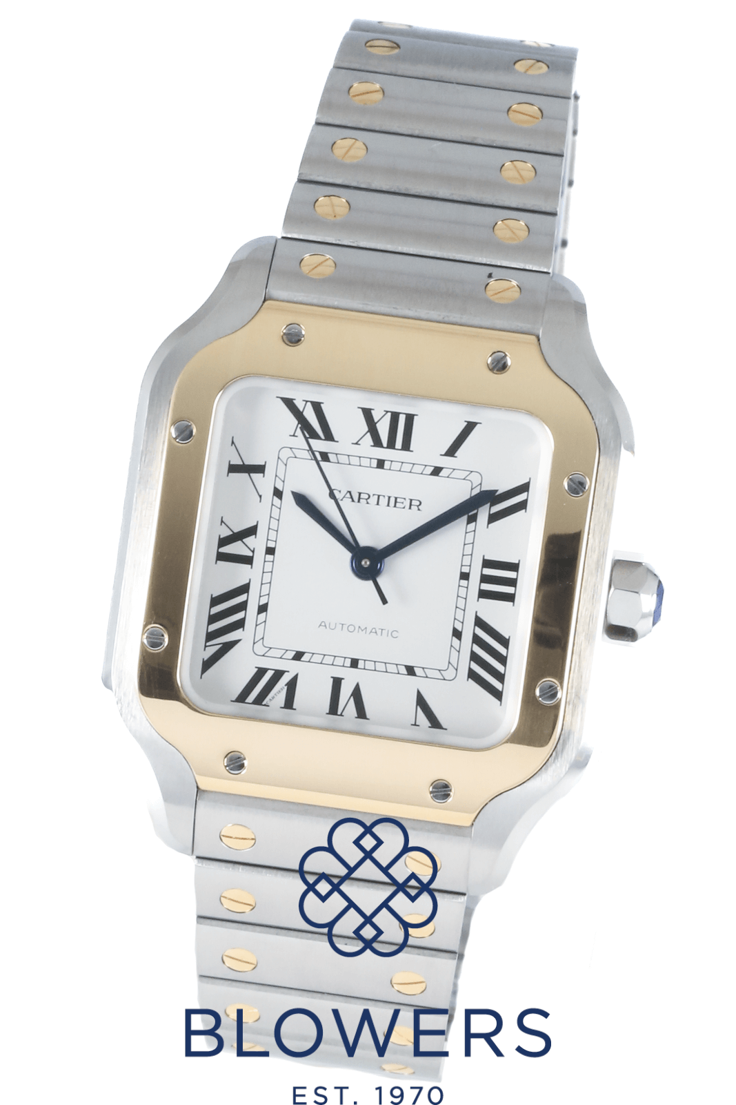 Cartier Santos de Cartier Medium W2SA0016. Steel case with 18K yellow gold bezel Case width 35.1 mm, thickness 8.83 mm. Water resistant up to 100 metres (10 bar). Self-winding manufacture calibre 1847 MC movement, approximately 40-hour power reserve. Silvered white opaline dial with painted Roman numerals and blued-steel sword-shaped hands. Scratch-resistant sapphire crystal glass. Hours, minutes, seconds display. Steel bracelet with “SmartLink” adjustment system; second calfskin strap included, both fitted with interchangeable folding buckle via Cartier’s “QuickSwitch” system. Box and papers dated March 2024.