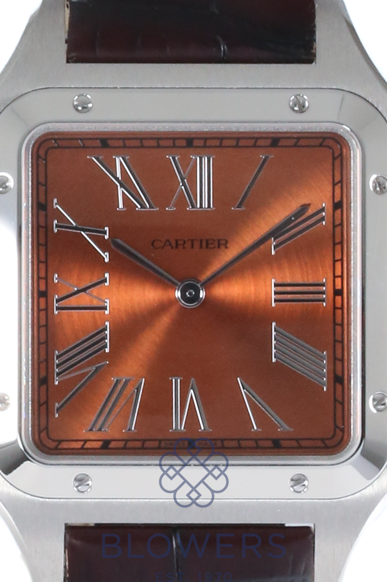 Cartier Santos-Dumont WGSA0113. Limited edition of 200. Platinum extra-large rectangular case measuring 46.6mm x 33.9mm with a thickness of 7.5mm, featuring a beaded crown set with a red ruby cabochon. Water resistant up to 30 metres. Manual-winding manufacture calibre 430 MC movement with approximately 38 hour power reserve. Copper-effect dial with silver Roman numerals and chemin-de-fer minute track. Rhodium-finished steel sword-shaped hands. Central hours and minutes. Sapphire crystal glass. Caseback engraved with the handwritten signature of Alberto Santos-Dumont. Brown alligator leather strap with platinum ardillon buckle. Box and papers dated 2026.
