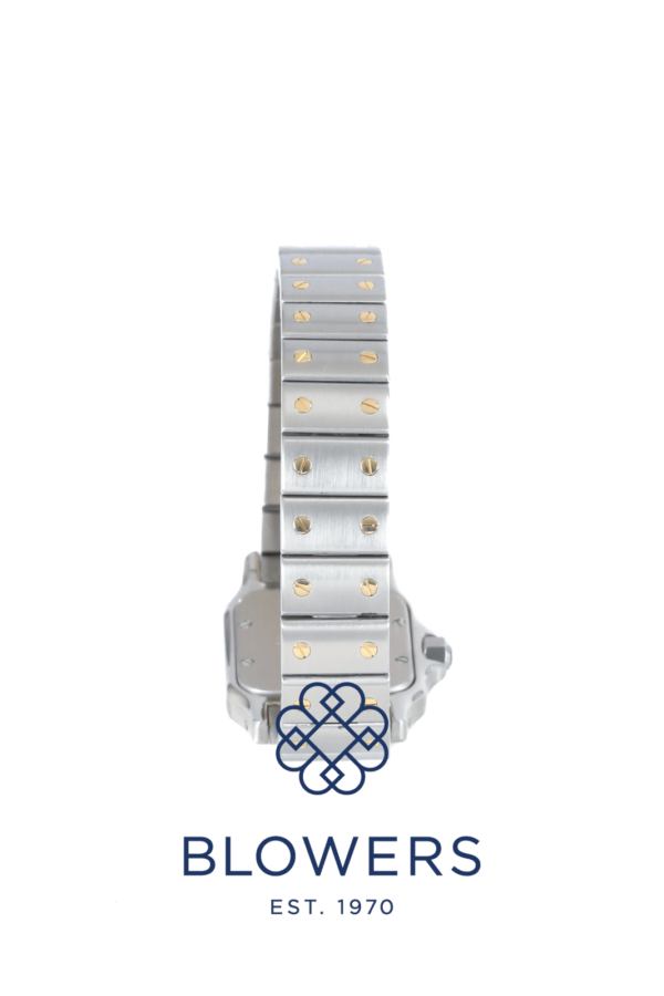Cartier Santos Galbée W20012C4.  Steel and Gold Case, diameter 24mm x 35mm, water resistance 30 metres. 18k Gold Bezel. Quartz movement. White Dial with Black Roman Numerals, Tempered Blue Steel Hands. Scratch resistant Sapphire Crystal. Blue Sapphire set into the Crown. Cartier Steel Bracelet, 18K Screws. Service Box and Service Receipt dated July 2024. Circa 2009.