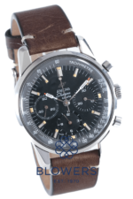 Enicar “Sherpagraph” 072-001. MK IIb, approximately 600 produced. Stainless steel EPSA compressor case with bajonet lock, 40mm Diameter Case. Hand-wound Valjoux 72 Movement, 17 Jewels, 18,000 VpH, 40 Hour Power Reserve. Matt Black dial with Tritium and Beveled Steel Indices, Surrounded by the White and Grey 300-scale Tachymeter. Paddle Hour and Minute Hands, Lollipop Second Hands. Plexiglass. Seapearl Logo shown on the Back of the Case, a Feature only found on the MK IIa and MK IIb reference. Brown Leather Strap, Tang Buckle. Watch only, Circa 1960.