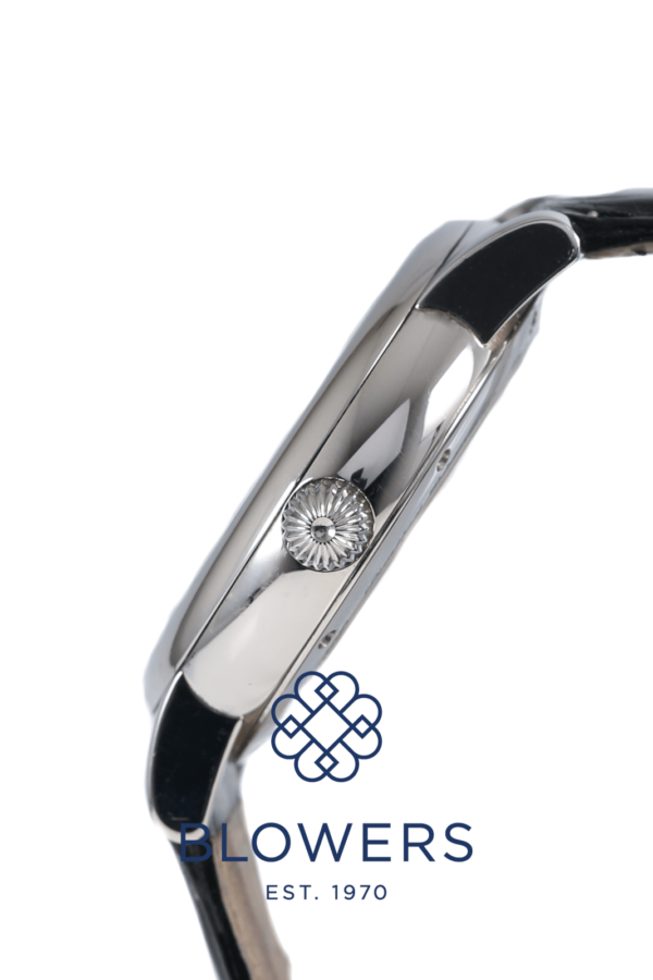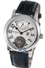 Frederique Constant Highlife Tourbillion FC-800. 38.5mm diameter 950 Platinum case, which is water resistant to a depth of 30 meters. Hand wound FC-800 movement, backed by a 72 hour power reserve. Silver-plated dial with blackened steel leaf hands and Arabic numerals, with date indicator at the 12 o’clock position and tourbillon window at 6 o’clock position. Hand-sewn Louisiana crocodile leather strap with pin buckle. Box and papers dated March 2004.