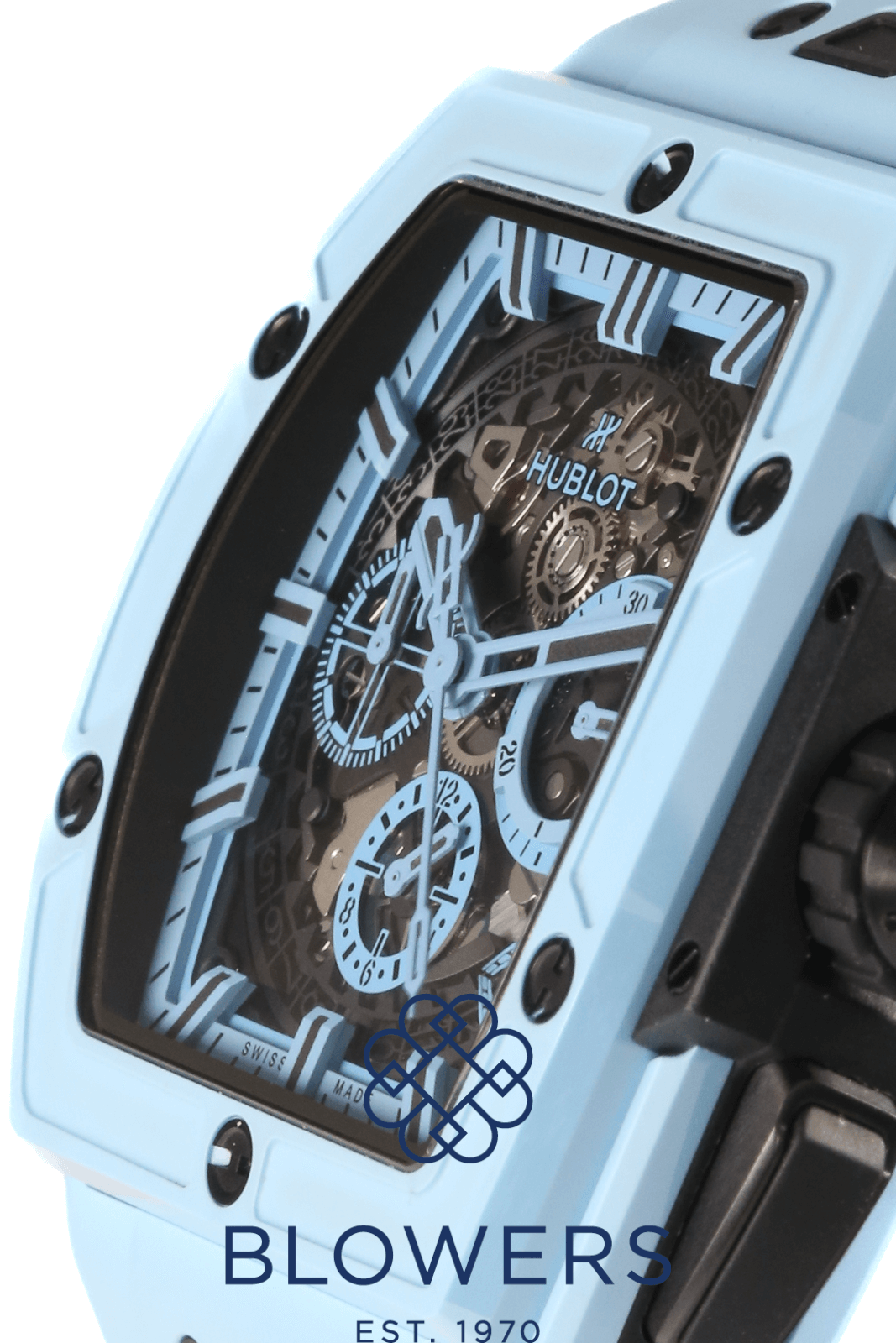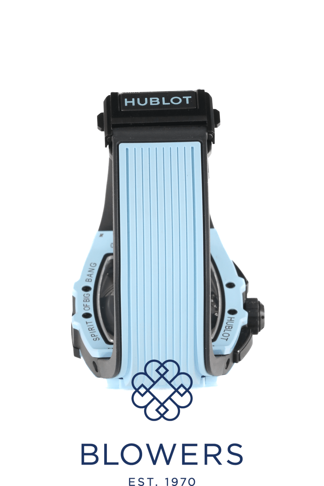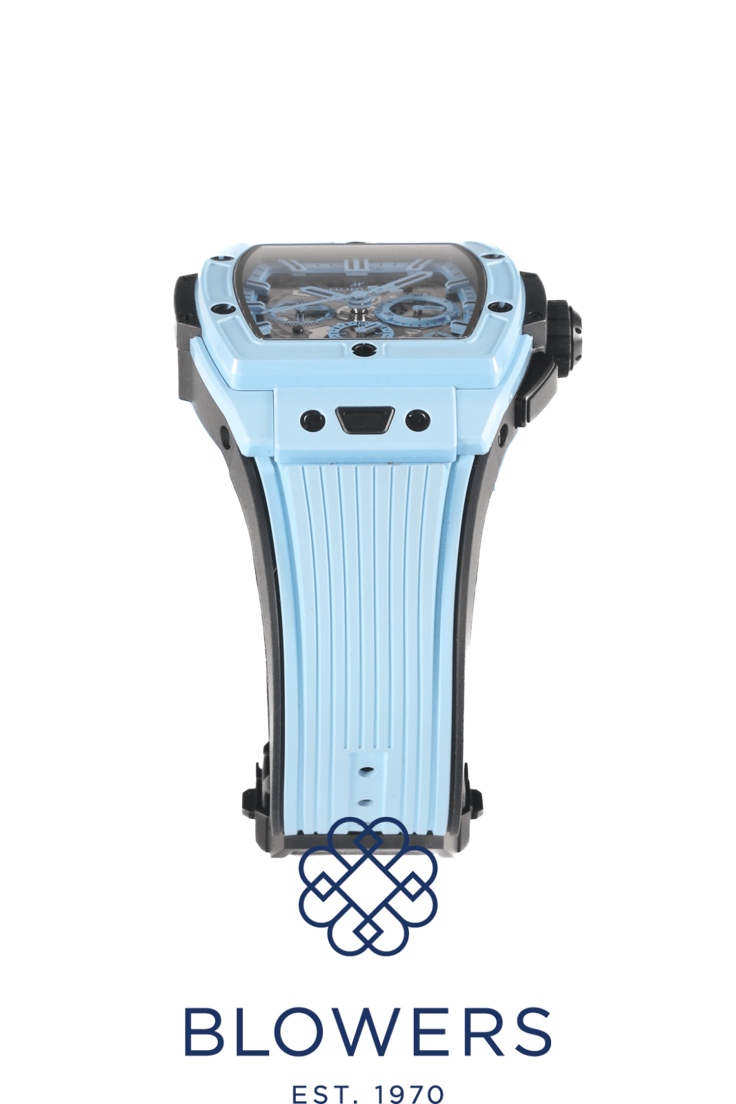 Hublot Spirit of Big Bang Ceramic 642.EX.5110.RX Limited Edition of 200 Pieces. 42mm Microblasted and Polished Sky blue ceramic case. HUB4700 Self-winding Skeleton Chronograph Movement. Sky Blue Skeleton Dial. Microblasted and Polished Sky blue ceramic Bezel. Water Resistant to 100 Meters. Sapphire Crystal with Anti-reflective Treatment. Sapphire case back. Black and light blue lined structured rubber strap with Black Ceramic and Black-plated Titanium Deployment Buckle Clasp. Box and papers Dated May 2025.