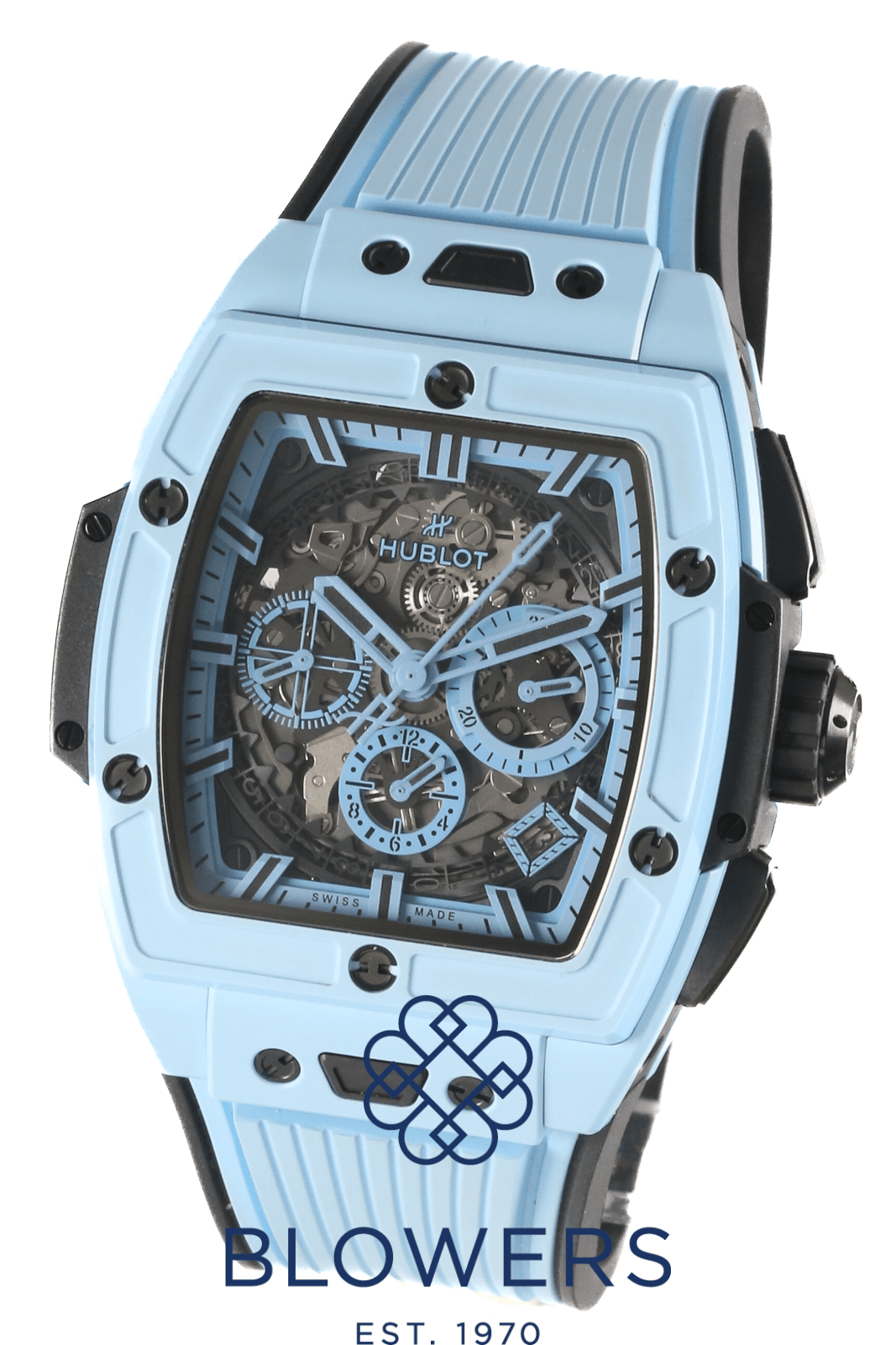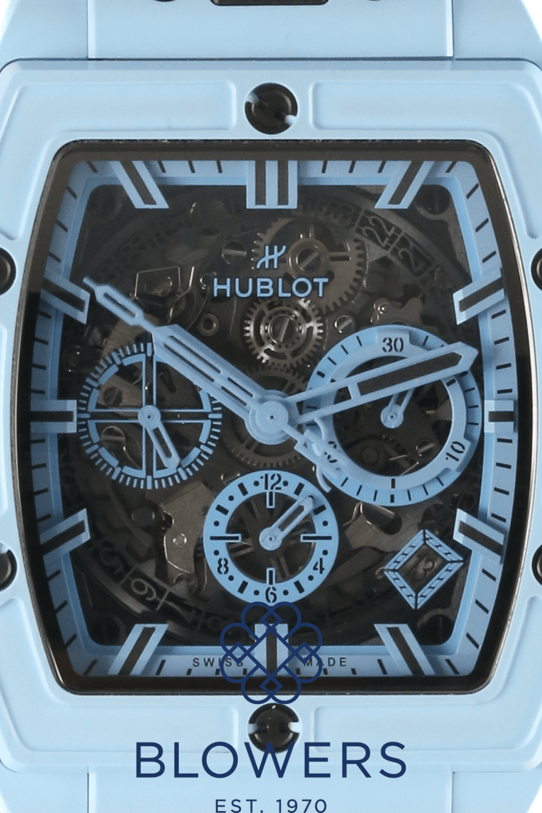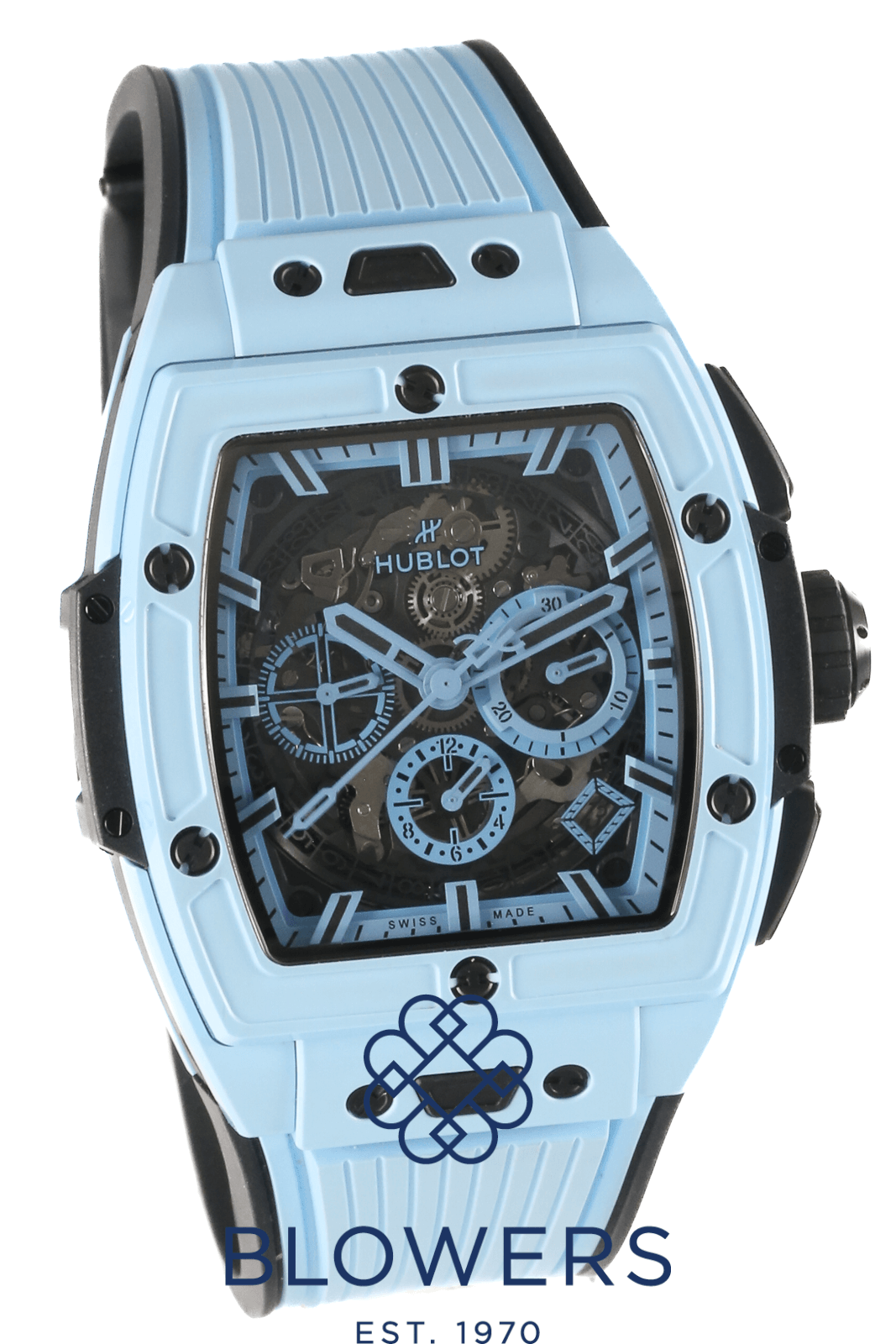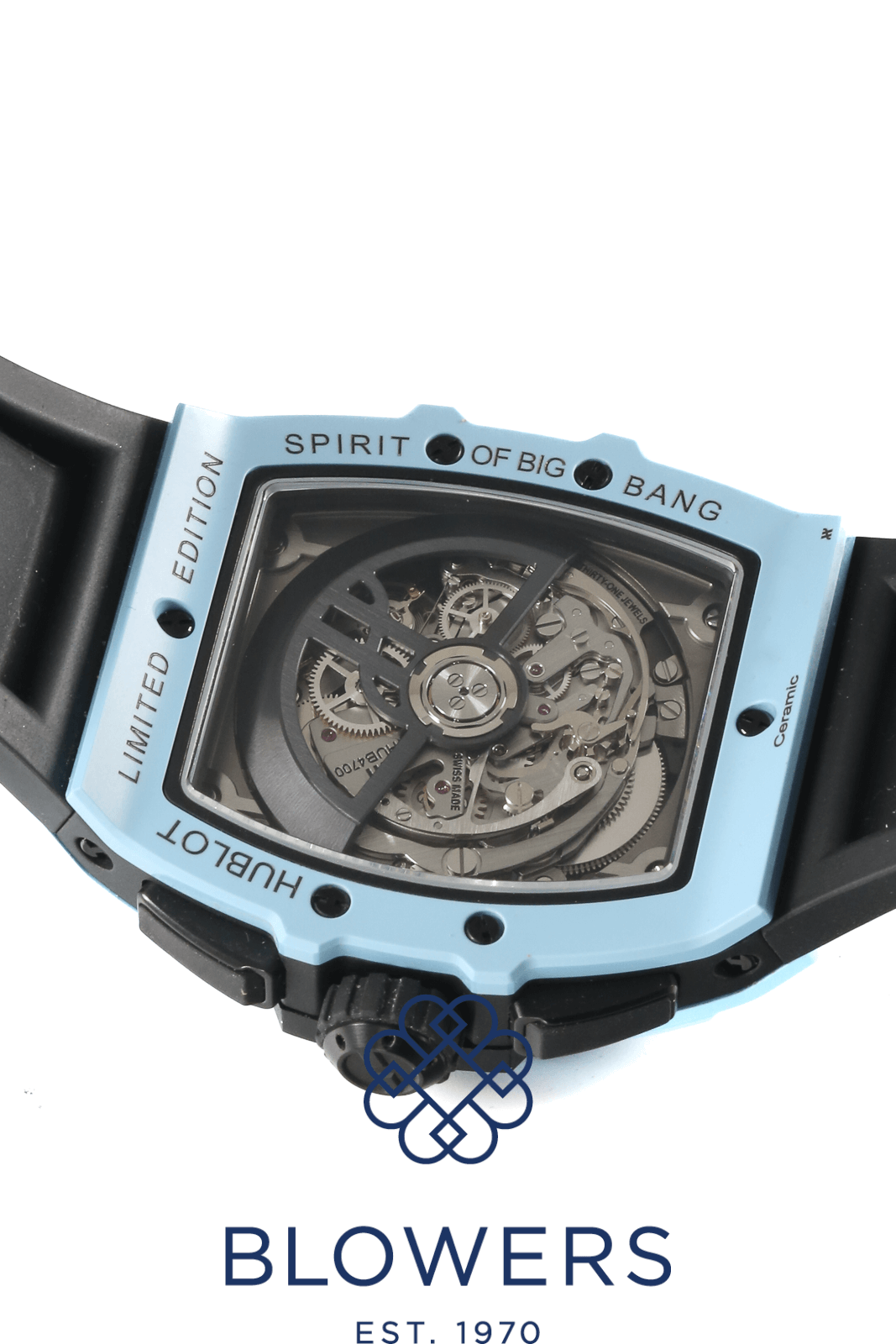Hublot Spirit of Big Bang Ceramic 642.EX.5110.RX Limited Edition of 200 Pieces. 42mm Microblasted and Polished Sky blue ceramic case. HUB4700 Self-winding Skeleton Chronograph Movement. Sky Blue Skeleton Dial. Microblasted and Polished Sky blue ceramic Bezel. Water Resistant to 100 Meters. Sapphire Crystal with Anti-reflective Treatment. Sapphire case back. Black and light blue lined structured rubber strap with Black Ceramic and Black-plated Titanium Deployment Buckle Clasp. Box and papers Dated May 2025.