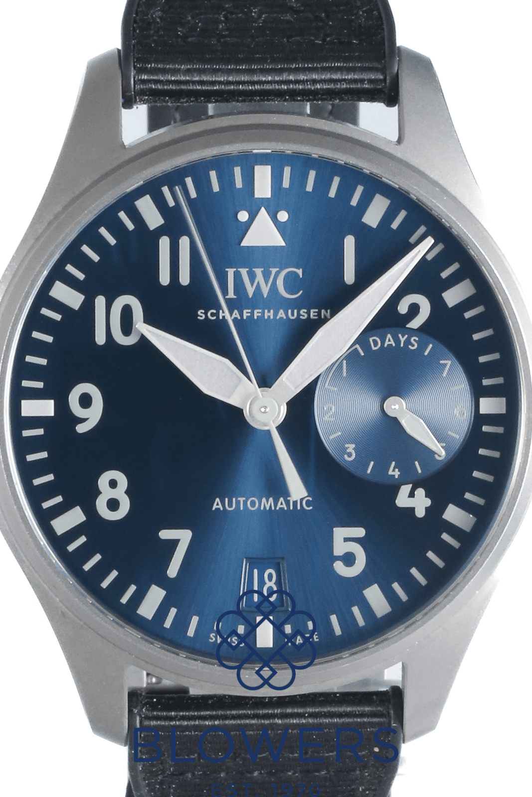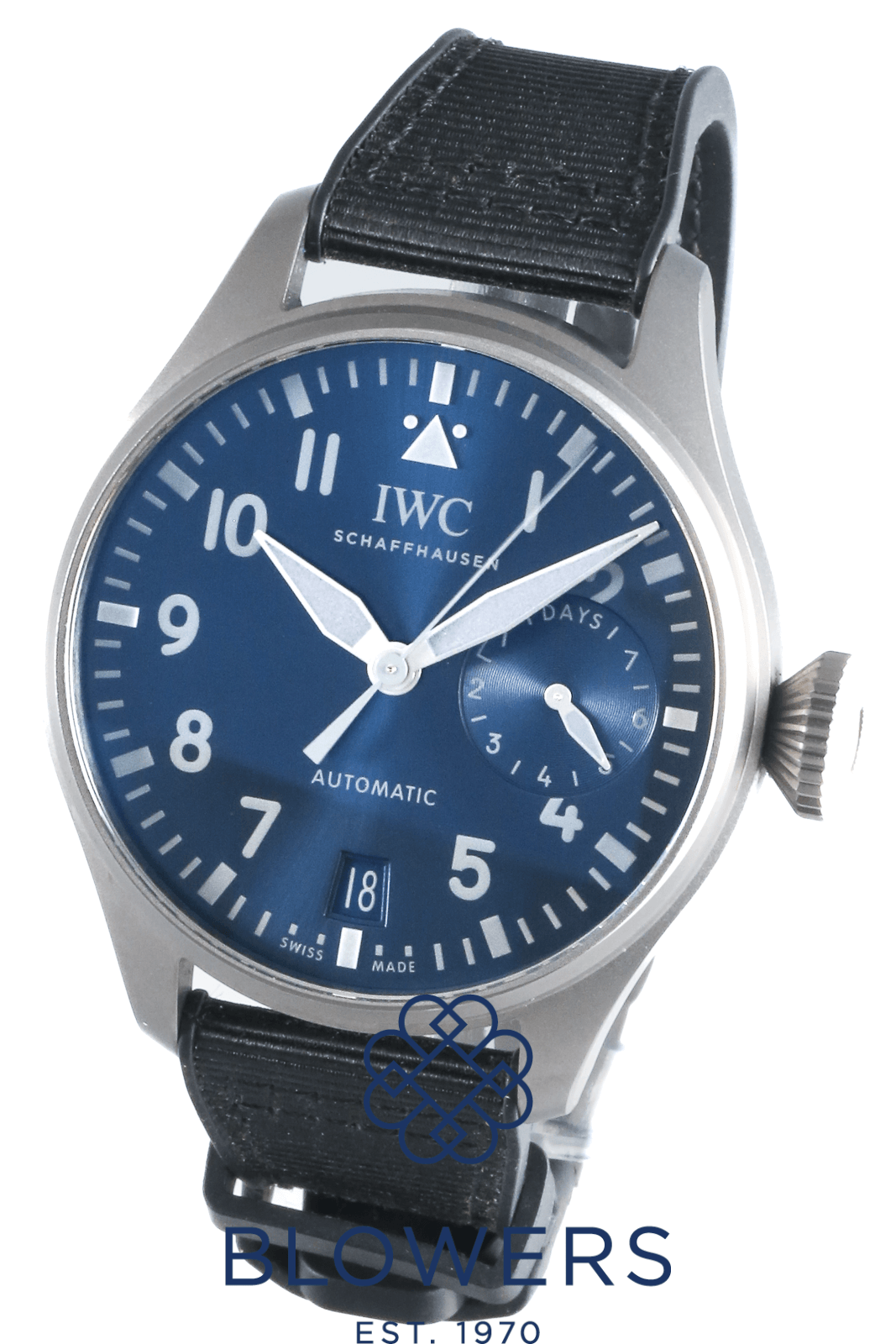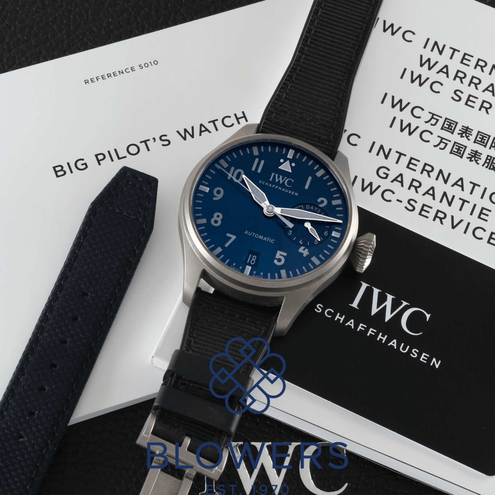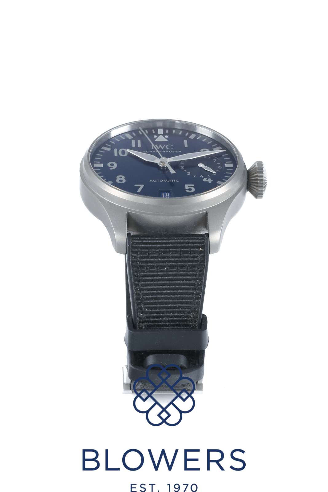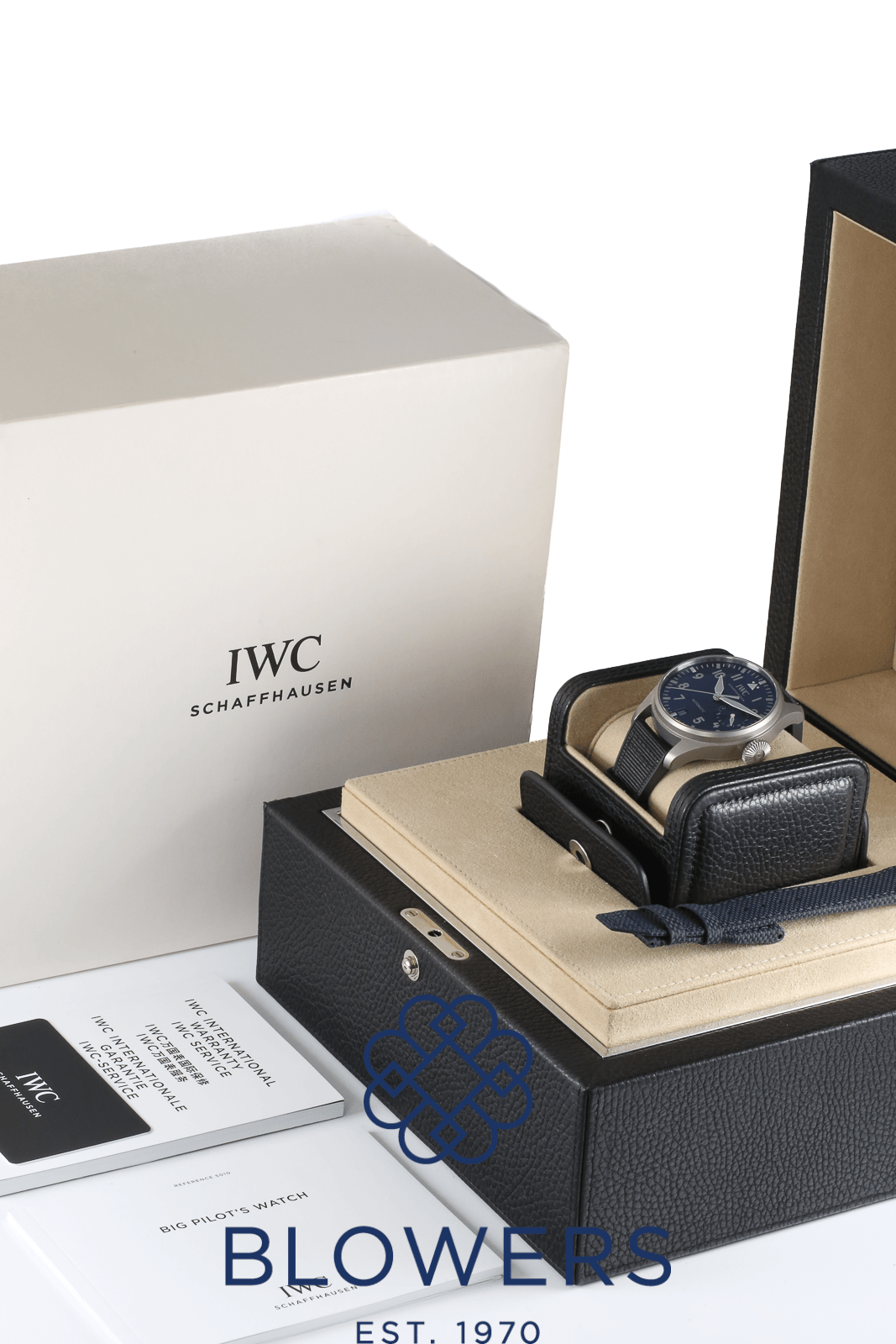 IWC Big Pilot’s Watch Racing Works Edition IW501019. Limited of 500 pieces. Titanium 46mm diameter case with screw-down crown, water resistant up to 60 metres. Self-winding IWC manufacture calibre 52110 movement featuring the Pellaton winding system, 7-day (168 hour) power reserve with power reserve indicator at the 3 o’clock position. Blue dial with Arabic numerals, luminous hour markers and hands. Central hours, minutes and hacking seconds. Date window positioned at 6 o’clock. Sapphire crystal glass. Fitted to a black textile and rubber strap with black stitching and a titanium fold over clasp. Additional blue woven textile strap. Box and papers dated August 2023.