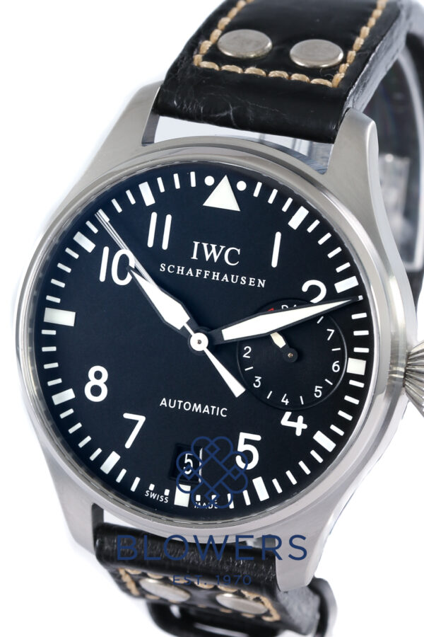 IWC Big Pilots Watch IW5004-01. 46.2mm steel case. Automatic IWC Calibre 51110 Movement. Screw Down Winding Crown Water Resistant Case To 60 Meters. Black Dial With Printed White Numeral Hour Markers And Track Minute Markers. Luminescent hands and quarter markers. Seven Day Power Reserve Indicator Sub-Dial at the 3 o’clock position. Brown Leather Strap With Steel Folding Clasp. Box and papers Dated June 2012. Service papers 2017. (RRP £10,900)