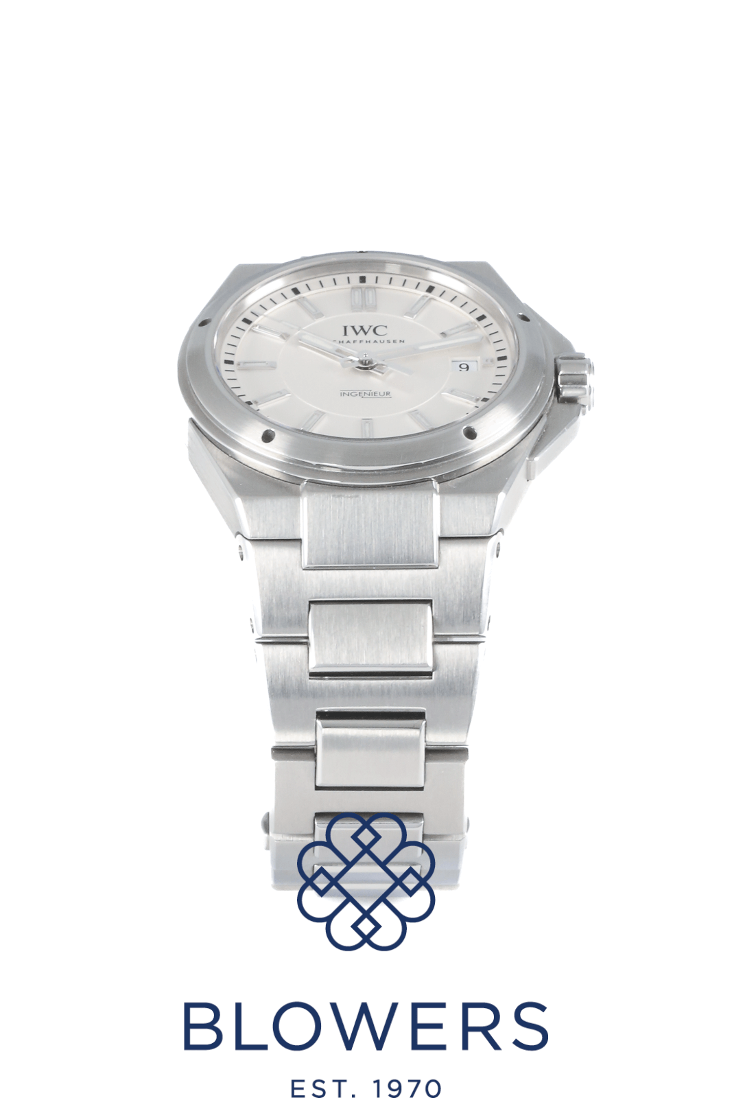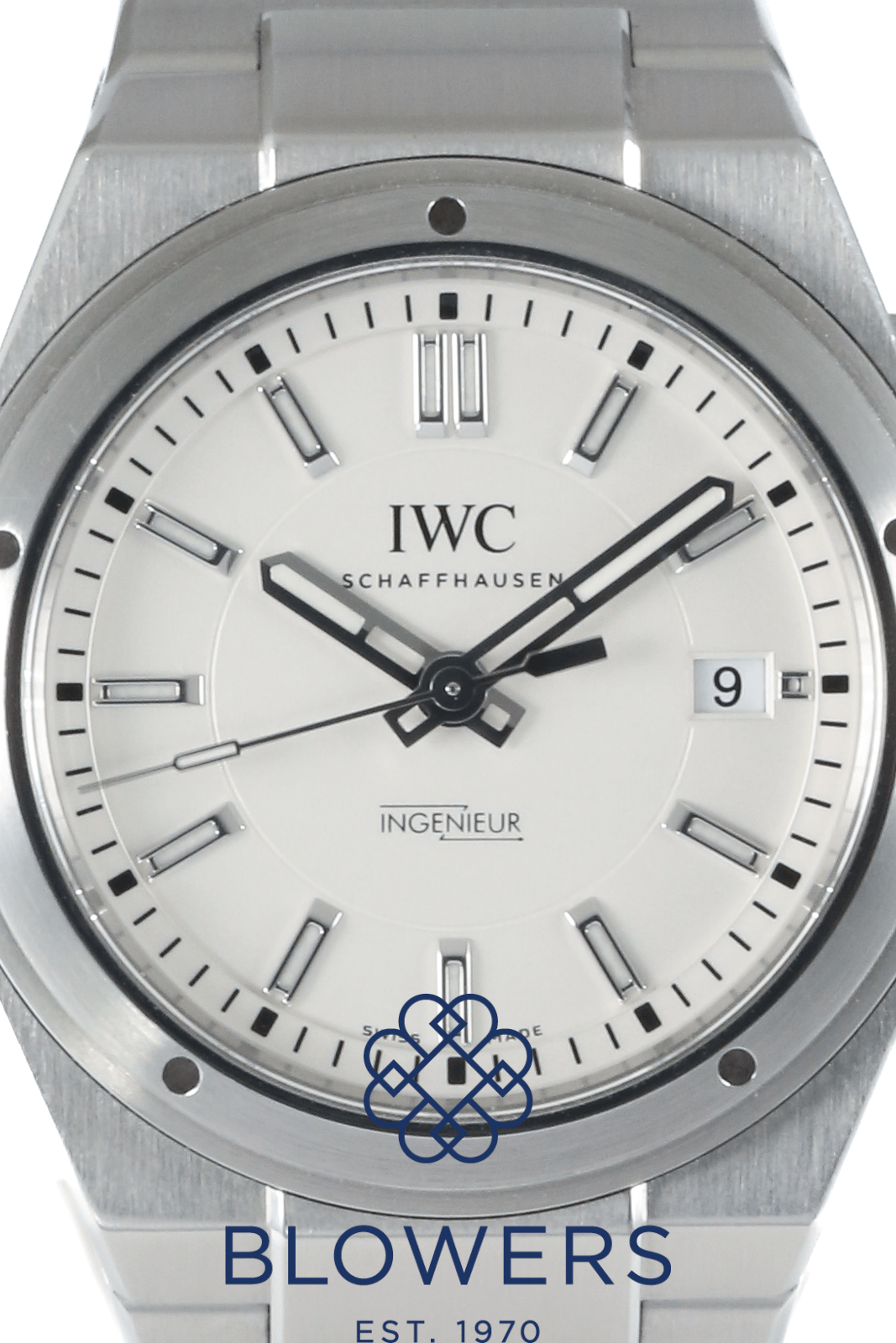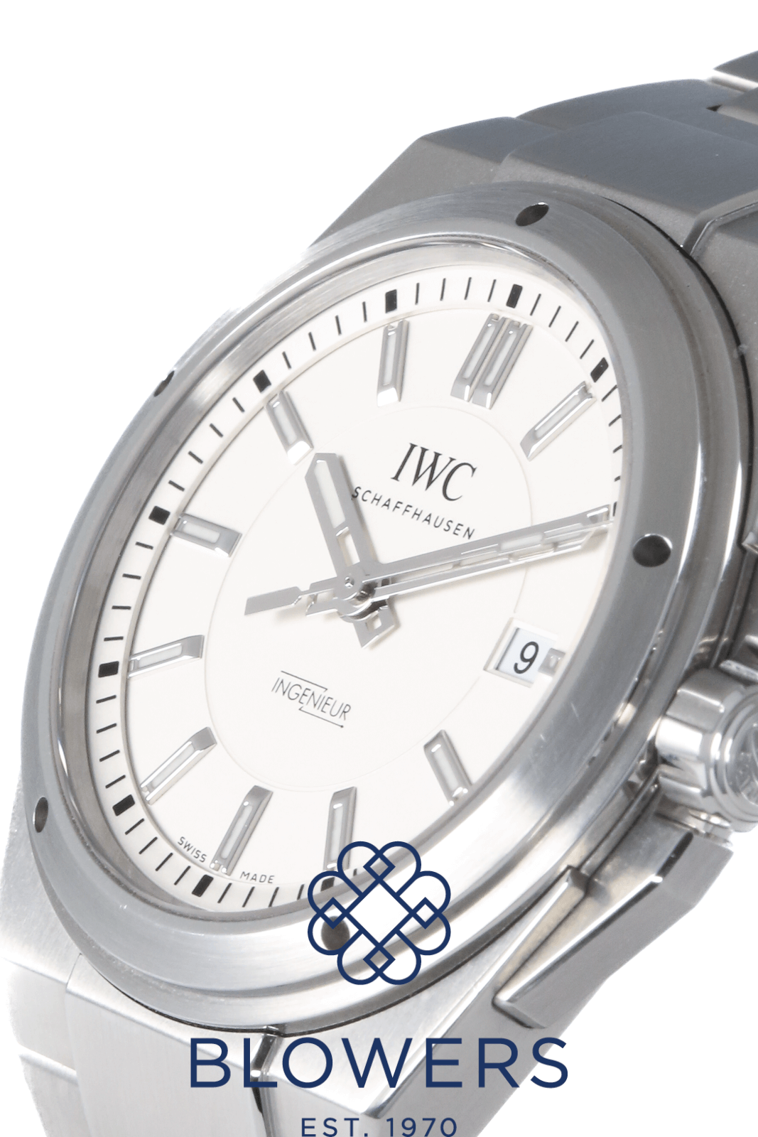 IWC Ingenieur Automatic IW323904. Stainless steel 40 mm diameter case with screw-down crown. Water resistant up to 120 metres (12 ATM). Self-winding automatic calibre 30110 movement with hours, minutes, seconds and date functions. Fixed stainless steel bezel. Silver (white/silver-tone) dial with polished/luminous baton hour markers and sword-style hands, date window at 3 o’clock. Scratch-resistant sapphire crystal glass. Stainless steel integrated bracelet with brushed/satin finish and folding clasp. Box and papers dated May 2015.