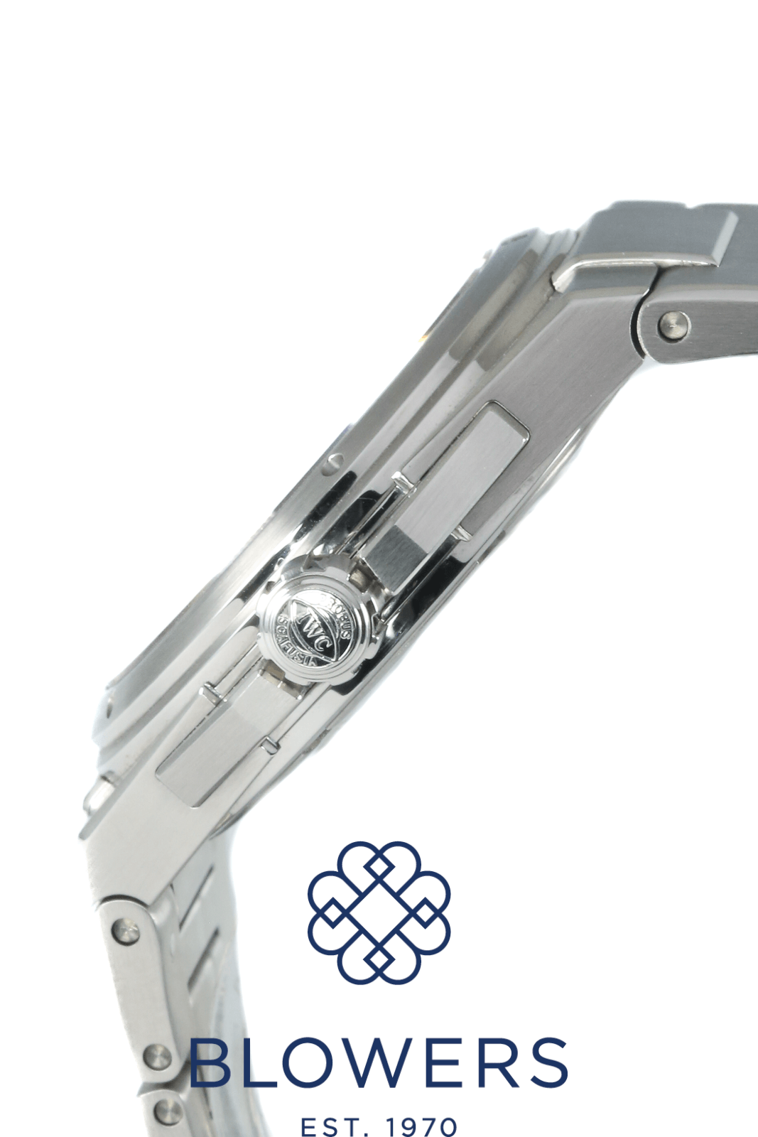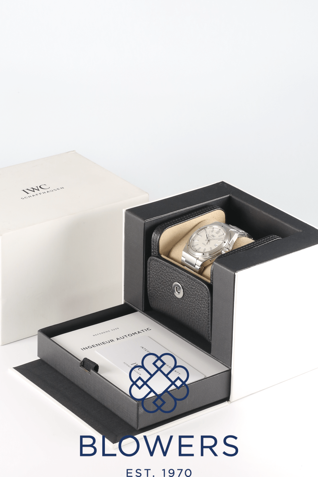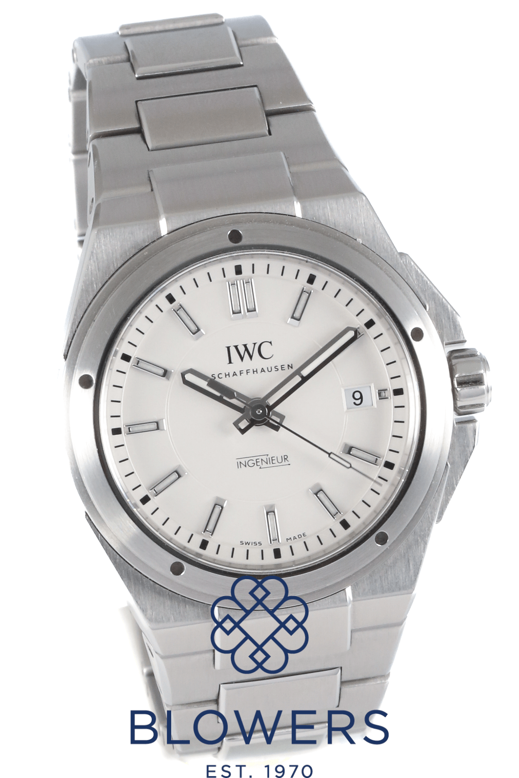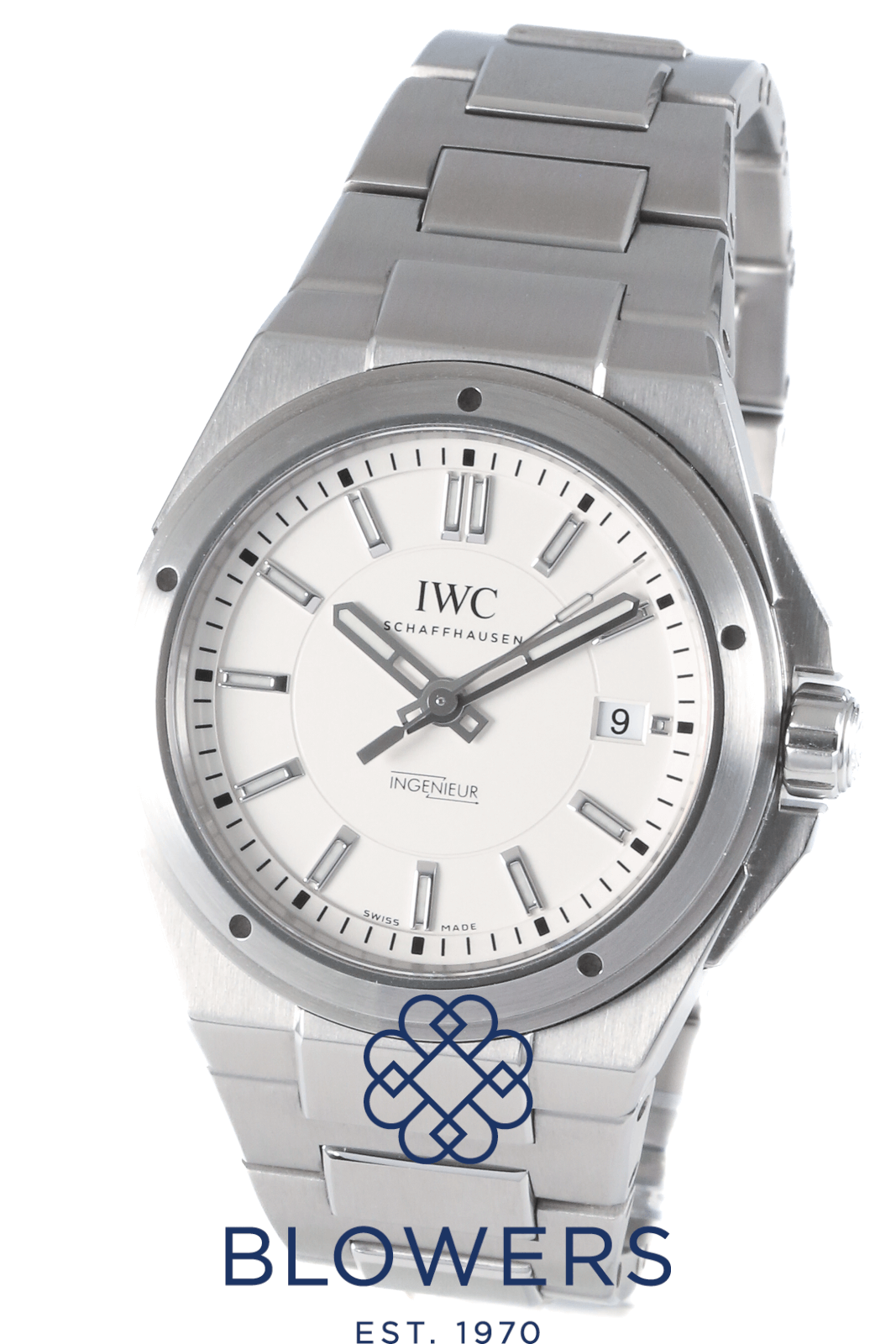 IWC Ingenieur Automatic IW323904. Stainless steel 40 mm diameter case with screw-down crown. Water resistant up to 120 metres (12 ATM). Self-winding automatic calibre 30110 movement with hours, minutes, seconds and date functions. Fixed stainless steel bezel. Silver (white/silver-tone) dial with polished/luminous baton hour markers and sword-style hands, date window at 3 o’clock. Scratch-resistant sapphire crystal glass. Stainless steel integrated bracelet with brushed/satin finish and folding clasp. Box and papers dated May 2015.