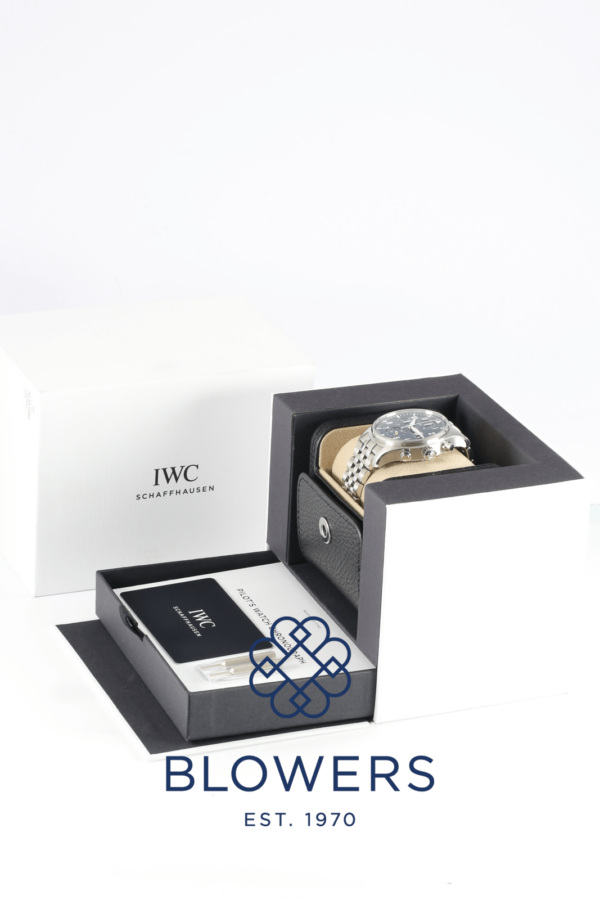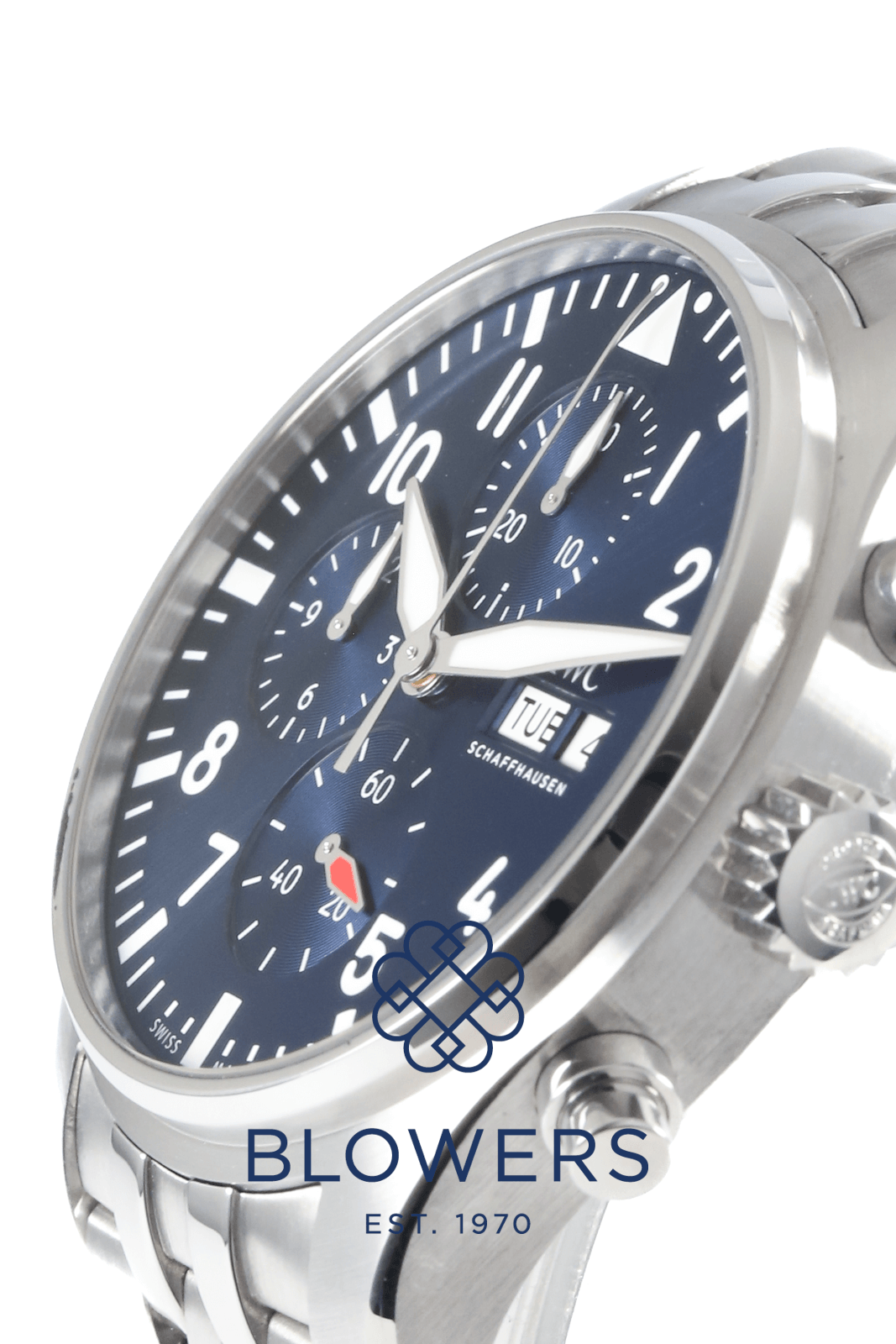 IWC Pilots Chronograph IW378004. Stainless steel case case diameter 43.0 mm x 14.8 mm deep, water resistant to 10 bar/100 metres. Chronograph function with hours, minutes and seconds. Automatic IWC calibre 69385 movement, 46-hour power reserve, 33 jewels. Sapphire glass. Blue dial with silver numeral hour markers, silver outer minute markers, day and date display.Stainless steel folding clasp with EasX-CHANGE system, Strap width 21.0 mm. Box and papers dated May 2023.