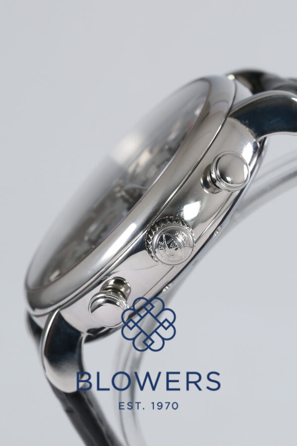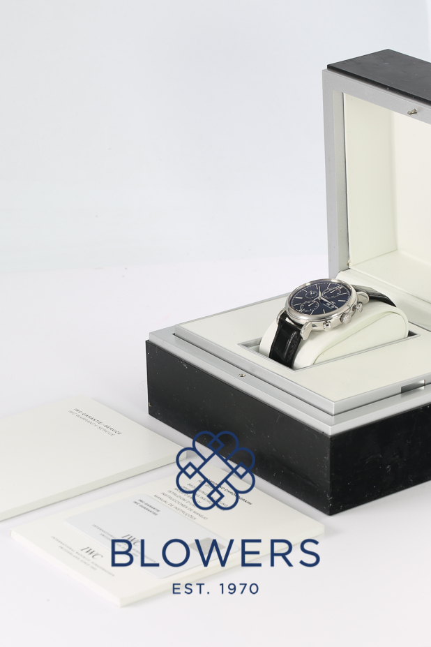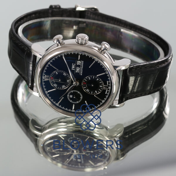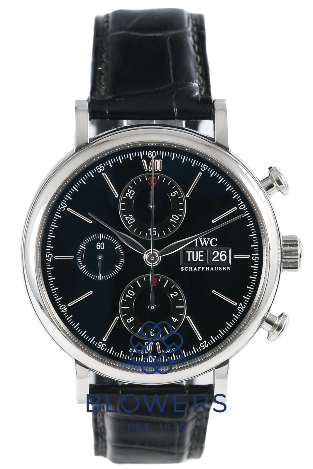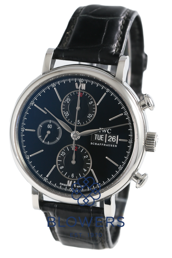 IWC Portofino Chronograph IW391002. 42mm diameter Stainless Steel case, which is water resistant to a depth of 30 meters. Automatic IWC calibre 75320 movement 25 jewels, 28,800 vph, power reserve of 44 hours. Black dial with index hour markers, 3 Silver sub dials. Sapphire glass, with anti-reflective coating. Day & Date window displayed at the 3 o’clock position. Black alligator leather strap. Box and Papers dated January 2012.