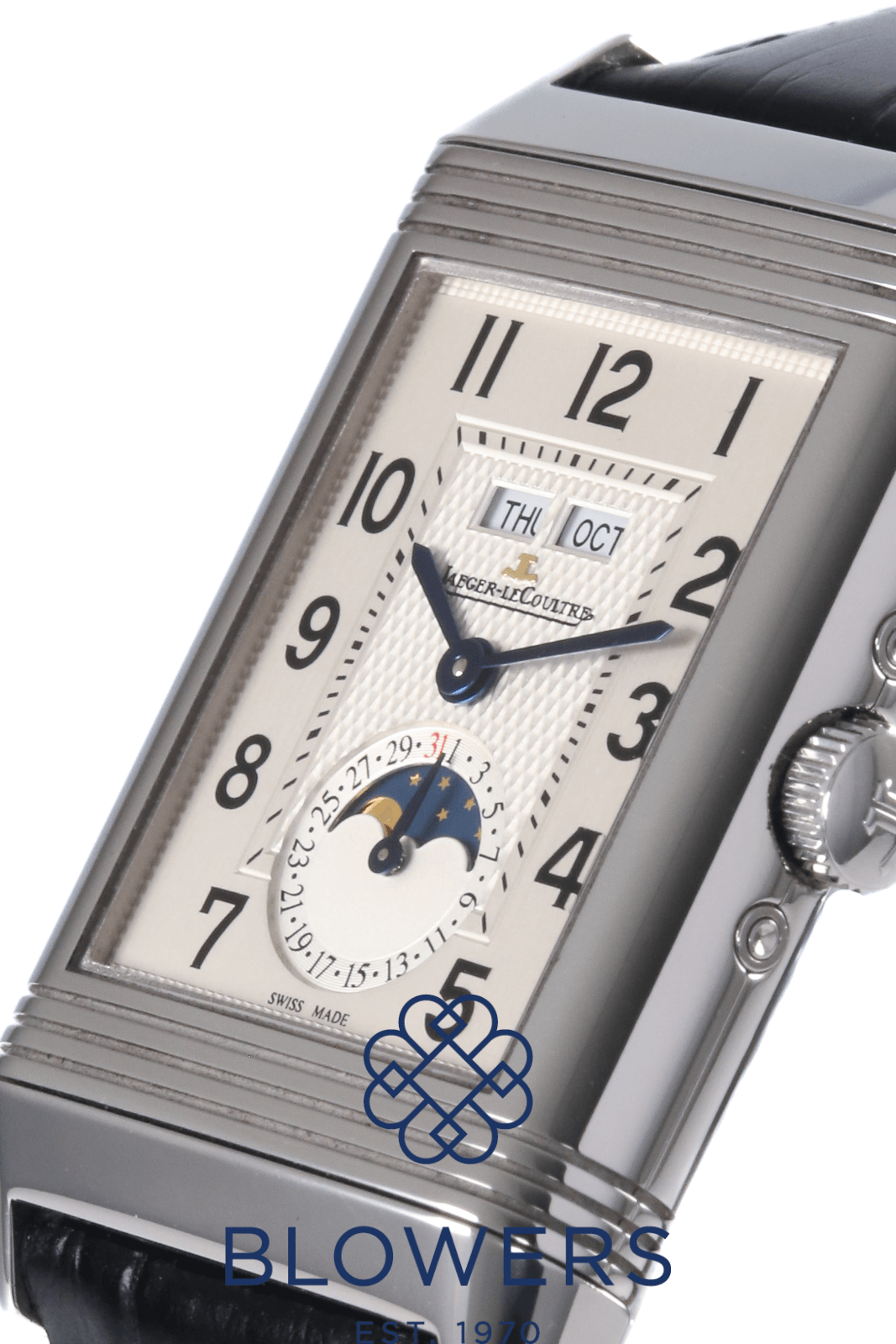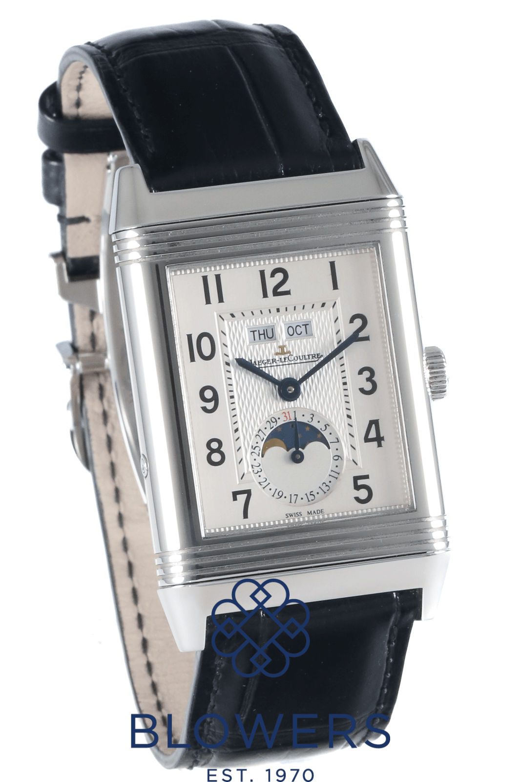 Jaeger-Lecoultre Reverso Calendar 273.8.84. JLC Calibre 843 Handwound Movement. 41.6mm X 30mm Case, Including Lugs. Water Resistant To 30 Metres. Silver Guilloche Dial With Arabic Numerals, Day And Date Display At 12 O’clock Position. Sub Dial At 6 Position With Day And Night Display. 45 Hour Power Reserve. Sapphire Crystal Glass. Black Alligator Leather Strap With Deployment Clasp. Box and papers dated March 2015. Service papers dated April 2022.
