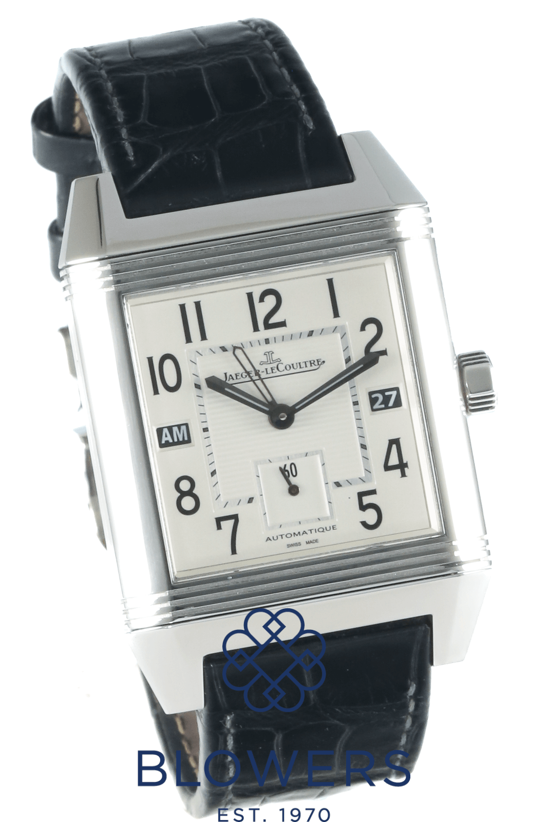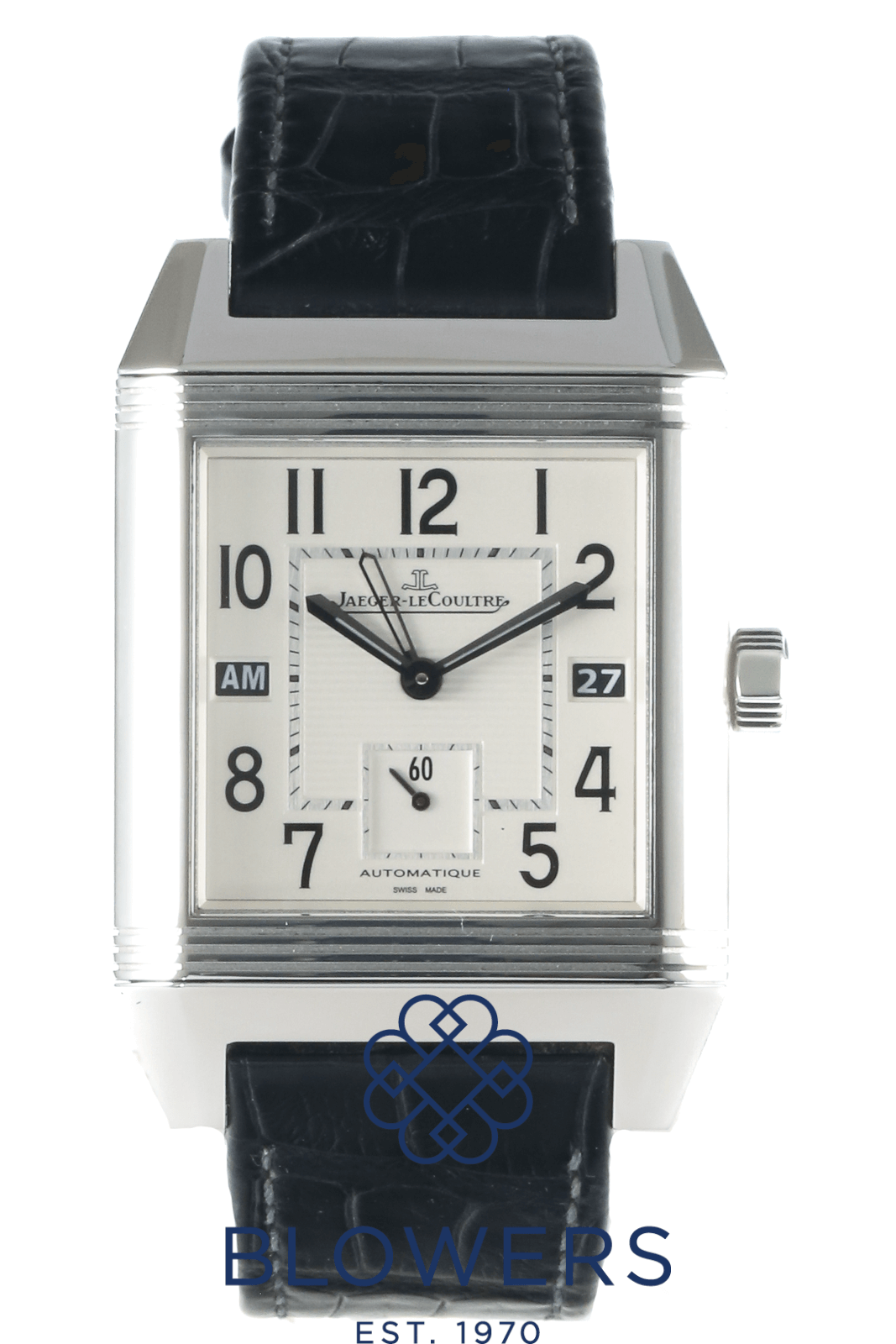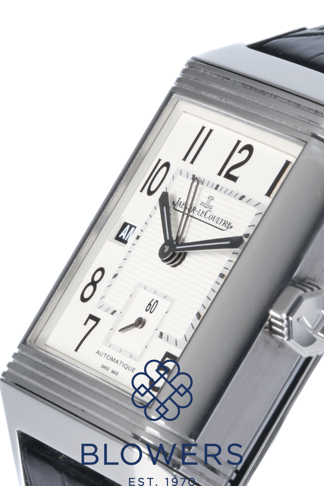 Jaeger-LeCoultre Reverso Squadra Hometime 230.8.77. Stainless steel reversible case measuring approximately 35mm x 50mm, featuring a signature rectangular design. Water resistant to 50 metres. Self-winding Jaeger-LeCoultre calibre 977 movement with a 45-hour power reserve, displayed through an exhibition case back on the reverso feature. Silvered dial with large Arabic numerals, luminescent hands, and a dual-time “Hometime” display. Day/night indicator located at the 9 o’clock position and a date window positioned at 3 o’clock. Sapphire crystal glass. Fitted on a black leather strap with a double-folding clasp. Box and papers dated August 2012. Service papers dated March 2015.