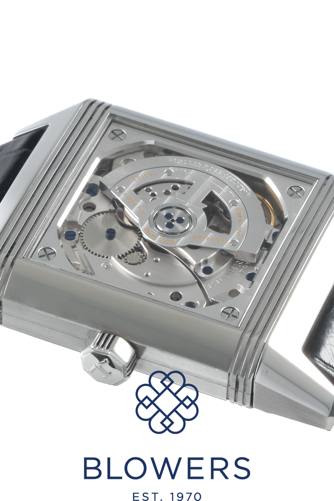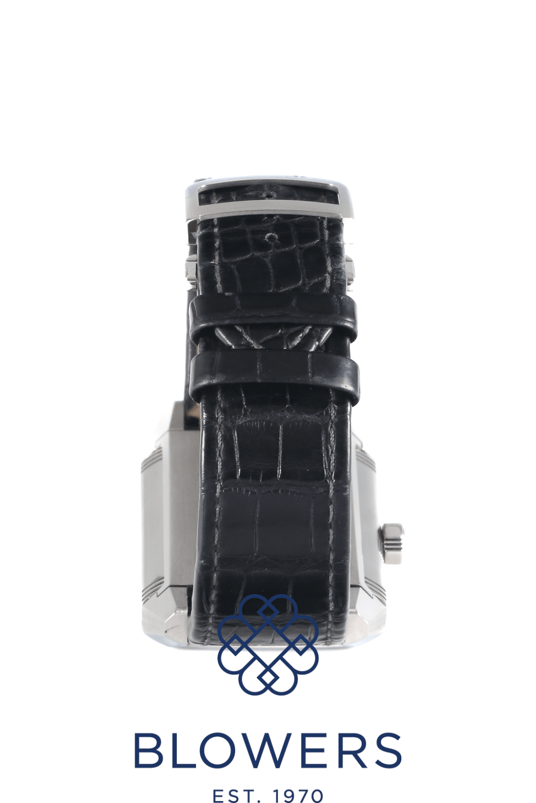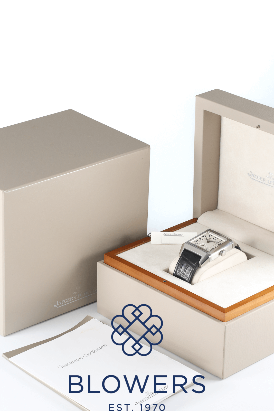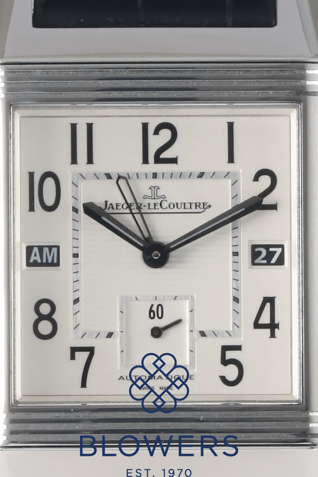 Jaeger-LeCoultre Reverso Squadra Hometime 230.8.77. Stainless steel reversible case measuring approximately 35mm x 50mm, featuring a signature rectangular design. Water resistant to 50 metres. Self-winding Jaeger-LeCoultre calibre 977 movement with a 45-hour power reserve, displayed through an exhibition case back on the reverso feature. Silvered dial with large Arabic numerals, luminescent hands, and a dual-time “Hometime” display. Day/night indicator located at the 9 o’clock position and a date window positioned at 3 o’clock. Sapphire crystal glass. Fitted on a black leather strap with a double-folding clasp. Box and papers dated August 2012. Service papers dated March 2015.