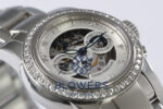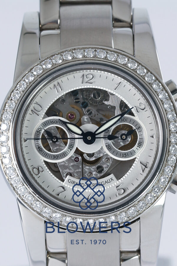 Girard Perregaux Skeleton Ref: 8046. Steel case, diameter 32mm. Diamond bezel. Skeleton dial with Arabic numerals and sub dials at potions 3 and 9. Movement: Cal. 3080, rhodium-plated, fausses cotes and oeil-de-perdrix decoration, 38 jewels, straight-line lever escapement, monometallic balance, shock absorber, self-compensating flat balance spring. Movement signed Sapphire crystal see through case back. Steel bracelet with concealed double folding clasp. Box and papers dated 2005.