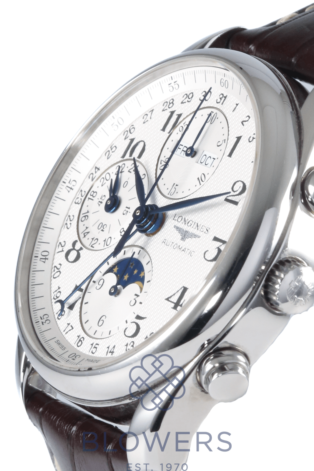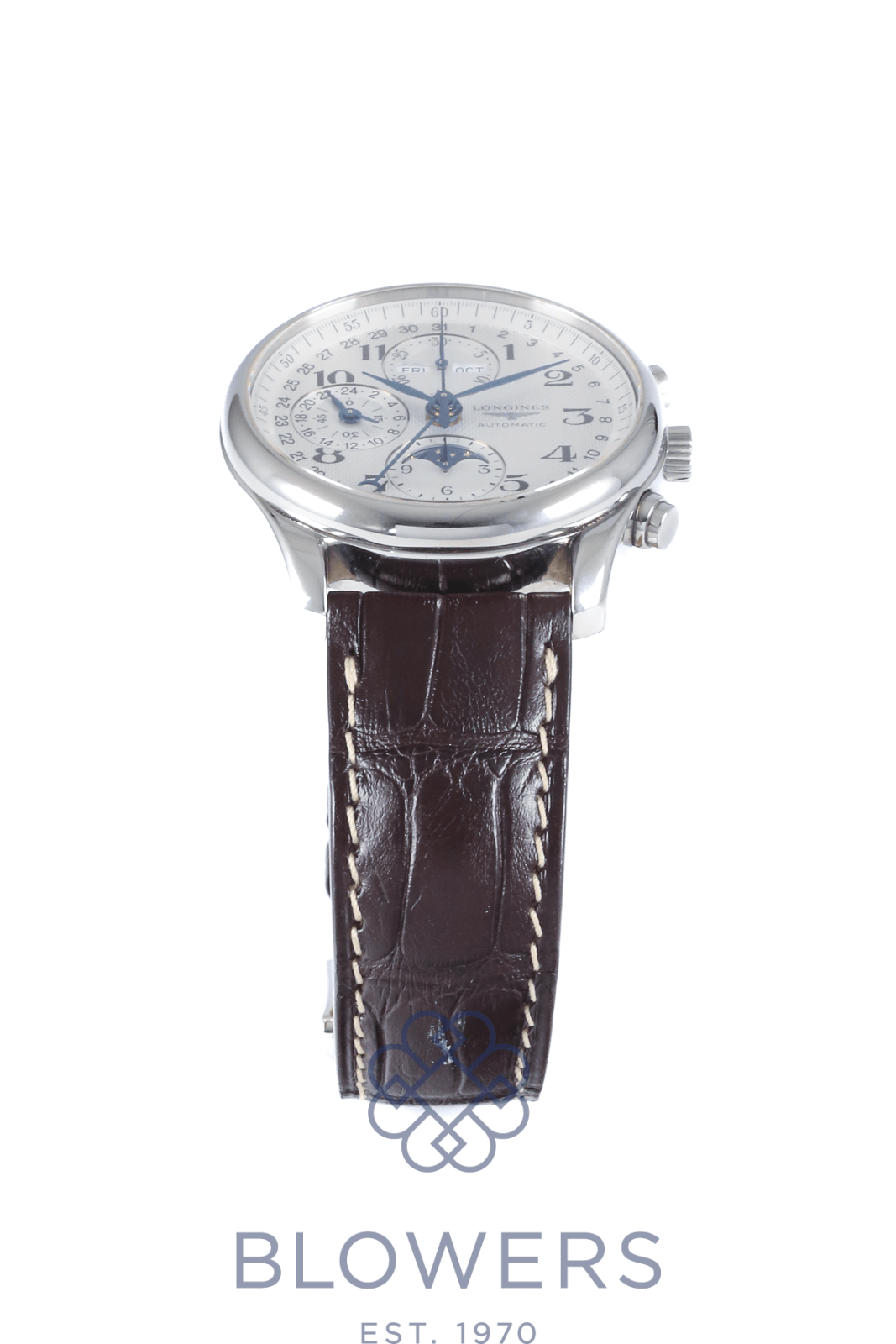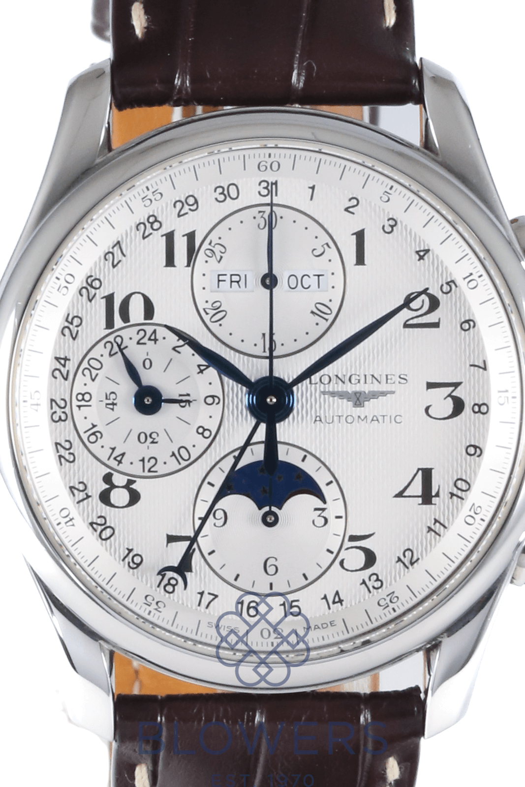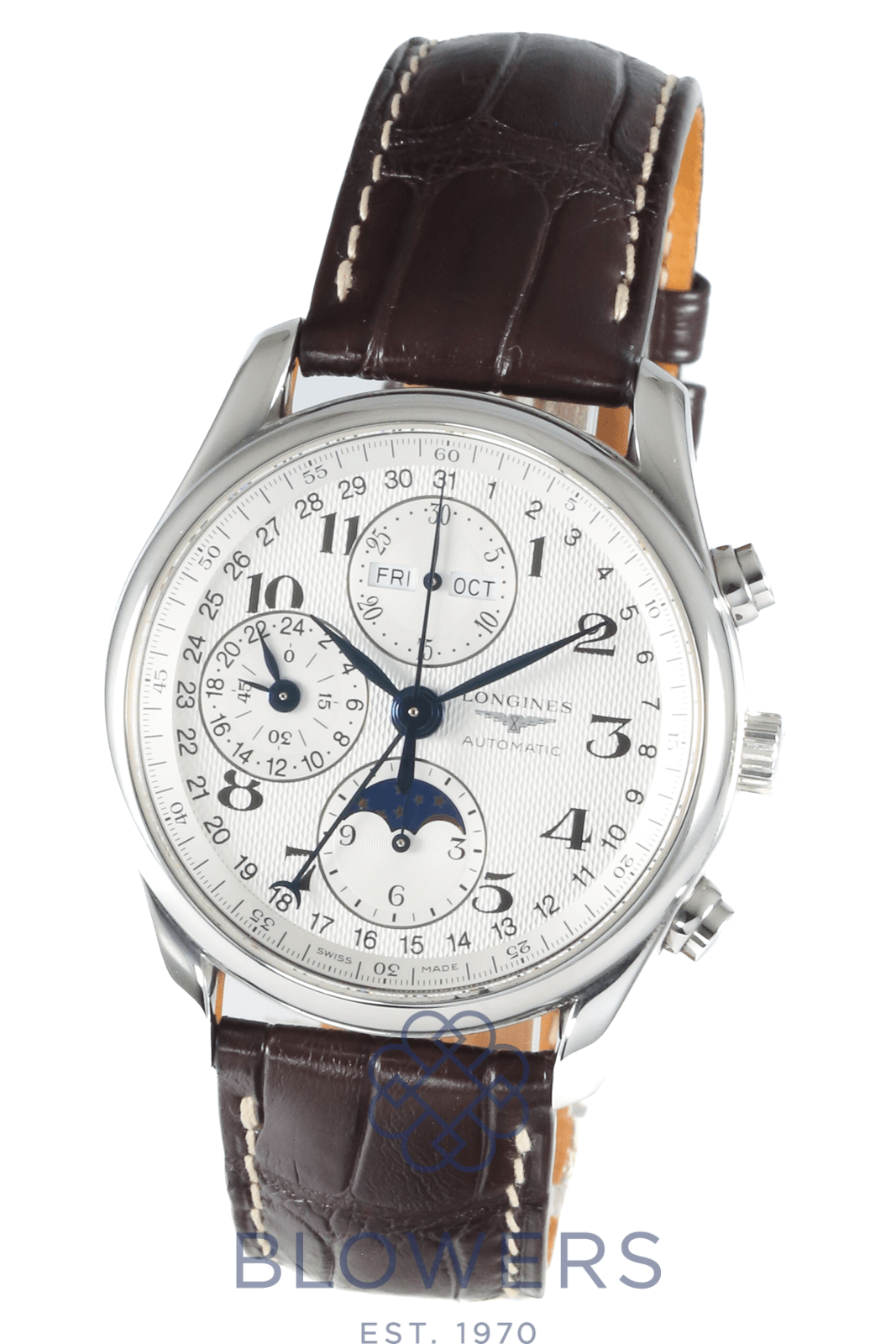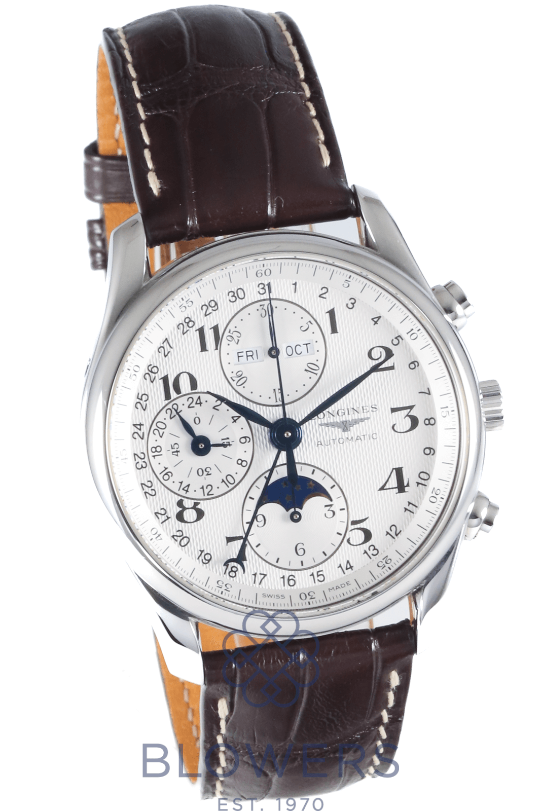 Longines Master Collection L2.673.4.78.2. Automatic movement. 40mm steel case. Silver barleycorn dial with Arabic numerals. Chronograph with moonphase, day and month aperture at 12 o’clock, small seconds with 24-hour indicator at 9 o’clock, moonphase display at 6 o’clock. On a Brown Croc leather strap with folding clasp. Comes with an additional Brown Croc strap. Box & Papers September 06.