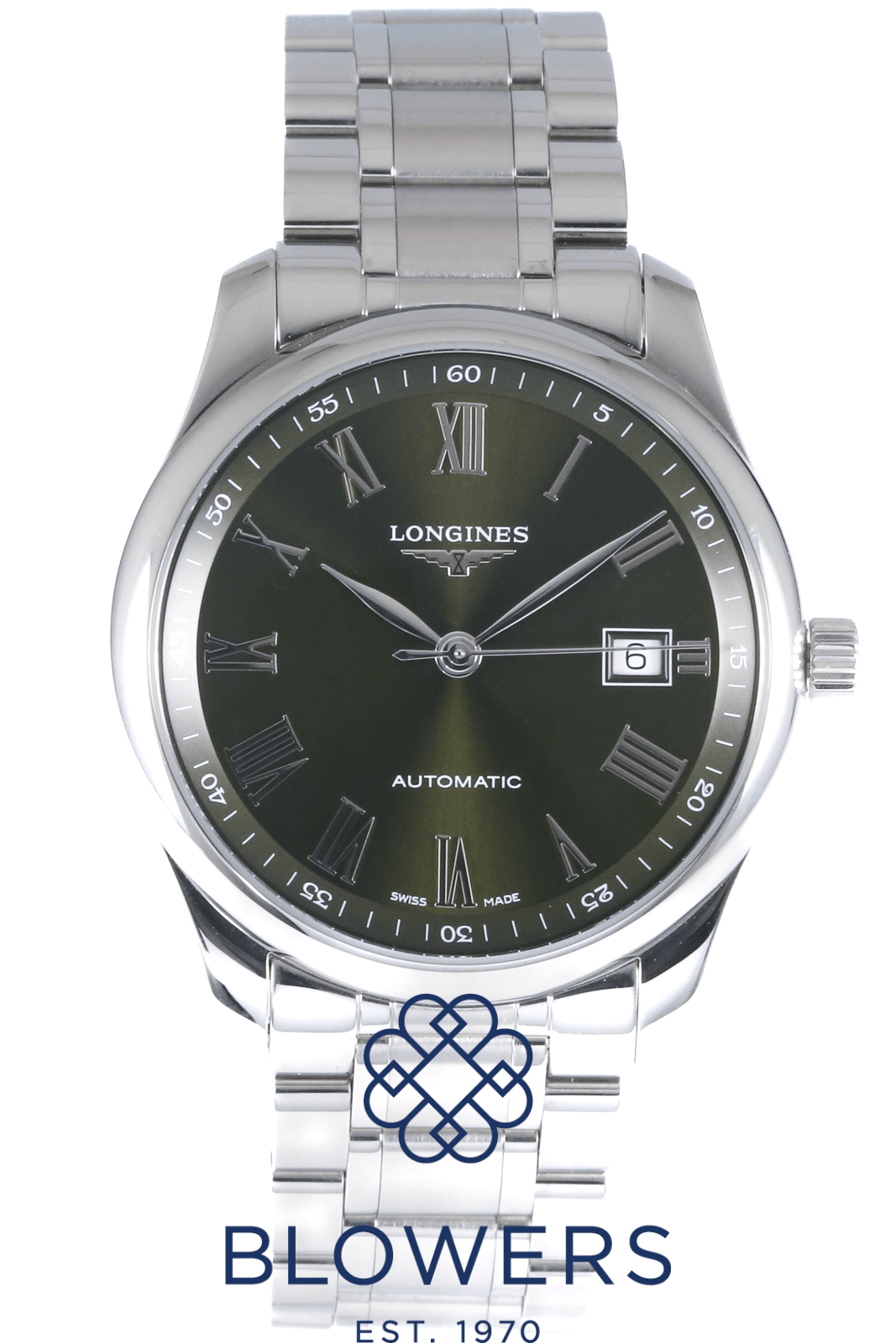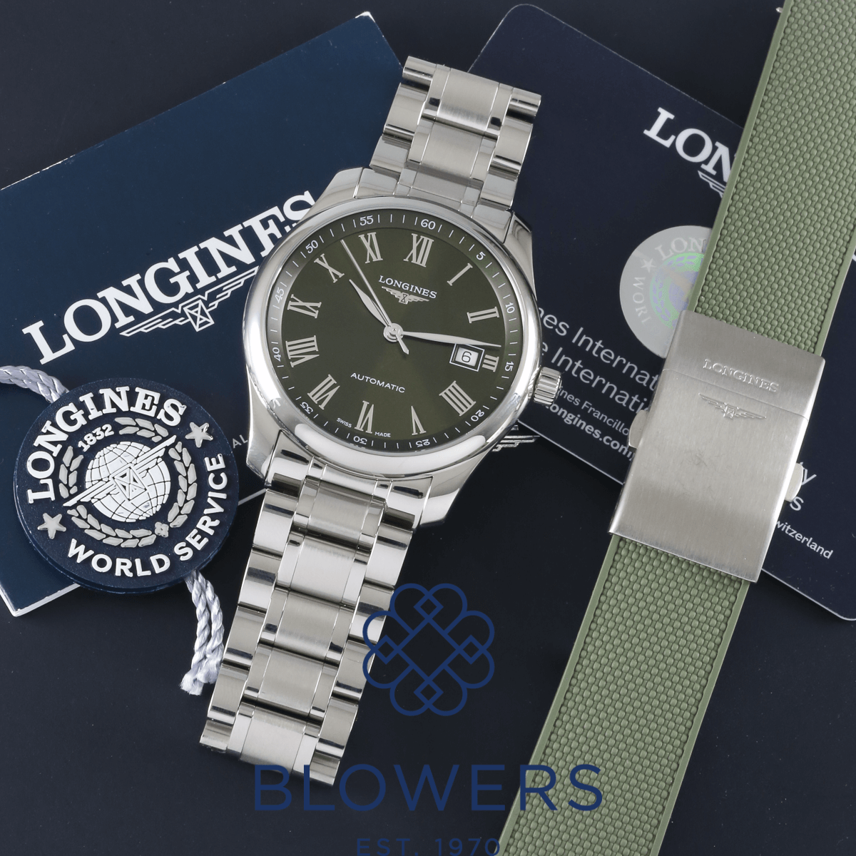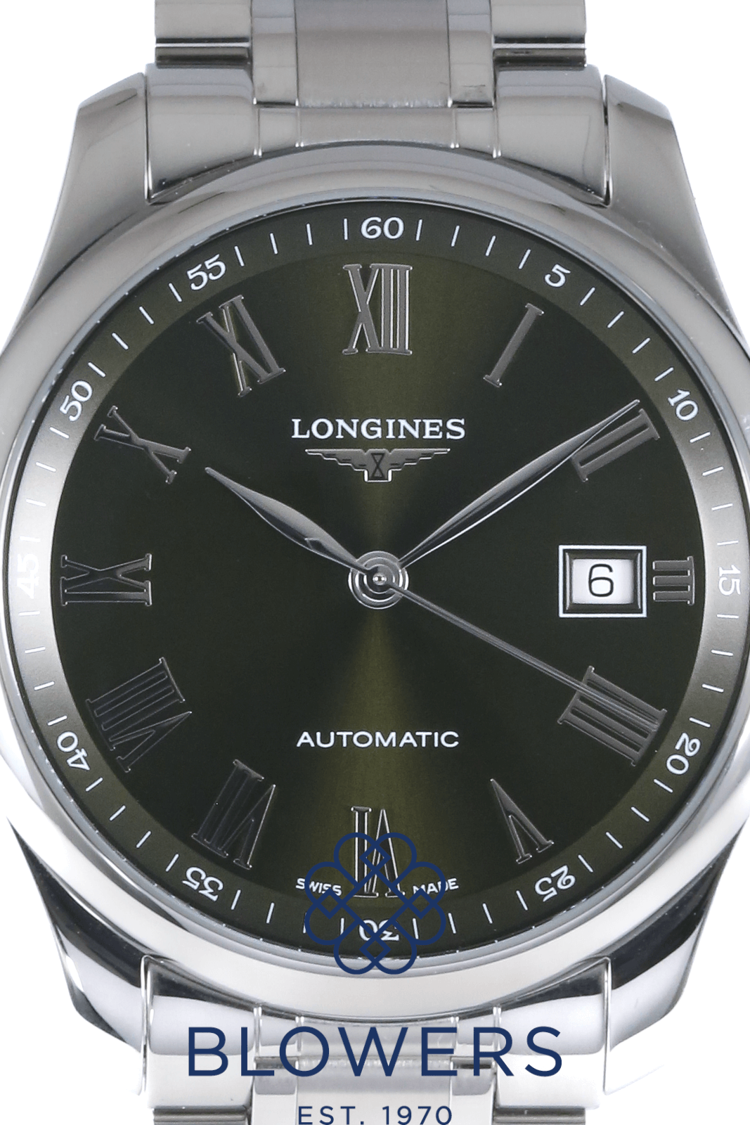 Longines Master L2.793.4.09.6. 40mm steel case, water resistant to 30 meters. Automatic L888 calibre movement featuring a 72 hour power reserve. Green dial with applied Roman numerals. Central hours, minutes and seconds hands. A date window at three o’clock. White outer minutes track with Arabic numerals. Smooth domed bezel. Steel bracelet with a double fold clasp. Comes with an additional green rubber strap with folding clasp. Box and papers dated June 2024.
