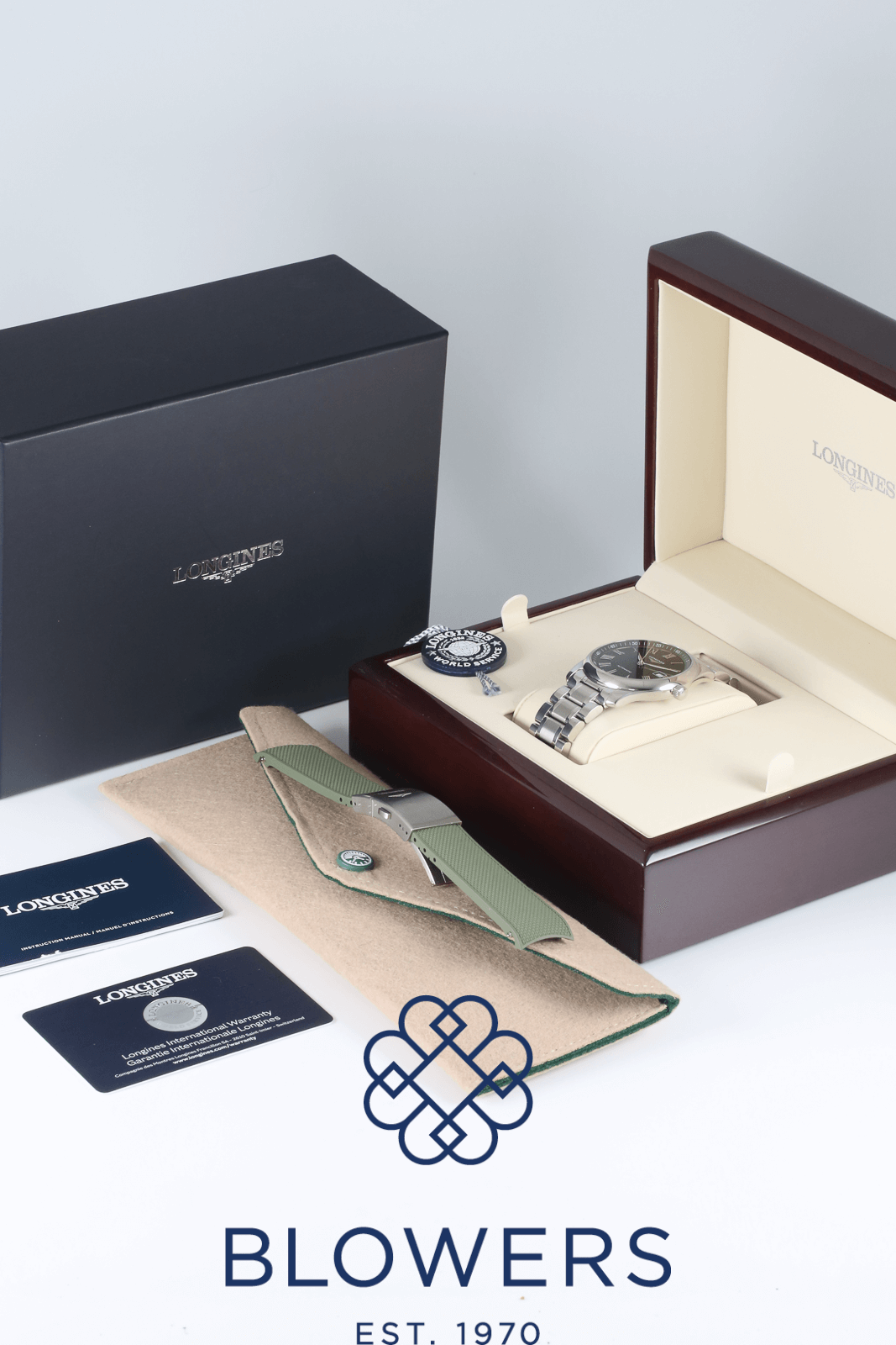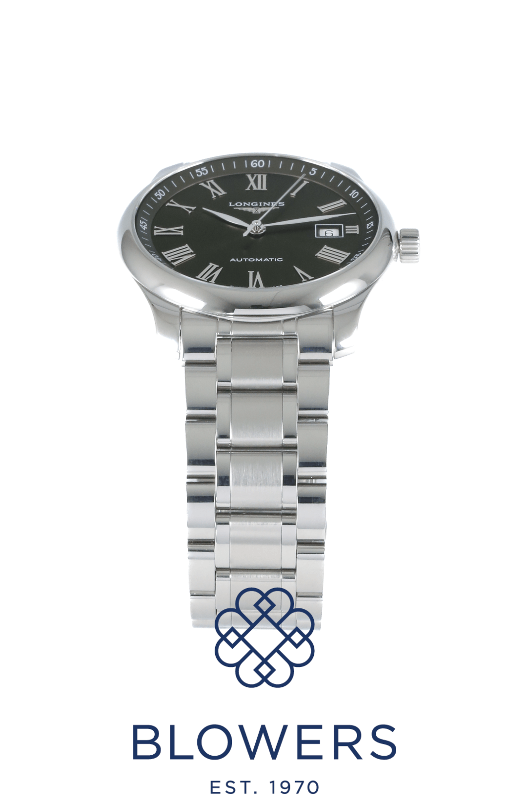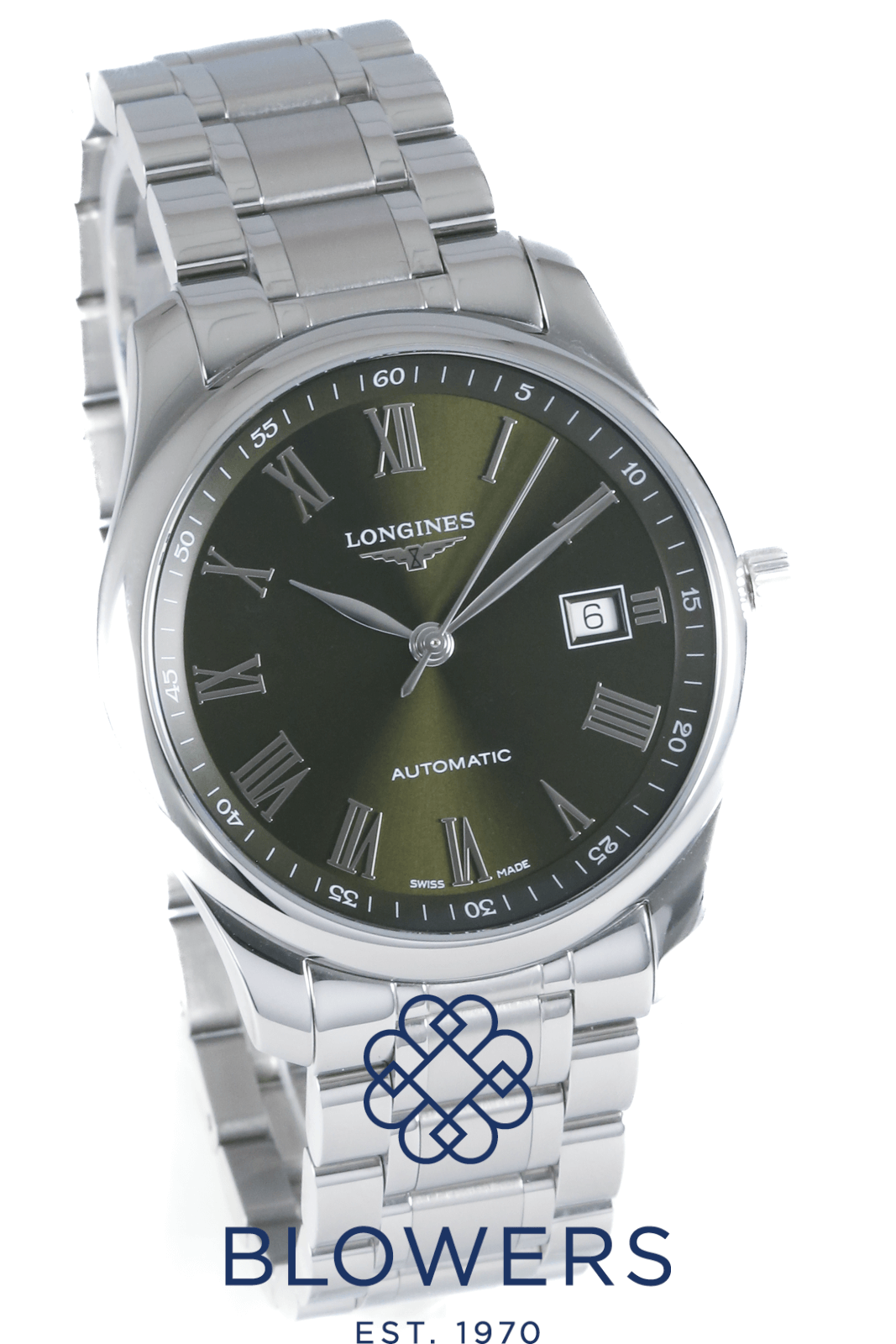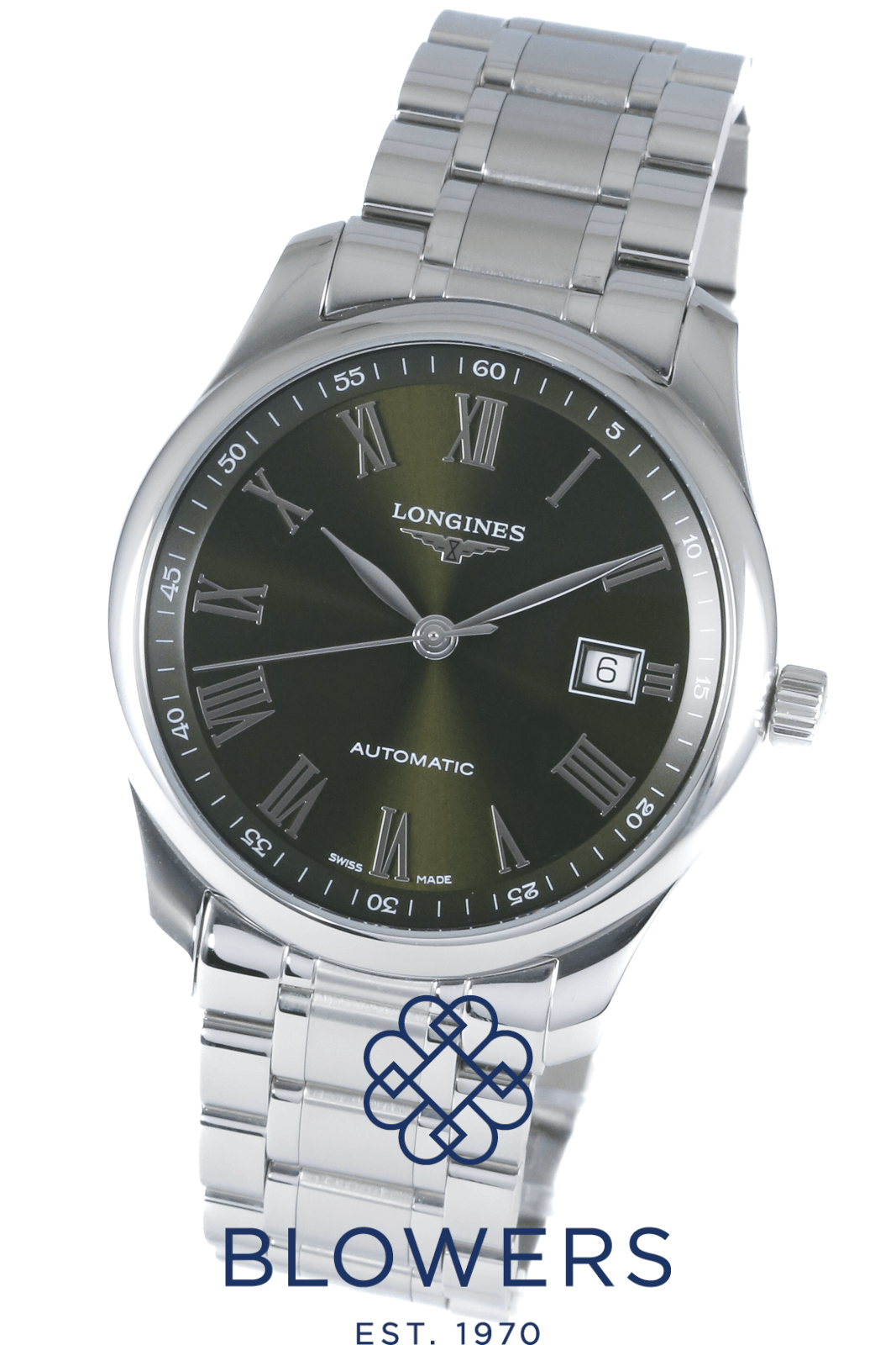 Longines Master L2.793.4.09.6. 40mm steel case, water resistant to 30 meters. Automatic L888 calibre movement featuring a 72 hour power reserve. Green dial with applied Roman numerals. Central hours, minutes and seconds hands. A date window at three o’clock. White outer minutes track with Arabic numerals. Smooth domed bezel. Steel bracelet with a double fold clasp. Comes with an additional green rubber strap with folding clasp. Box and papers dated June 2024.