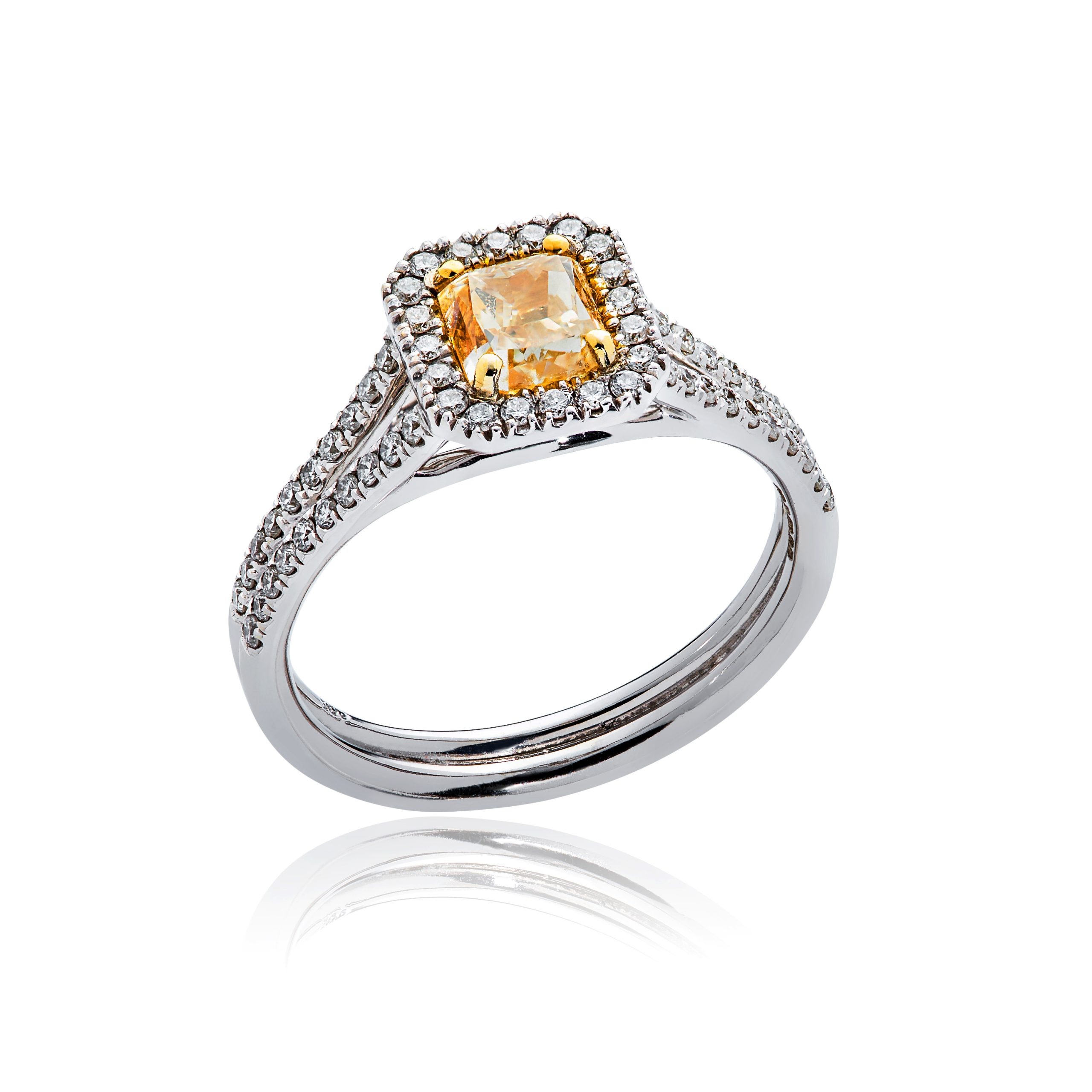 18ct White gold natural yellow diamond cocktail ring surrounded with diamonds.