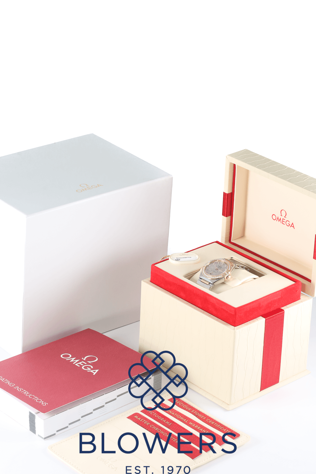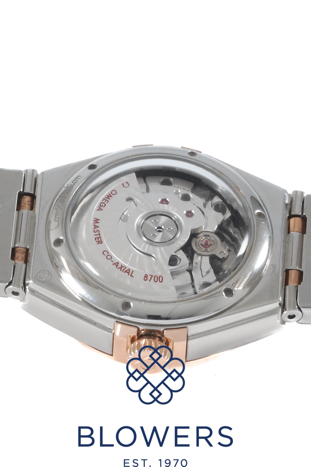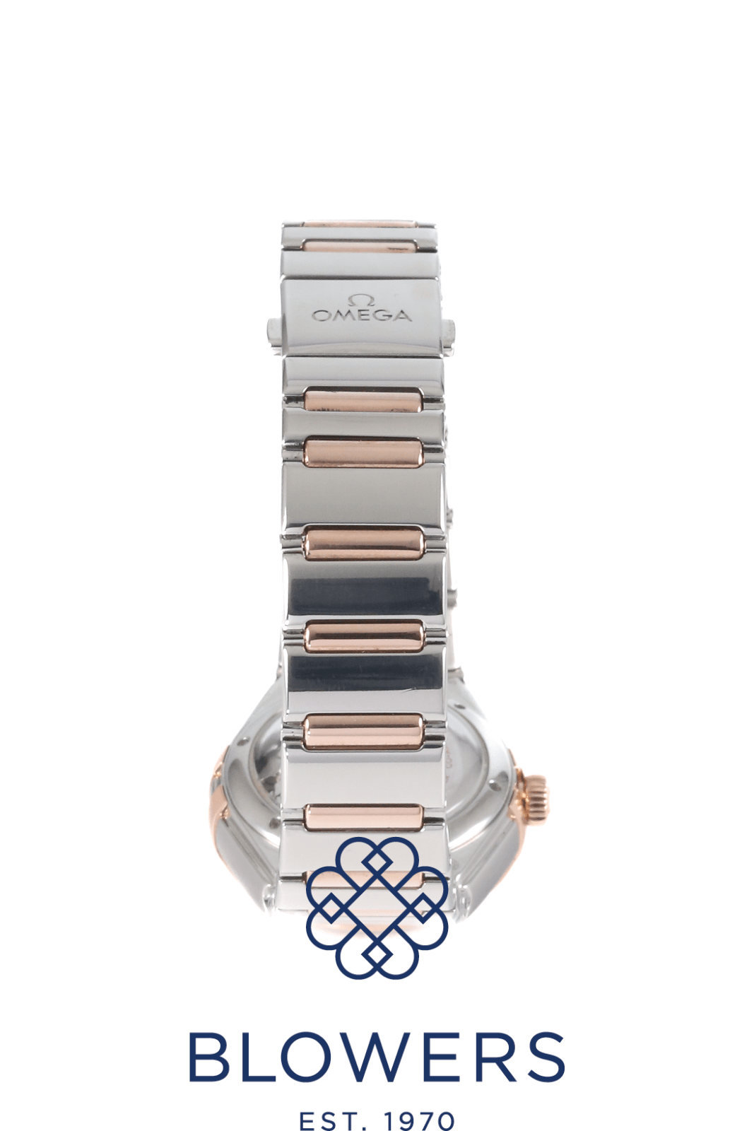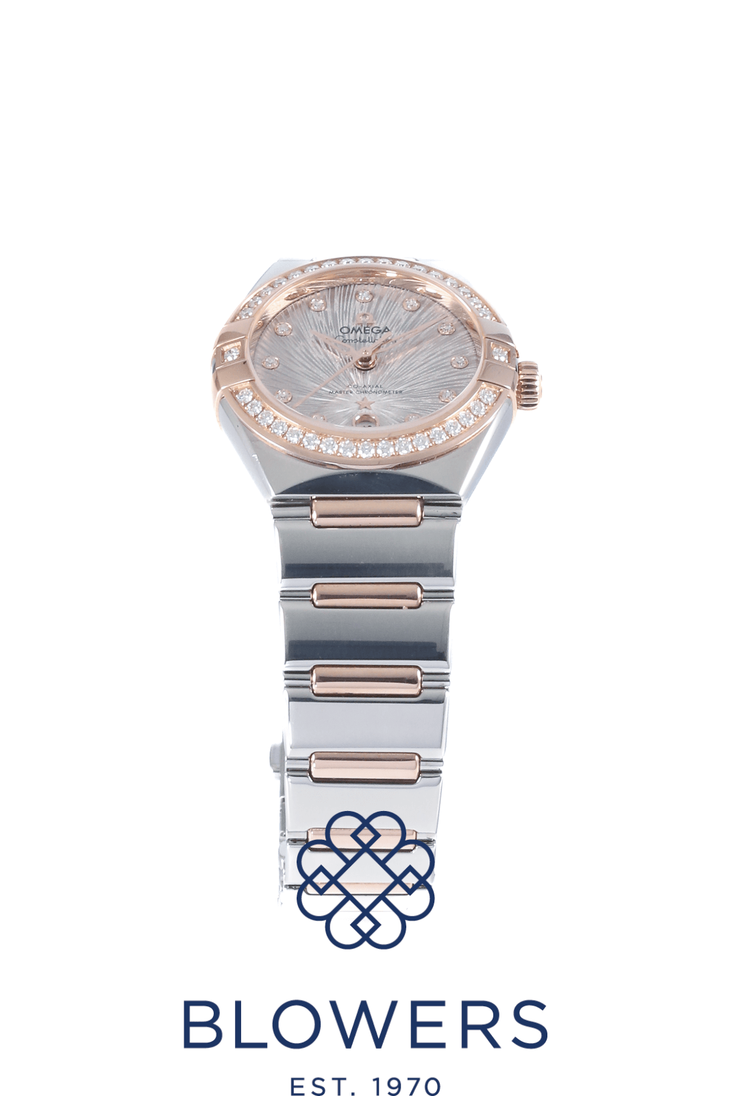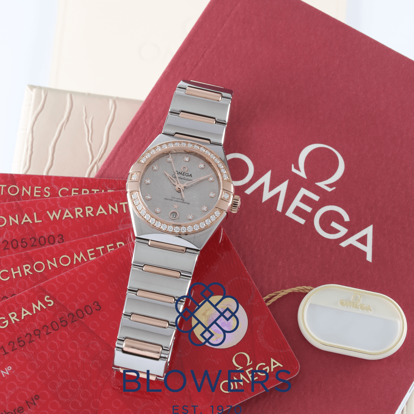 Omega Constellation Co-Axial Master Chronometer 131.25.29.20.52.003. Stainless steel and 18ct Moonshine™ gold 29mm diameter case. Water resistant up to 50 metres. Self-winding Co-Axial Master Chronometer calibre 8700 movement, certified by METAS, with a 55 hour power reserve and resistance to magnetic fields up to 15,000 gauss. Fixed 18ct Moonshine™ gold bezel set with diamonds. Aventurine glass dial with applied Moonshine™ gold Roman numerals and diamond hour markers. Central hours, minutes and seconds hands. Date window located at the 6 o’clock position. Domed scratch-resistant sapphire crystal with anti-reflective treatment on both sides. Integrated stainless steel and 18ct Moonshine™ gold bracelet with butterfly folding clasp. Box and papers dated October 2024.
