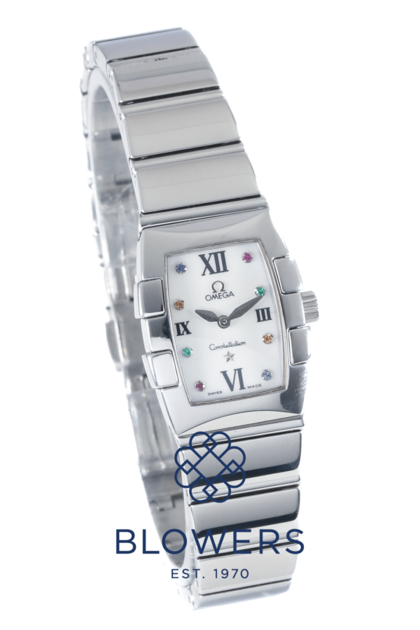 Omega Constellation Quadrella 1584.79.00. Quartz precision movement Omega 1376. Case diameter 25.3 x 19.3 mm. Water resistant to 30 metres. White mother-of-pearl dial with roman numerals and multi coloured gem hour markers behind a domed, scratch-resistant sapphire crystal with anti-reflective treatment inside. Steel bracelet with butterfly clasp. Box and papers dated May 2010.