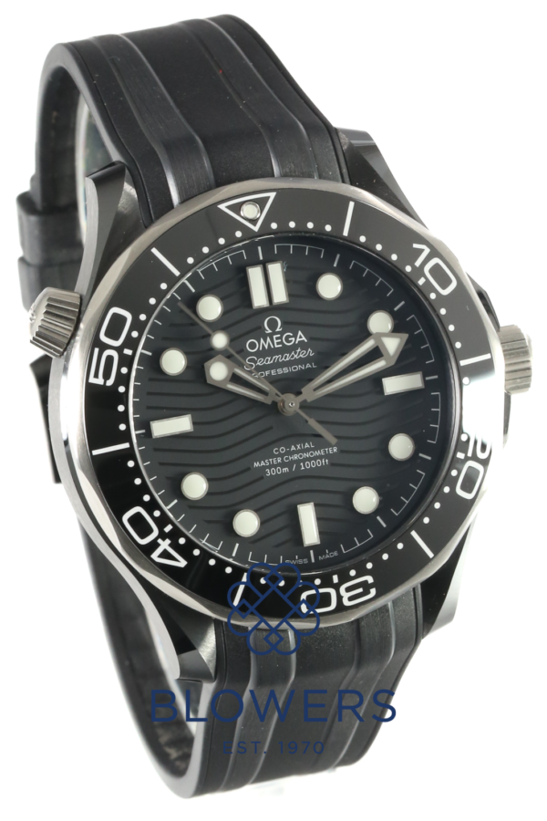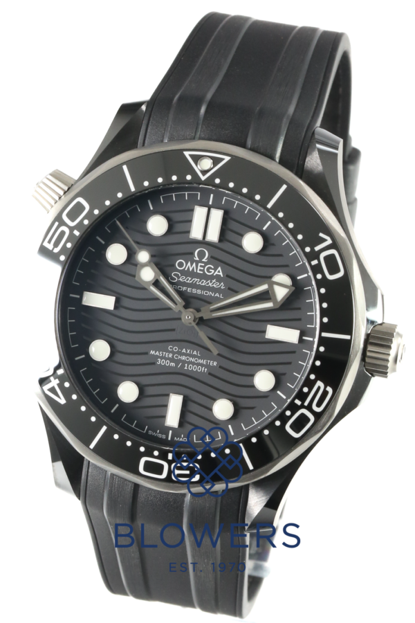 Omega Seamaster Diver 210.92.44.20.01.001. 43.5mm diameter black ceramic casing, which is water resistant to 300 meters. Sustained by the automatic, Omega calibre 8806 movement of 55 hours, featuring a co-axial escapement. Helium escape valve at 10 o’clock. Featuring a black wave pattern dial with titanium raised applied luminous hour markers and numerals, luminous skeleton hour and minute hands, lollipop second hand. Titanium uni-directional bezel, with a ceramic 60 minute graduation scale insert. Transparent sapphire crystal case back. Upon a Black Rubber Strap, Ceramic Pin Buckle. Features include anti-magnetic, chronometer, master chronometer certified, helium escape valve, screw-in crown, transparent caseback, unidirectional rotating bezel. Complete with its box and papers, dated March 2021.