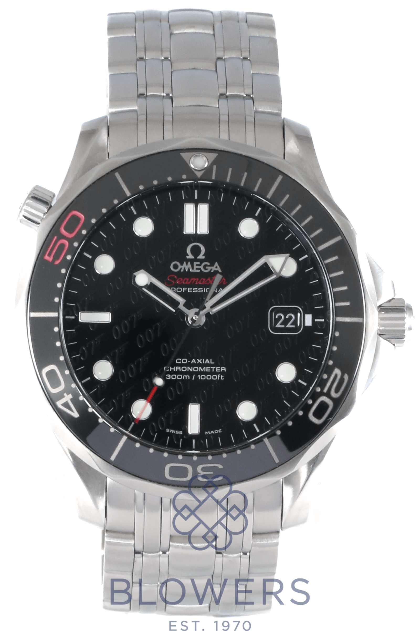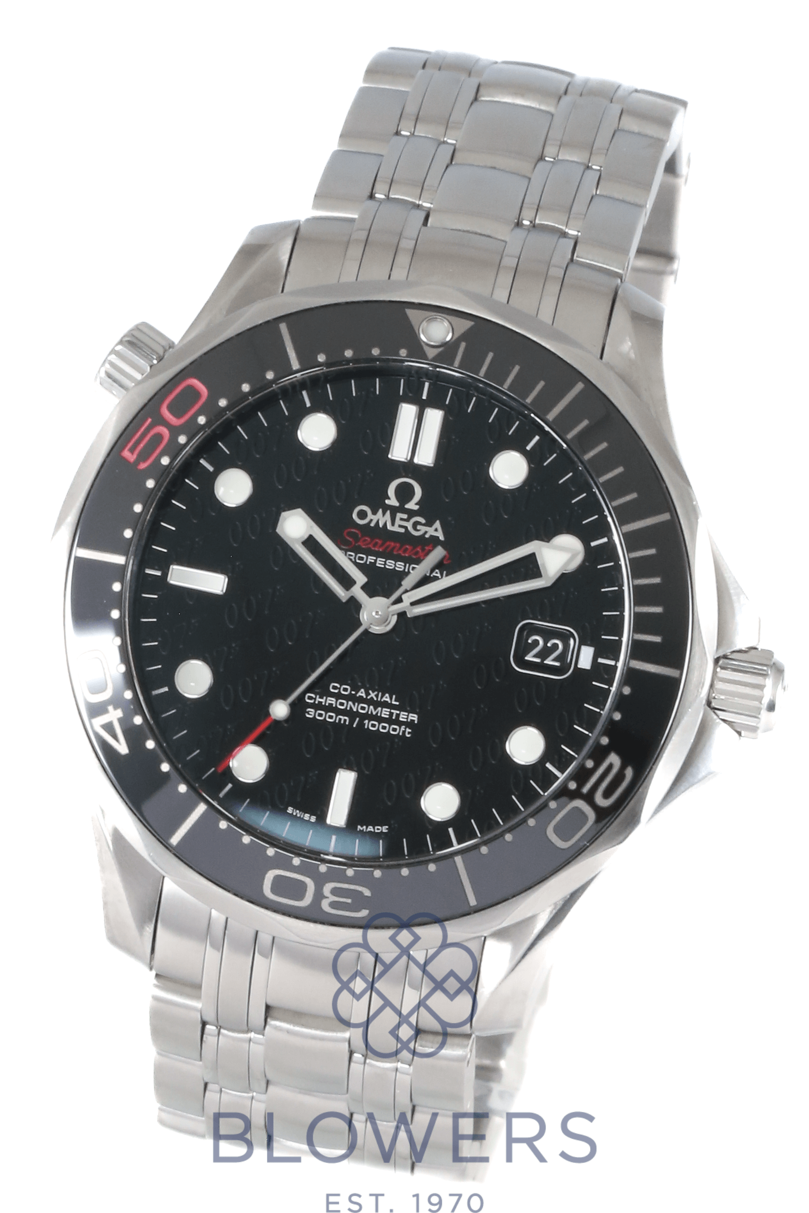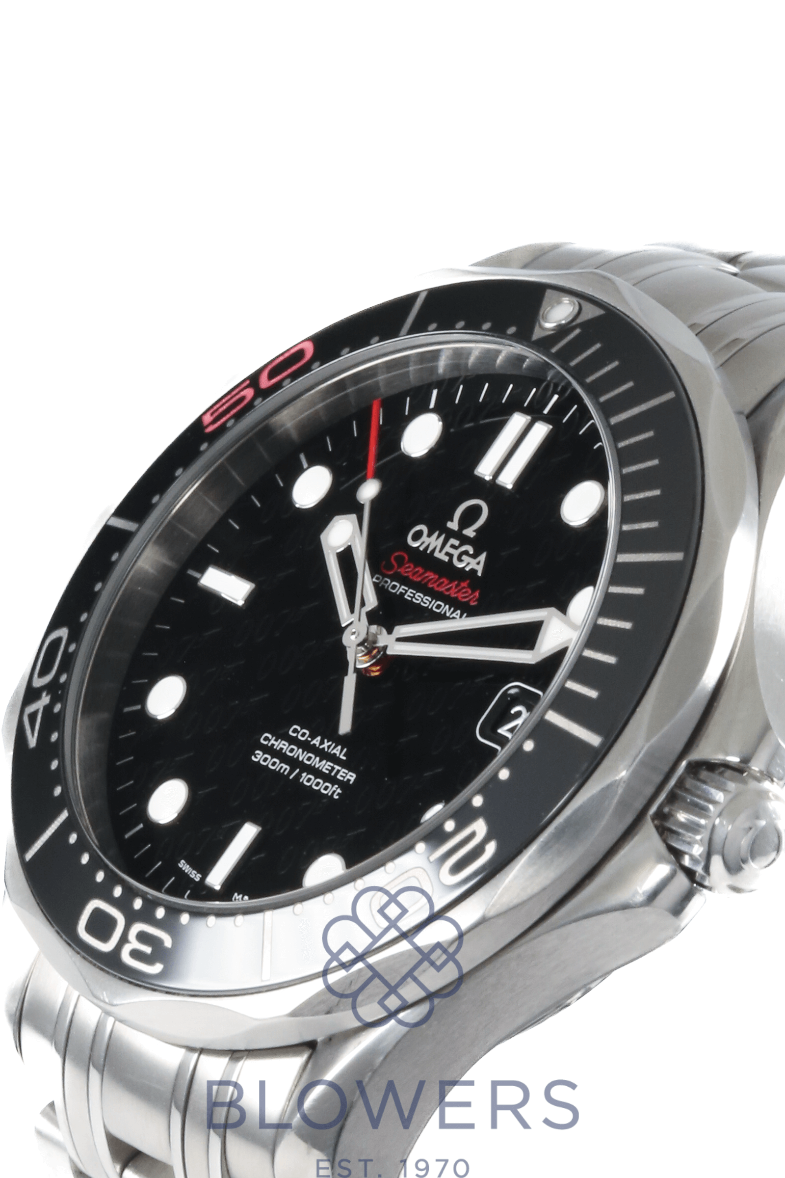 Omega Seamaster 300M Diver 212.30.41.20.01.005 Limited Edition Celebrating 50 Years Of 007. 14mm Steel Case. Calibre 2507 Self-winding Chronometer With A CoAxial Escapement And Rhodium-plated Finish. Water Resistant to 300 Meters. 48 Hour Power Reserve. Black Dial With Embossed 007 Logo. Domed scratch-resistant sapphire crystal with antireflective treatment on both sides. Features Chronometer, date, helium escape valve, screw-in crown, transparent case back. Steel Bracelet With Folding Clasp. Box And Papers Dated May 2012.