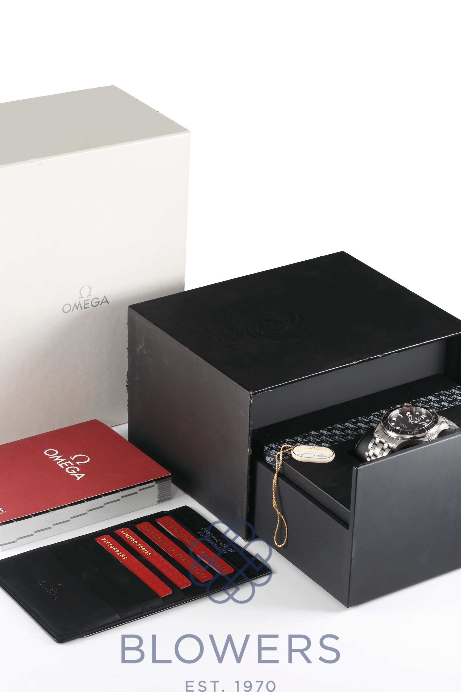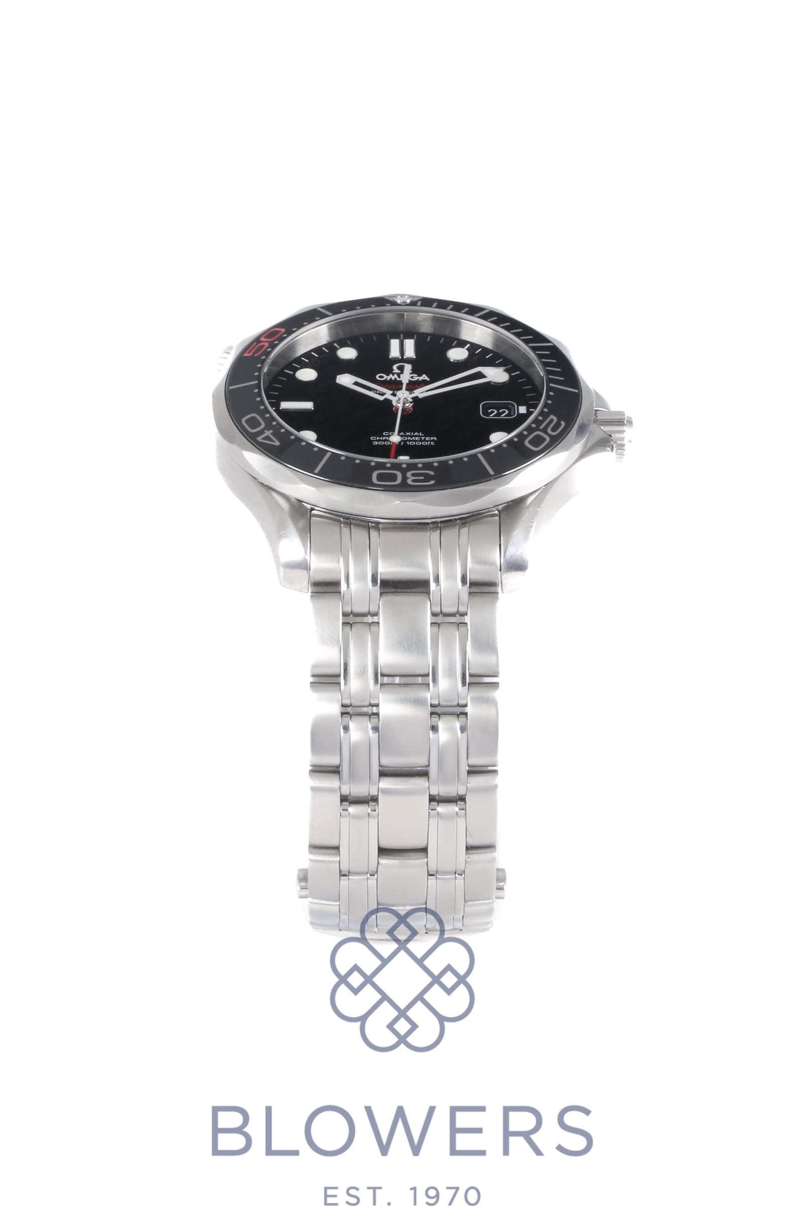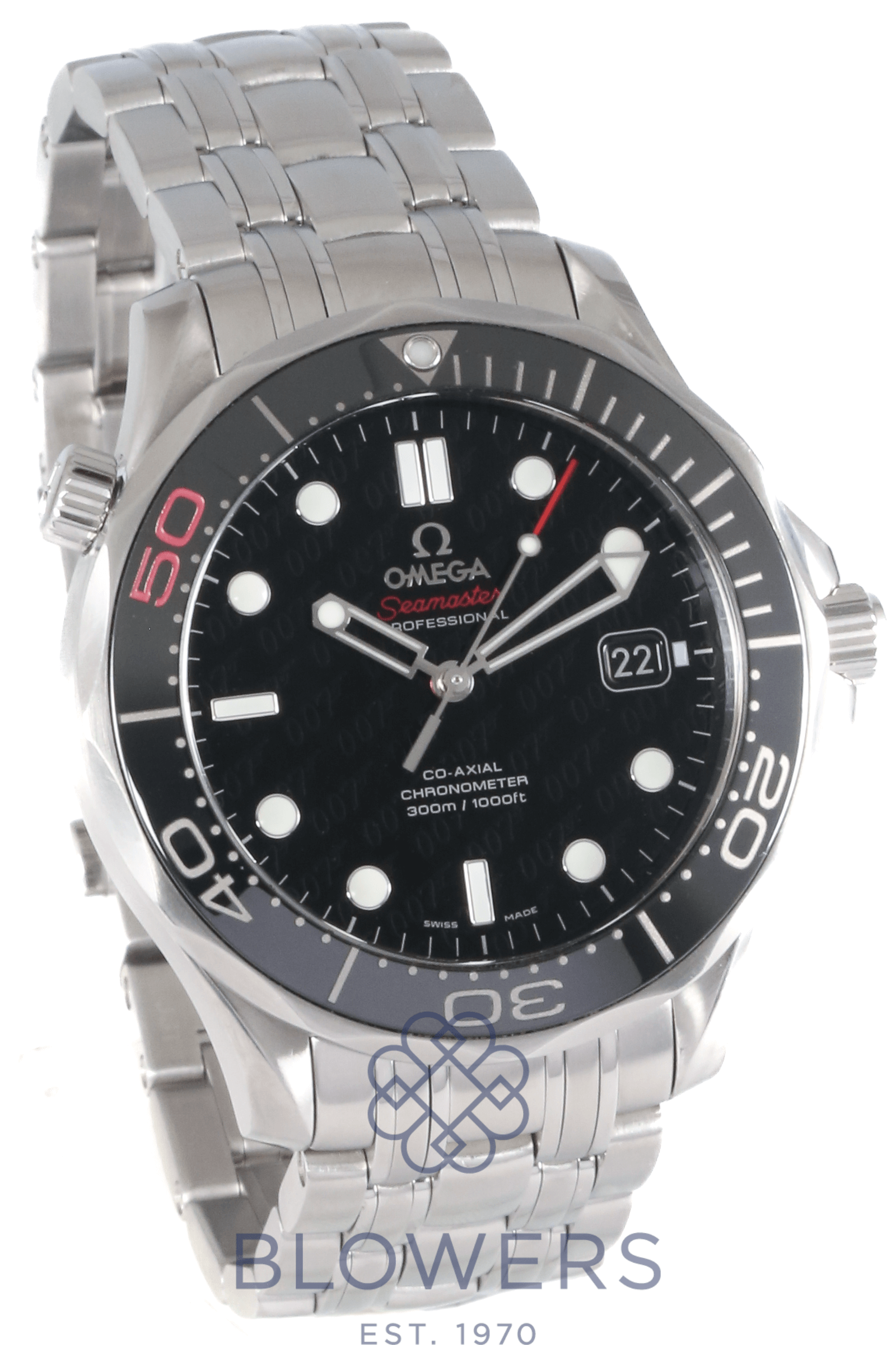 Omega Seamaster 300M Diver 212.30.41.20.01.005 Limited Edition Celebrating 50 Years Of 007. 14mm Steel Case. Calibre 2507 Self-winding Chronometer With A CoAxial Escapement And Rhodium-plated Finish. Water Resistant to 300 Meters. 48 Hour Power Reserve. Black Dial With Embossed 007 Logo. Domed scratch-resistant sapphire crystal with antireflective treatment on both sides. Features Chronometer, date, helium escape valve, screw-in crown, transparent case back. Steel Bracelet With Folding Clasp. Box And Papers Dated May 2012.